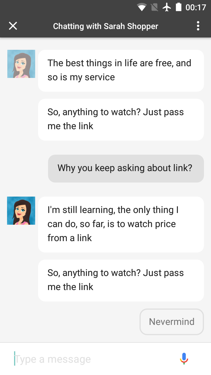 During one of the I/O 2017 talks, Google announced a bot-building competition, . are apps for Google Assistant, similar to what Skills are for Amazon Alexa. Google Actions on Google Developer Challenge Actions on Google Alexa At the time, I was building Sarah Shopper, . It was for Messenger, but since the typical interaction with the bot is fire-and-forget, making it as an action for Google Assistant seems like a good idea. I can kill two birds with one bot, why not? a price tracker bot for Amazon, IKEA and some other ecommerce I’ve had experience building bots for Messenger and LINE, so I thought it should be a straightforward “build-submit-profit” with slight platform-specific differences. Boy was I wrong. After having had my submissions rejected for a total of 12 times over the course of few weeks, these are my lessons learned: 1. Release early, but not until it’s ready The reason is, the review process can take a week. In comparison, it takes 2–3 days for Messenger and zero days for LINE. literally If you have set a certain launch date (or joining a bot competition), you better release early. Make sure your bot complies to , because if it’s rejected (and it will), you’ll need to wait again. all Actions’ policies “I don’t mind waiting for a week,” you said. Well… 2. Rejection doesn’t tell you the whole picture If you app is rejected, the rejection email won’t list down everything that’s wrong with your app. It will mention some issues, which you will fix, that you will then resubmit, and you will get another rejection. Rinse and repeat. The reviewers probably “stop on first error”, so the best way to avoid this is to comply to the policies to the dot. You don’t want to wait for another week, don’t you? So you’ve made sure everything is followed, and you start porting your Messenger bot, but then you realize that… 3. Bots can only reply Bots on LINE can push, and so does Messenger (with restrictions). On Assistant, there is no way to “return call”—you can only reply to user’s conversation. It must be within few seconds, and you can only send two chat bubbles max. It’s kind of pointless to ask Sarah Shopper to watch certain websites but the users still need to call her from time to time. The only way to give notification is through email, but… 4. Bots are not allowed to ask users their email If you do, your submission will be rejected. To get user’s email, use Google Login through . Ideally, you want to defer login only when you need it (in this case, when you need the email), but… Account Linking 5. At the moment, you can’t login mid-conversation Either you require user to log in up-front (even before saying a word to your bot) or . I don’t have the patience to wait, so I simply require my user to log in up-front. wait until the feature is implemented If only it’s that easy… 6. You need to have your own OAuth2 provider Actions on Google uses OAuth2, and so does Google Login. Let’s connect the two! The login flow would be: User summons your bot (“Talk to Sarah Shopper”) Google Assistant presents login button User logs in, which means clicking the button and choosing which Google Account to use Your bot receives your email Well, not quite. , where you can then tell your users to login to Google. You need to have OAuth2 provider your own So they click login, and click another login, and… done? Well… 7. After you’re logged in, you need to call the bot again You heard it right. I’m probably doing it wrong, but the documentation is not exactly clear. There’s another login mechanism called (it has different name depending on which part of documentation you read) Account Linking, but I haven’t managed to make it work. Seamless/Streamlined/Quick Alright. Account linked, email retrieved. Done? No, I still have my app rejected a few times. Apparently… 8. Bots must never “leave the mic open” All of your bot’s final reply must either end the session (your bot stops and user returns to Assistant) or ask what the user want next. You should also provide suggestion chips (pre-canned replies that user can tap to reply). It’s like chatting with a clingy friend. So you double-checked all conversation branches, and there’s no more open mic. Done? Well, for Sarah Shopper, you need to give her links to products you want her to watch. 9. There’s a limit on how many characters Google Assistant can accept Amazon links can be very long (around 300 chars). A reviewer gave Sarah Shopper such link, and the chat session got abruptly terminated with a vague message, “Sarah Shopper isn’t responding right now. Try again soon.” Obviously there’s nothing I can do here, so I appealed and resubmitted. 10. Don’t get too creative with names In-between submissions, I created another bot that uses . To save money, I use one of my parked domains, . Yup, the word “surprise” with “y”. Don’t ask why, it was 17 years ago(!). SSML syurprise.com Apparently, . I could have appealed, but I’ve lost my patience I just wanted it published asap. I put Syurprise Trivia instead. one-word names are not allowed I set Syurprise to be pronounced “surprise” just like Flickr is pronounced “flicker” (instead of “flick-ar”), but it was rejected because “Your name and pronunciation are too different. Your pronunciation should only differ in basic ways such as spaces, punctuation, and phonetic spelling”. I appealed. For fun, there’s an easter egg in my bot when you ask it how to pronounce its name. 11. Your bot can be published before you know it Both Sarah Shopper and Syurprise Trivia are now published. Are they? The admin console says they’re still Publishing. My wife can summon them from her Pixel phone. Maybe they just want to make me happy after weeks of waiting. Can you summon them? 12. Google does have free, human, support! This last point is actually a praise. When I received the first rejection email, I a