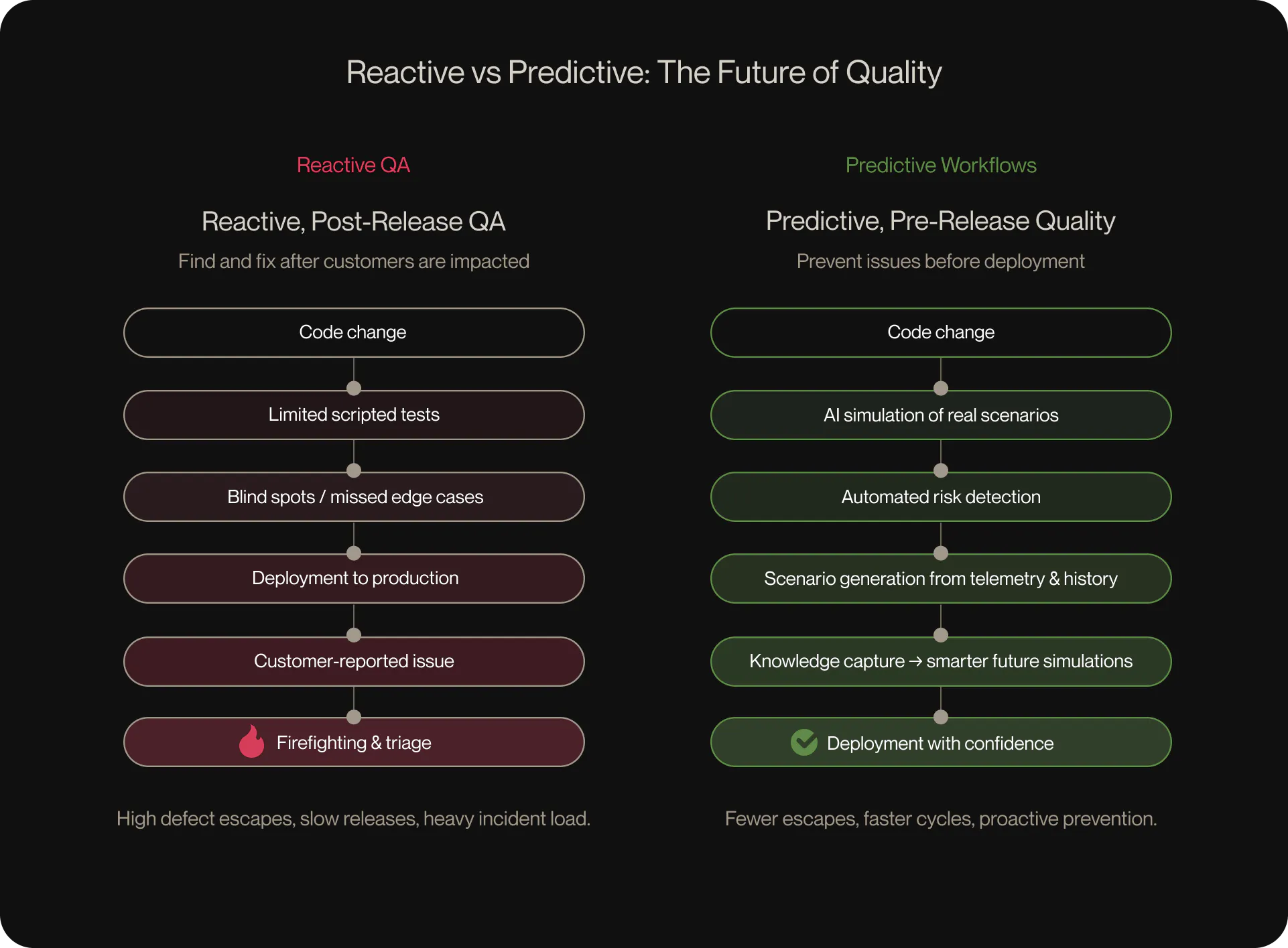 Engineering orgs still assume they must choose: move fast and risk defects, or slow down to ensure software quality. Modern reality breaks this binary. AI-generation tools multiply code output, microservices create complexity, and distributed teams increase context gaps across growing codebases. What once worked for small teams no longer holds as systems and organizations scale. As Maria Vinokurskaya, Founding Engineer (AI) at PlayerZero, puts it: "When you're early, you ship something as fast as you can, see how people react, and iterate. But as the codebase grows, the customer base grows, and more people are working on the product, that approach starts to break down — especially when teams don't have the context of older parts of the system." "When you're early, you ship something as fast as you can, see how people react, and iterate. But as the codebase grows, the customer base grows, and more people are working on the product, that approach starts to break down — especially when teams don't have the context of older parts of the system." "When you're early, you ship something as fast as you can, see how people react, and iterate. But as the codebase grows, the customer base grows, and more people are working on the product, that approach starts to break down — especially when teams don't have the context of older parts of the system." The real bottleneck isn't engineering talent or effort. It's fragmented context, institutional knowledge trapped in a few minds, and QA practices that don't scale with modern software complexity. This guide distills Maria's lessons, alongside real-world patterns from engineering teams operating at scale, into practical strategies for shipping faster without sacrificing software quality. without Why speed breaks down — and why context is the key to restoring it As software systems grow, making safe changes becomes increasingly complex. Writing code isn't the hard part. It's understanding how a change will behave across distributed systems. Maria describes this as a new failure mode created by scale. "AI is writing more code, faster. But most teams don't have tools that can efficiently test or even understand that code at the same pace," she notes. "So junk starts hitting production — not because engineers don't care, but because context doesn't scale." Complex systems make context the new bottleneck In modern architectures, even small changes ripple across services, data paths, and runtime behavior. To safely modify code, developers must understand upstream and downstream effects — but these mental models are too complex to scale across large teams. Most teams lack the tools to test and understand system-wide impact at the same pace. The only ones with enough context are senior engineers, who spend increasingly more hours investigating — becoming the de facto source of truth. This is the same expert bottleneck dynamic explored in how to scale engineering teams without scaling their problems, where a team of 50 engineers might have five true experts — and as the team grows to 250, that ratio degrades from 1:9 to 1:49. how to scale engineering teams without scaling their problems how to scale engineering teams without scaling their problems Institutional knowledge bottlenecks slow teams at every level Critical system knowledge accumulates informally. Past outages, architectural trade-offs, and edge cases live in developers' heads, turning everyday work into a series of interruptions. Because documentation can't capture how a system actually behaves, team leads and senior engineers spend hours answering the same questions: who owns a service, why an API was designed a certain way, or whether a change could trigger a known regression. Over time, this dynamic concentrates risk in a handful of people, increasing system fragility. It's also one of the core reasons legacy application modernization fails — the knowledge required to safely change or replace these systems walked out the door years ago. legacy application modernization fails legacy application modernization fails Late-stage QA testing hides real issues and stalls delivery Many organizations rely on QA as the final safety net. But as systems become more distributed, integration tests become harder to write, harder to maintain, and less representative of production behavior. The QA coverage gap is structural: the number of test scenarios teams need grows exponentially while their ability to write and maintain them grows linearly at best. The QA coverage gap The QA coverage gap need Issues rooted in missing context or incorrect assumptions surface late, leaving QA teams to catch problems after they've become expensive to fix. Eventually, testing becomes a bottleneck that delays releases and increases costs. Fragmented tools create slow, manual handoffs Investigations are rarely straightforward. Data is scattered across tickets, logs, traces, session replays, and repositories, forcing engineers to manually reconstruct what happened before they can fix the problem. This workflow increases backlog pressure and stretches resolution timelines. The more issues pile up, the less time teams have for new features and preventing future failures. It's the support triage death spiral: unplanned investigation work consumes sprint capacity, which slows delivery, which creates more defects, which creates more investigation work. See how automated root cause analysis breaks this cycle for a detailed look at the math. how automated root cause analysis breaks this cycle how automated root cause analysis breaks this cycle Four tactics to break the speed-quality tradeoff As codebases grow, services multiply, and ownership fragments, code changes faster than teams can understand its full impact. Traditional software quality approaches — manual code reviews, late-stage QA, static documentation — become reactive and incomplete. Breaking the speed-quality tradeoff requires rethinking where and how confid