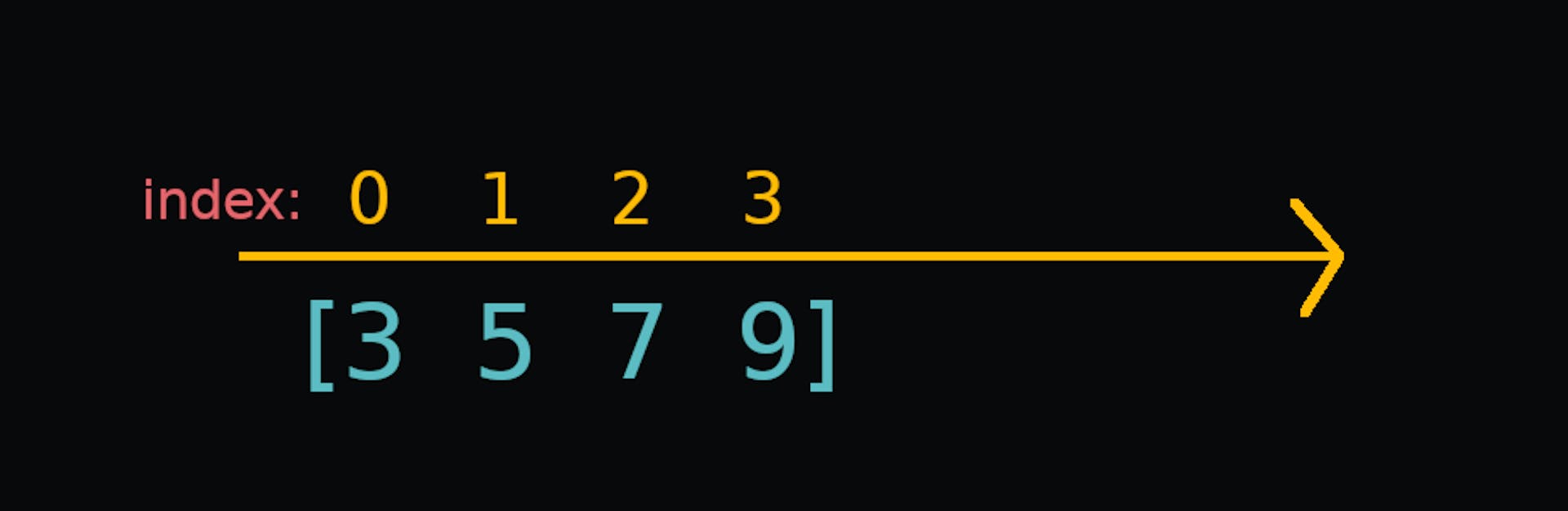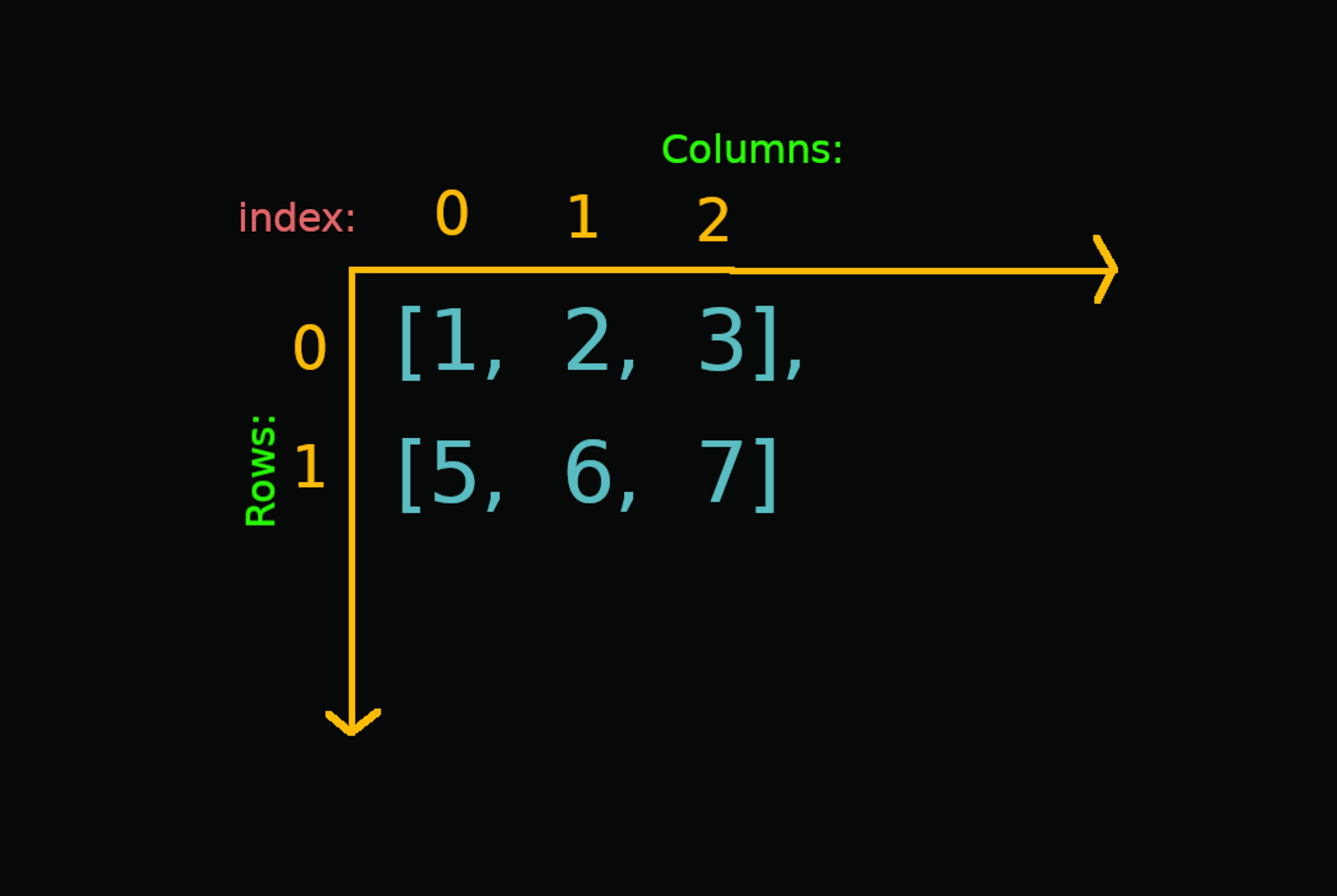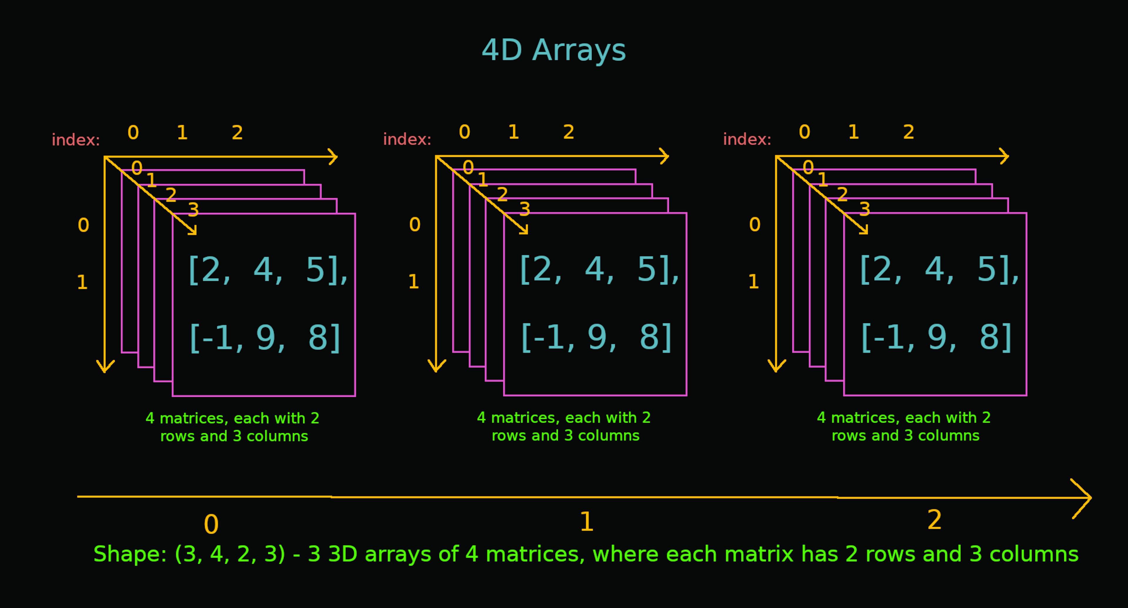 is a Python library that is mainly used to work with arrays. An array is a collection of items that are stored next to each other in memory. For now, just think of them as Python lists. NumPy NumPy is written in Python and C. The calculations in NumPy are done by the parts that are written in C, which makes them extremely fast as compared to normal Python code. Installation Make sure & are installed on your computer. Then open the command prompt or terminal and run the following command: Python Pip pip install numpy Creating Arrays using NumPy You can create a NumPy array by using the module's function as shown below: numpy array() import numpy as np arr = np.array([3, 5, 7, 9]) print(type(arr)) The output will look like this: <class 'numpy.ndarray'> We just created a NumPy array from a python list. The type of our variable is . Here stands for N-dimensional array. arr numpy.ndarray ndarray Dimensions or Axes in NumPy In NumPy, dimensions are called (plural for axis). I like to think of an axis as a line along which items can be stored. axes A simple list or a can be visualized as: 1-dimensional array We will now look at the following: Scalars (0D Arrays) Vectors (1D Arrays) Matrices (2D Arrays) 3D Arrays 4D Arrays Scalars (0D Arrays) A scalar is just a single value. import numpy as np s = np.array(21) print("Number of axes:", s.ndim) print("Shape:", s.shape) Output: Number of axes: 0 Shape: () Here we have used 2 properties of a NumPy array: : It returns the number of dimensions (or axes) in an array. It returns 0 here because a value in itself does not have any dimensions. ndim : It returns a that contains the number of values along each axis of an array. Since a scalar has 0 axes, it returns an empty tuple. shape tuple Vectors (1D Arrays) A vector is a collection of values. import numpy as np vec = np.array([-1, 2, 7, 9, 2]) print("Number of axes:", vec.ndim) print("Shape:", vec.shape) Output: Number of axes: 1 Shape: (5,) gives us the number of values in our vector, which is 5 here. vec.shape[0] Matrices (2D Arrays) A matrix is a collection of vectors. import numpy as np mat = np.array([ [1, 2, 3], [5, 6, 7] ]) print("Number of axes:", mat.ndim) print("Shape:", mat.shape) Output: Number of axes: 2 Shape: (2, 3) Here we created a 2x3 matrix (2D array) using a list of lists. Since a matrix has 2 axes, tuple contains two values: the first value is the number of rows and the second value is the number of columns. mat.shape Each item (row) in a 2D array is a vector (1D array). 3D Arrays A 3D array is a collection of matrices. import numpy as np t = np.array([ [[1, 3, 9], [7, -6, 2]], [[2, 3, 5], [0, -2, -2]], [[9, 6, 2], [-7, -3, -12]], [[2, 4, 5], [-1, 9, 8]] ]) print("Number of axes:", t.ndim) print("Shape:", t.shape) Output: Number of axes: 3 Shape: (4, 2, 3) Here we created a 3D array by using a list of 4 lists, which themselves contain 2 lists. Each item in a 3D array is a matrix (1D array). Note that the last matrix in the array is the front-most in the image. 4D Arrays After looking at the above examples, we see a pattern here. An n-dimensional array is a collection of n-1 dimensional arrays, for n > 0. I hope that now you have a better idea of visualizing multidimensional arrays. Accessing Array Elements Just like Python lists, the indexes in NumPy arrays start with 0. import numpy as np vec = np.array([-3, 4, 6, 9, 8, 3]) print("vec - 4th value:", vec[3]) vec[3] = 19 print("vec - 4th value (changed):", vec[3]) mat = np.array([ [2, 4, 6, 8], [10, 12, 14, 16] ]) print("mat - 1st row:", mat[0]) print("mat - 2nd row's 1st value:", mat[1, 0]) print("mat - last row's last value:", mat[-1, -1]) Output: vec - 4th value: 9 vec - 4th value (changed): 19 mat - 1st row: [2 4 6 8] mat - 2nd row's 1st value: 10 mat - last row's last value: 16 NumPy arrays also support slicing: # continuing the above code print("vec - 2nd to 4th:", vec[1:4]) print("mat - 1st rows 1st to 3rd values:", mat[0, 0:3]) print("mat - 2nd column:", mat[:, 1]) Output: vec - 2nd to 4th: [4 6 9] mat - 1st row's 1st to 3rd values: [2 4 6] mat - 2nd column: [ 4 12] In the last example, says "get 2nd value from all rows". Hence, we get the 2nd column of the matrix as the output. [:, 1] Example: Indexing in a 4D Array Let's say we want to access the circled values. It is located in . It's a lot so take your time. the 2nd 3D array's last matrix's 2nd row's 2nd column Here's how to access it: arr[2, -1, 1, 1] Python vs. NumPy At the beginning of the post, I said that calculations in NumPy are extremely fast compared to normal Python code. Let's see the difference. We will create two lists with 10 million numbers from 0 to 9,999,999, add them element-wise and measure the time it takes. We will convert both lists to NumPy arrays and do the same. import numpy as np import time l1 = list(range(10000000)) l2 = list(range(10000000)) sum = [] then = time.time() for i in range(len(l1)): sum.append(l1[i] + l2[i]) print(f"With just Python: {time.time() - then: .2f}s") arr1 = np.array(l1) arr2 = np.array(l2) then = time.time() sum = arr1 + arr2 print(f"With NumPy: {time.time() - then: .2f}s") Output: With just Python: 2.30s With NumPy: 0.14s In this case, NumPy was 16x faster than raw Python.