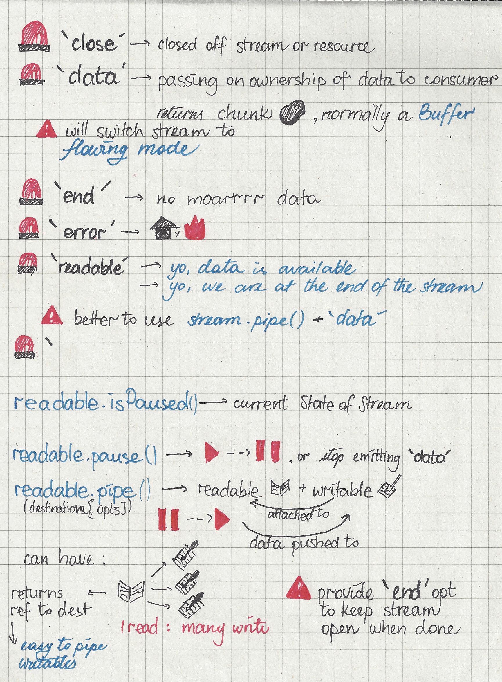🙈 🙉 🙊. Edit: part 2 has also been published I would like to introduce you to streams. In a sketch notes medium. On medium dot com. node.js Sooooooooo, at some point last weekend I was reading through , started writing all those heaps of knowledge down, and voilà this tweet was born: node’s streams documentation As you can surely tell, my 4 year old phone camera is not made for taking any kind of pictures in the year 2016 of our lord (but it was great in 2012, I swear). This post contains a scanned (wow, scanners are still a thing, you say \o/) version of the aforementioned docs. As part 1 of the series, I am noting the basics of readables && , and their respective APIs. Stay tuned for the notes on implementing these lil things! writables You can now also read through . Edit: part 2 of these sketchnotes what are streams even; and a lil’ intro to writables writables writables writables writables; i did say writables, right? wowowoow readables got modes readable API and Events! readables! Continued! As a friendly wave, want to remind you these are , so I advise you to look at the for a more detailed examples of the way a certain method works. sketch notes documentation Thanks for reading through, yo; you’re dope 💯.