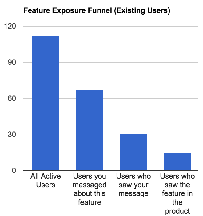 This is an essay I wrote while consulting for Sysdig , an awesome container-native monitoring platform. Theoretically, new features should help users derive more value from a product. There are countless ways they can do that. A feature could help power users take advantage of more advanced functionality, or a feature could help new users understand the basics of the product. Despite those differences, the approach to measuring how they impact product usage is similar. I like to break down my analysis into 3 different categories: exposure, usage, and retention. Exposure: quantifies the number/percentage of users who actually saw and used the feature. Usage: determines how those people interacted with the feature. Retention: looks at the impact the feature might have on long-term usage of the product. Exposure and Usage analysis can usually occur within a week of launch, but Retention will take much longer (often months) to really understand. I’ll explain how to approach each category below with broad enough strokes that should apply to any kind of feature. Exposure Someone can’t use the feature you just poured days, if not weeks or months, of effort into if they don’t know about it. And no, publishing a blog post about the feature is not enough. Most of your users don’t read your blog. Unfortunately, feature discovery is often ignored even though it’s quite easy to do. But that’s a topic for another post, so I won’t go into how to do that here. Exposure is basically a ratio of the number of people who saw the feature in your product over the number of people who would be interested in the feature (relevant users). The kind of feature you’re trying to measure dictates how you measure exposure. In general, features are targeted at users, users, or users. The denominator is the only thing that changes for each type of feature. new existing potential In order to count in the numerator of this calculation, a user must open your app and see the screen on which they would use the feature in your app. Viewing an email or blog post is not enough since people can open that content without actually reading it, but they’re less likely to do that in your app. If the feature is a small part of an existing, cluttered screen, I would draw their attention to it using a or something similar and count interactions with that tooltip as views of the feature. Of course, anyone who interacts with the feature counts as a user who saw the feature. tooltip Features for New Users A new onboarding flow wouldn’t be used by your existing users, and you probably don’t want to tell new users about it either. Yet exposure is still relevant here. It’s main purpose is sanity-checking your expectations. Regardless of the size of the feature (whole new onboarding flow vs. changing one aspect of it), you still want to make sure your expectations line up with reality in terms of the number of people who see the feature. If you just shipped a new onboarding flow, you might expect 100% of users to use it, however, that might not be the case if users can skip or exit the flow. In other words, exposure for features targeted at new users will identify gaps in your product’s path to an a-ha moment. Features for Existing Users These features should help your existing users derive more value from your product, but users can’t unlock that value without about and using the feature. You can think of this process as a funnel. You start with a set of users that will benefit from this feature. Hopefully, that includes all users, but it may not. Then you tell them about the sweet new feature you built and hope they use it. learning Obviously, some users may not see your communications and still find the feature, so the funnel may not have a perfect descending order. The overall exposure measure for a feature can be simplified by just looking at the first and last steps of the funnel: Features for Potential Users The final category of feature is for users that looked at your product but claimed they weren’t interested because it was missing x feature (you’re keeping track of this, right?). For these features, you want to make sure you reach out to everyone who requested them and then track how many actually come back to the product and try the feature. Again, a funnel works well here: Usage You may think usage analysis is where we find out how useful/awesome the feature is, but it’s hard to quantify value soon after a feature has launched (What is value? More time in the product? Less, but more efficient, time in the product?). Therefore, we wait until the retention category of analysis to assess the value of a feature. Usage is an intermediary step to calculating value where the goal is . This should give some indication of the usefulness of a feature. learning how people interact with a feature What we want to learn here is whether people engaged with the feature in the way it was intended or not. In other words, how did the design and implementation perform? You can start by looking generally, but you’ll probably want to trace individual user actions to discern what path certain users took. Exploratory analysis is a big part of this. This analysis is pretty feature-dependent, so you’ll have to make a subjective call on how to look at the data. Here are some of the methods you might use along with what they are good at: Funnels: charting user progress from viewing a feature to successfully completing usage of that feature (success can be events like creating an alert/dashboard or receiving a notification in Slack) Trees: tracing user movement through your app (each node represents the number of people who completed each step) Bar Charts: comparing the popularity of different options Line Charts: displaying change in behavior over time (are more people using the feature over time) Once you’ve made some charts and identified some areas of interest, dig into those. Are users running into any errors? Are