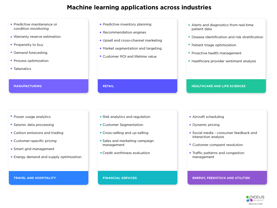 , the total number of deals reached 91 globally, with the entire business value of 16.9 billion dollars. According to , 100,000 legal positions will be automated by 2036. So, automation and machine learning will make a huge difference and change the way how we work. Last year machine learning Deloitte Do you want to know what benefits ML can bring your organization? of companies with at least $500M in sales brought such statistics: Survey 76% of leaders share their experience that they got higher sales growth by using machine learning. New helped them to predict better user preferences and behavior, optimize processes, lead up-sell and cross-sell. technology More than 50% of enterprises are applying machine learning to refine marketing issues. 38% believe ML allowed them to gain better sales performance metrics. A few European banks have already improved new product sales by 10% while decreasing churn 20%. A recent McKinsey study figured out that a lot of European banks shifted from statistical modeling approaches to ML. It helped them to refine customer satisfaction. Today’s Value of Machine Learning the engineer at Facebook, says that most tech companies build their strategies around AI and machine learning. For example, Uber is actively applying ML for various purposes. Catherine Dong , machine learning Data is the accelerator for our information-based society with extremely fast speed. That’s why new tech specialists and machine learning techniques are in a huge demand to cope with the new wealth of information in large and difficult systems. At , our scientists and Big Data developers help enterprises all over the world discover data analytics to gain valuable insights. We have 6 years of experience and know how to apply it to reach better goals and do more with less. Diceus Use Cases of ML An e-commerce application may apply ML to track and understand customer conversation connected to a product. It may even apply the algorithm to predict the functionality and features expected by the clients. Moreover, an enterprise may use machine learning to build better relationships with their customers. The machine learning algorithm may easily dissect the customer queries, and send the request to the relevant team. It will speed up the process of solving the clients’ problems and bringing them answers very fast. While creating e-commerce applications, the developers may use machine learning to allow clients finding products quicker. Specific machine learning algorithm helps to ensure that customers get relevant and quality information on time. Besides, new technology helps clients select products according to their needs and preferences. The e-commerce platform may apply ML to make the clients surf only relevant services and products. Machine learning brings a lot of personalization to the customers and helps to target company’s efforts. For instance, Facebook mixes statistical analysis and predictive analytics to find patterns based on data. It helps to personalize the newsfeed, suggest interesting content, posts, improve user engagement. Also, Facebook uses neural networks to scan images and suggest members to tag in the picture. Netflix used machine learning to save $1 billion by the personalization of movies and TV shows to the subscribers. Additionally, ML may be used to detect spam. Earlier, email service providers took advantage of rule-based techniques to sort out spam. Nowadays, spam filters are now developing new rules by applying neural networks for these purposes. PayPal applies at least 3 machine-learning approaches to eliminate risk and fraud. Hello Barbie may successfully communicate with children by using machine learning and advanced analytics, natural language processing. A microphone records, the speech is analyzed to find a needed response from 8,000 variations in under a second. Another example is IBM’s machine learning system, Watson, that learned Gaudi’s work and his work involving Barcelona, song lyrics. Watson consumed all data and brought inspiration to the human artists who needed to create a sculpture in the style of Gaudi. may be used in the financial industry to create automated trading strategies. It can be used to recognize patterns and make trading decisions, based on data. The other potential applications are creating credit rating mechanisms by searching patterns of external, internal, and economic factors that influence the financial performance of organizations. Similarly, these techniques may be applied as well to bring relevant automated investment advice to the customers. Deep learning So, machine learning helps business to personalize their cooperation with the audience, improve sales and suggest only relevant content. By using new technologies, company earn better and save money, make data-driven decisions. Moreover, ML algorithms help to exclude risks and fraud, ensure totally secure processes and refine customer satisfaction.