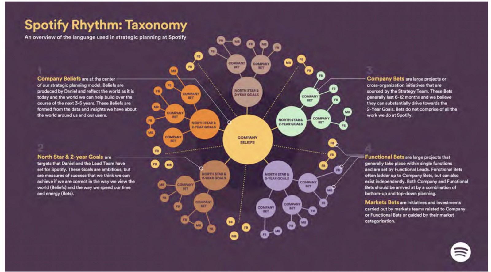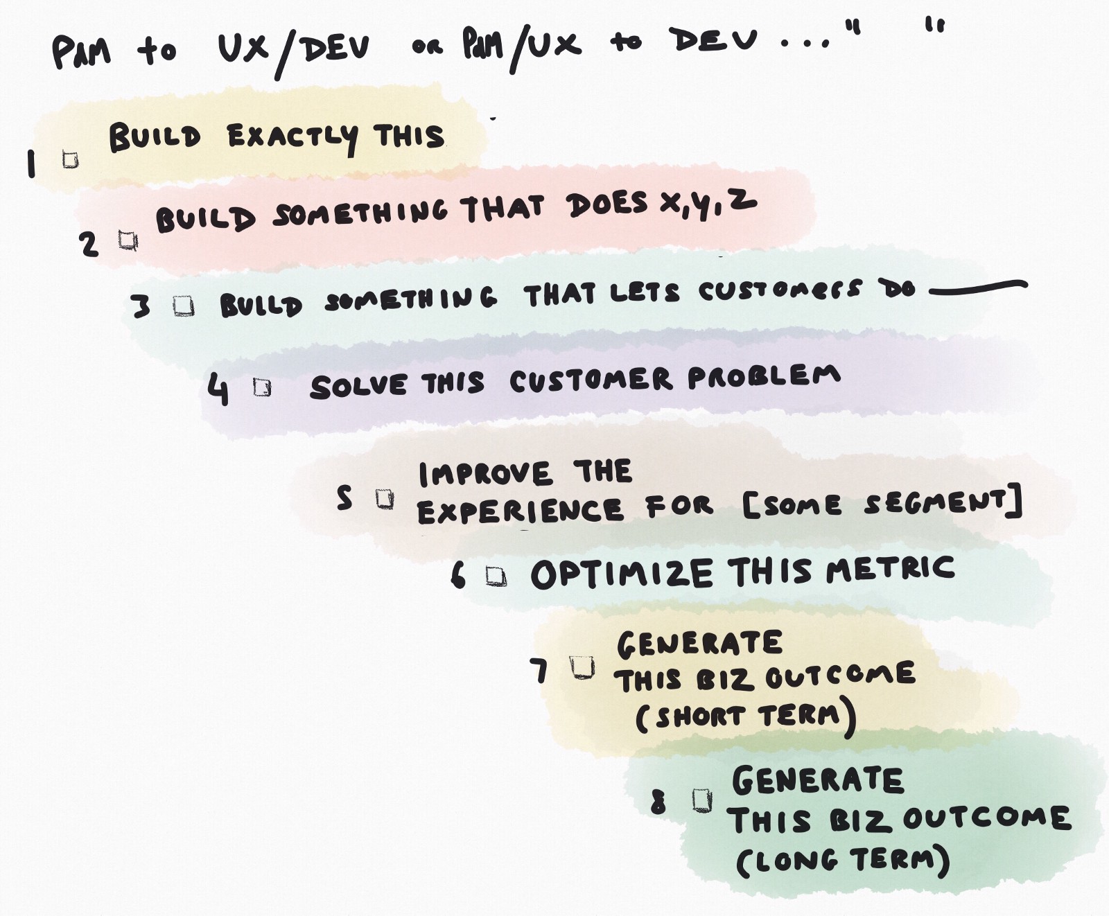 Consider a range of for a product development team: mission-types (or mission scopes) Build exactly this Building something that does [some operation, some workflow] Building something that lets customers do [some task] Solve this customer problem Improve the experience for [some segment of users/customers] Optimize this metric Generate this short-term business outcome Generate this long-term business outcome I often meet with teams/individuals that are eager to be more “outcome oriented” (3/4+). The reasons vary, but center mostly on 1) the belief that it will create better outcomes for the business, 2) that “the business” somehow doubts or diminishes their expertise and just chases success theater, and 3) the desire for more challenging, impactful, and intellectually rigorous work. “Outcomes vs. Outputs” has become a rallying call for consultants, individuals, and teams alike. What’s not to like, right? The other day I asked a team in this situation whether they would undertake a “Build exactly this…” effort if they knew it was going to be beneficial to the business. Of course we would! But…(all the reasons that never happens) Which got me thinking. You have to divide the issue. How does the company: make the ? best product decisions possible connect those product decisions to a ? coherent high-level product strategy — connect even the most prescriptive work/actions all the way up to high-level business results (essentially “walking the tree” from 1 to 8 above)? show real impact Prescriptive or not, did it work? and nested bets/assumptions. Namely, address the fact that most “problems” (even very open ended goals like 6 “Optimize this metric”) are in themselves solutions to higher level problems/goals? Are there fundamental bets which are beyond question…at least in the near/mid term? talk about uncertainty employees both in terms of linking their work to real impact AND allowing them to flex from a career perspective by enjoying more autonomy, flexibility, and room for creativity? engage These are important distinctions because many organizations lack the ability to link non-sales related to impacts and/or larger strategic bets, let alone to empower front-line teams to deliver outcomes. Even sales targets are in “service” to short-term business outcomes (not long term viability of the business, the mission, etc.). Additionally, there is zero awareness on the part of teams — or most staff, even — about the higher level assumptions and “bets” driving more prescriptive near-term goals and how it all “fits together”. anything So…the issue is way beyond “empowering” teams (though that is important). Sometimes product teams will need to build “exactly this”… then what? Consider the spectrum here ranging from 1–3 hour tasks to 3+ year foundational bets for the company. Before talking about whether Team A should be given a rough mockup, or be tasked with doing their own research, you should probably map these horizons for your company. How does it all fit together? Because even if Team A is tasked with “solving this customer’s problem” (4), you’ll still need a way to connect it to short and long-term business outcomes. If you can’t, you’re just getting bogged down in a theoretical discussion on team autonomy and whether it leads to a subjectively better near-term, lower-level outcome. (This is why the “outcomes vs. outputs” discussion tends to stall, and settle on generating some short-term customer “outcomes”). Here’s another take on a “bet graph” from ’s : Henrik Kniberg Spotify Rhythm talk This type of coherence is rare when focusing on near-term outcomes only. A great example of the problem is how OKRs (objectives and key results) are commonly perceived by individuals and front-line teams. Near-term goals are almost by definition more prescriptive, even when stated as quantitative “results”. When I ask front-line folks — product teams especially — about their OKRs, I invariably hear something like: These are all well and good, but I don’t know how this all fits into the bigger picture. What we’re doing now is laying the groundwork for success in future quarters and years. And what about the goals these tie into beyond this quarter? Are people held accountable for whether those things work out? Or do they wipe the strategy slate clean every year and start over? How do we hold ourselves accountable to measuring whether the strategy is actually working? Hitting the OKR is . Knowing that hitting the OKR will drive some future outcome that is 1) impactful for the business, AND 2) meaningful for the employee is vitally important, and something lost in various incantations of MBO (management by objectives). Why? Without the underlying coherent story — spanning multiple time horizons — the OKRs are just a process hoop, and without “closing the loop” there is no learning: not enough Does anyone ever go back and check whether hitting the OKRs made any difference? Or for that matter, when we build stuff — either taking orders, or coming up with it ourselves — do we ever go back and review our decisions? Really, it’s the that matters, as : CONTEXT Spotify noticed when they shifted away from OKRs on the individual level We noticed that we were putting energy into a process that wasn’t adding value. So we decided to ditch it and focus on context and priorities instead. We make sure everyone knows exactly where we are going and what the current priorities are, and then we let the teams take responsibility for how to get there. What I think I’m getting at with this post is that “outcomes over outputs” or “evidence-driven development” or “beat the Feature Factory” sounds great. It really does. I personally believe that teams tasked with generating outcomes (vs taking tickets) are more likely to generate positive outcomes for themselves, their business, their customers, 