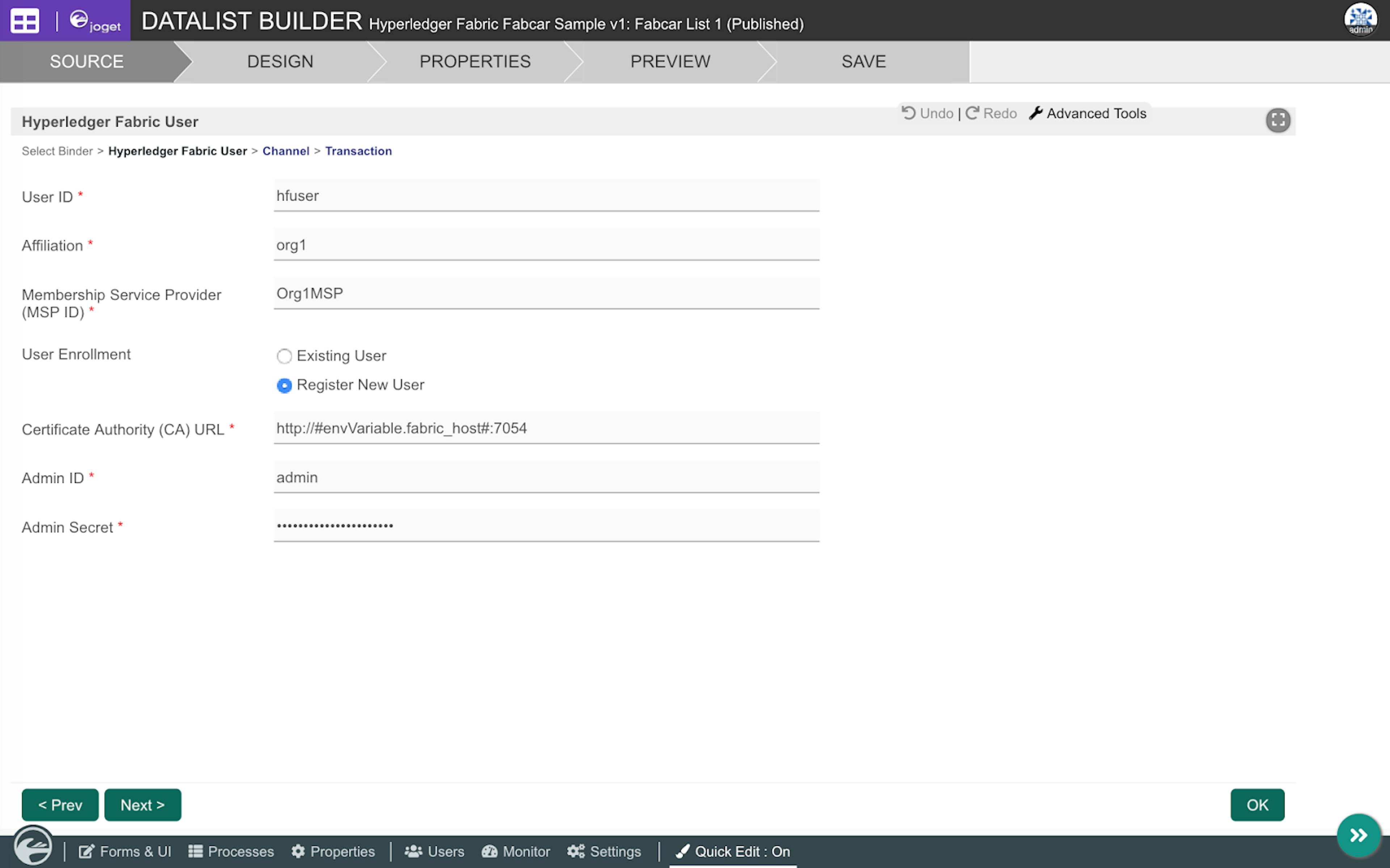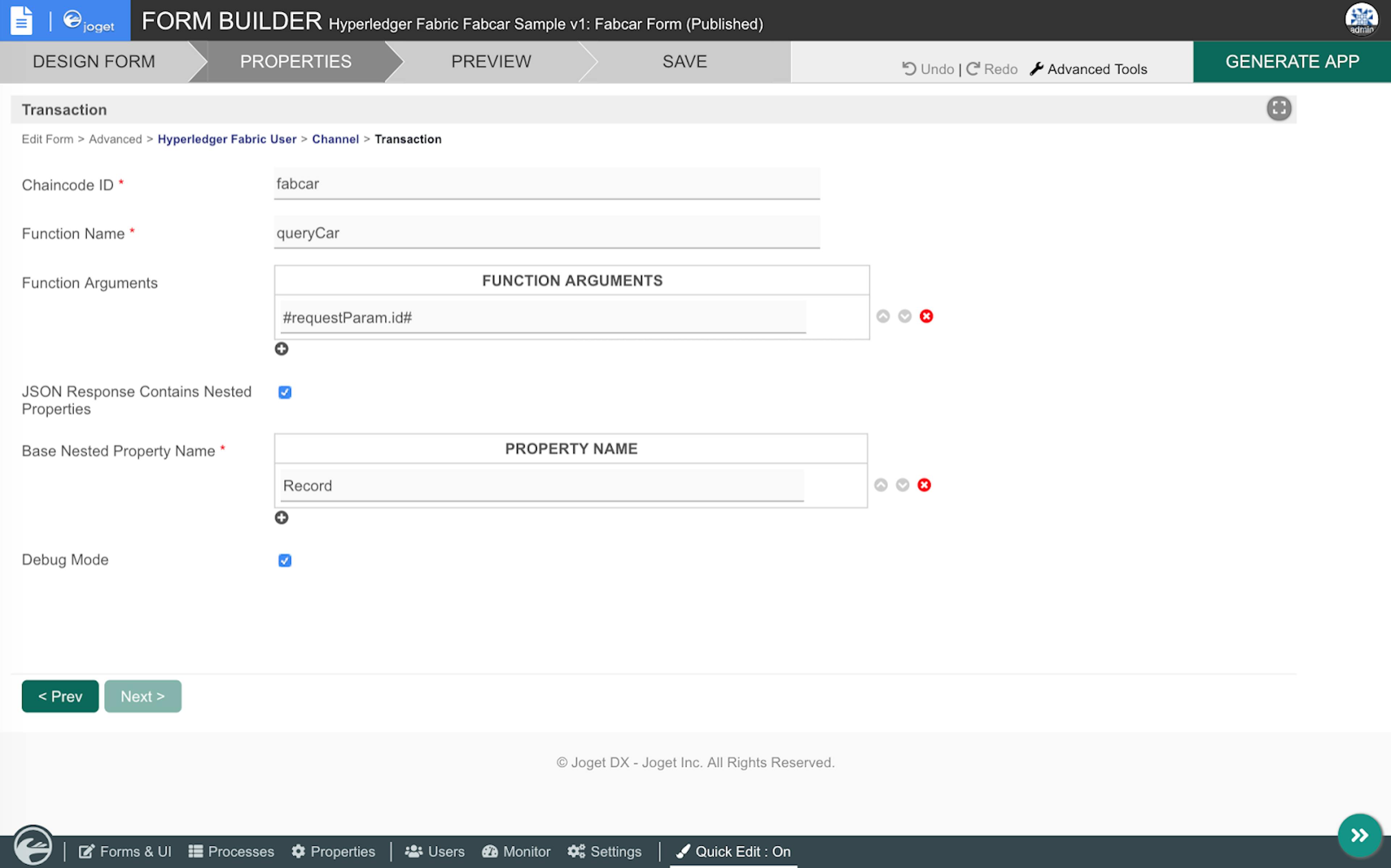 1. Introduction is an open source low-code/no-code application platform for faster, simpler digital transformation. In this article, we will look at using a no-code approach to integrating , specifically a network, into a full-fledged web application. Joget blockchain technology Hyperledger Fabric 1.1 Blockchain and Digital Ledger Technology (DLT) In recent times there have been many predictions on , transforming everything from banking to supply chains and even government. Even if you are not familiar with the term, you would probably have heard of the rise of cryptocurrency like which utilizes blockchain technology. So what exactly is a blockchain? blockchain technology revolutionizing the world Bitcoin To start, it’s best to understand a broader term called . DLT is simply a decentralized database, where data is stored by a network of computers with no central authority. is a specific type of DLT, where records in the network are linked using cryptography and cannot be changed. This lends itself to solving problems where there are issues with trust and inefficiencies due to centralized authorities. digital ledger technology (DLT) Blockchain There are many blockchain implementations, which are broadly categorized as either . Permissionless blockchain networks are essentially public so anyone can participate, while permissioned ones are for restricted private use. Permissionless networks work well for public areas such as cryptocurrencies, but in an enterprise environment and in many industries, private networks are essential. permissionless or permissioned Enterprise blockchain networks might typically span across multiple organizations across an entire industry. With the need for permissioned private networks and participation by multiple organizations, how would a blockchain solution gain enough adoption to succeed? This is where Hyperledger comes in. 1.2 Hyperledger and Hyperledger Fabric is a not a company, nor a specific product, but rather an umbrella of blockchain projects for enterprise use cases. Hosted by the with more than 250 participating organizations, the projects are divided into frameworks and tools. Frameworks are different implementations of blockchain technology, each of which has different strengths for different use cases. Tools, on the other hand, are utilities to help manage or complement the frameworks. Hyperledger open source Linux Foundation The most popular and mature framework currently is . Originally contributed by IBM, Fabric is emerging as the de-facto standard for enterprise blockchain platforms, with commercial implementations and support from major vendors including IBM, Oracle and SAP. Hyperledger Fabric 1.3 Hyperledger Fabric Concepts If you are new to blockchain technology, there are quite of lot concepts to learn and understand. For the purpose of this sample app, here are some of the more important terms that are used to configure the blockchain integration. is a journal of all transactions and data that are stored in a distributed network. Blockchain ledger are the network components where copies of the blockchain ledger are hosted. Peer nodes are organizations that are part of the blockchain network Members issues certificates to identify users that belong to an organization. Certificate Authority (CA) maps certificates to member organizations. Membership Services Provider (MSP) are requests to read or write data into the ledger Transactions are nodes that orders transactions into a block to be written into the ledger Ordering service are private communication mechanisms to keep confidentiality between members in the network. Channels (called chaincode in Fabric) are code within the blockchain network that are invoked to query or update the ledger Smart contracts The diagram provided by the Hyperledger Fabric project below shows how an application integrates with a blockchain network via smart contracts: More details are available in the . Hyperledger Fabric documentation 2. Overview of the App To demonstrate the incorporation of blockchain technology in an app, let’s design a Joget app that makes use of the provided by Hyperledger Fabric. The Fabcar sample is basically a minimal stripped-down Fabric network for learning purposes. sample Fabcar network To demonstrate reading from and writing to the blockchain network, the app supports the following use cases: Query and list of all records from the blockchain network Query and view a specific record from the blockchain network Write a new record into the blockchain network after an approval process With Joget, the blockchain app can be developed without coding. A form is visually designed, after which the App Generator is used to quickly create a full working app. The integration to the Hyperledger Fabric blockchain network is then accomplished by simply configuring a set of Joget Hyperledger Fabric plugins. To install and try out the final working app: Ensure that a Hyperledger Fabric sample Fabcar network is up and running. Ensure that an instance of is up and running. Joget Enterprise Edition Download the , and upload the downloaded jar file through under System Settings. Hyperledger Fabric Plugins JAR file Manage Plugins Download the and it. Joget jwa app import Configure the to point to the appropriate IP/hostname. fabric_host environment variable the app and access it from the . Publish App Center Here are some screenshots of the app in action: Welcome: Home page Fabcar Listing: List of all records from the blockchain network Fabcar Form: View specific record from the blockchain network Approval Process: Approve a creation of a new record The next few sections provide more detailed information to setup the sample Hyperledger Fabric network, as well as to develop and configure the app. 3. Install and Setup a Hyperledger Fabric Network To begin, install Hyperledger Fabric v1.3 and the Fabcar Network Sample. The summarized installation steps below were tested on Ubuntu 18.04. 3.1 Install
