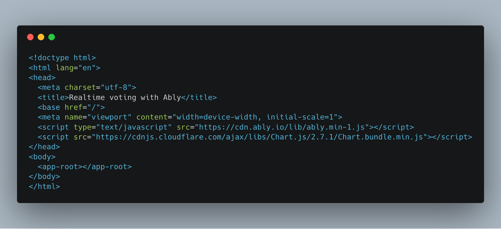 Now within the index.html file inside src folder, add two scripts each for Ably and Chart.js, as shown below: