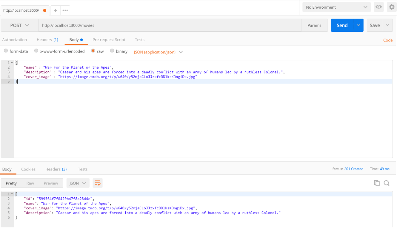 In this tutorial I will illustrate how you can build your own in and . All the code used in this demo can be found on my . RESTful API Go MongoDB Github 1 — API Specification The will expose endpoints to manage a store of movies. The operations that our endpoints will allow are: REST API service 2 — Fetching Dependencies Before we begin, we need to get the packages we need to setup the API: go get github.com/BurntSushi/toml gopkg.in/mgo.v2 github.com/gorilla/mux : Parse the configuration file ( server & credentials) toml MongoDB : Request router and dispatcher for matching incoming requests to their respective handler mux : driver mgo MongoDB 3 — API structure Once the dependencies are installed, we create a file called “ “, with the following content: app.go The code above creates a controller for each endpoint, then expose an on port . HTTP server 3000 Note: We are using , , , and where appropriate. We are also defining parameters that can be passed in GET POST PUT DELETE To run the server in local, type the following command: go run app.go If you point your browser to , you should see: http://localhost:3000/movies 4 — Model Now that we have a minimal application, it’s time to create a basic model. In , we use keyword to create a model: Movie Go struct Next, we will create the to manage database operations. Data Access Object 5 — Data Access Object 5.1 — Establish Connection The method as its name implies, establish a connection to connect() MongoDB database. 5.2 — Database Queries The implementation is relatively straighforward and just includes issuing right method using object and returning the results. These methods can be implemented as follows: db.C(COLLECTION) 6 — Setup API Endpoints 6.1 — Create a Movie Update the method as follows: CreateMovieEndpoint It decodes the request body into a object, assign it an , and uses the method to create a in database. movie ID DAO Insert movie Let’s test it out: With : Postman With cURL curl -sSX POST -d ‘{“name”:”dunkirk”,”cover_image”:” ", “description”:”world war 2 movie”}’ | jq ‘.’ https://image.tmdb.org/t/p/w640/cUqEgoP6kj8ykfNjJx3Tl5zHCcN.jpg http://localhost:3000/movies 6.2 — List of Movies The code below is self explanatory: It uses method of to fetch list of movies from database. FindAll DAO Let’s test it out: With : Postman With : cURL curl -sSX GET | jq ‘.’ http://localhost:3000/movies 6.3 — Find a Movie We will use the library to get the parameters that the users passed in with the request: mux Let’s test it out: With : Postman With : cURL curl -sSX GET | jq ‘.’ http://localhost:3000/movies/599570faf0429b4494cfa5d4 6.4 — Update an existing Movie Update the method as follows: UpdateMovieEndPoint Let’s test it out: With : Postman With : cURL curl -sSX PUT -d ‘{“name”:”dunkirk”,”cover_image”:” ", “description”:”world war 2 movie”}’ | jq ‘.’ https://image.tmdb.org/t/p/w640/cUqEgoP6kj8ykfNjJx3Tl5zHCcN.jpg http://localhost:3000/movies 6.5 — Delete an existing Movie Update the method as follows: DeleteMovieEndPoint Let’s test it out: With : Postman With : cURL curl -sSX DELETE -d ‘{“name”:”dunkirk”,”cover_image”:” ", “description”:”world war 2 movie”}’ | jq ‘.’ https://image.tmdb.org/t/p/w640/cUqEgoP6kj8ykfNjJx3Tl5zHCcN.jpg http://localhost:3000/movies Taking this further ? On my upcoming posts, I will show you how : Write in for each Endpoint Unit Tests Go Build a UI in Angular 4 Setup a with CI/CD CircleCI Deploy the stack on and much more … AWS So stay tuned !