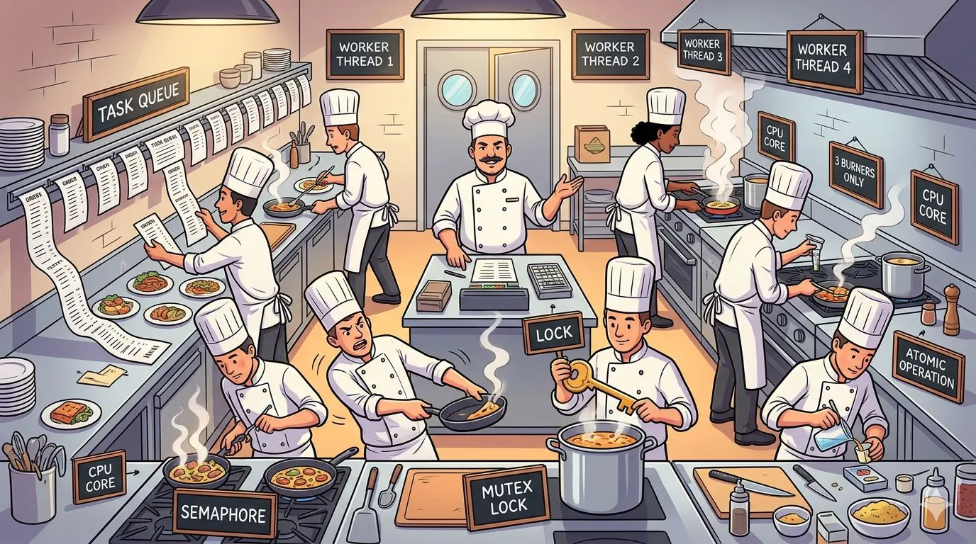 Image Description : Think of a thread pool like a busy restaurant kitchen. Incoming orders (tasks) are placed on the ticket rail (task queue). A fixed number of chefs (worker threads) continuously pick up orders and cook them using limited kitchen stations (CPU cores). The head chef acts like the scheduler, ensuring work flows smoothly. Locks prevent multiple chefs from grabbing the same pan at once (mutual exclusion), and a sign that says ‘3 burners only’ represents a semaphore limiting how many chefs can use a resource at the same time. Just like a well-run kitchen avoids chaos during rush hour, a well-designed thread pool keeps concurrent programs efficient and organized. I started my MacBook Pro (13-inch, 2020). I was curious: how does this machine actually run multiple threads at once? I looked at the specs. Eight CPU cores total—four performance cores, built to chew through heavy workloads like compiling programs or rendering videos, and four efficiency cores, quietly handling lighter tasks like web browsing and background apps. MacOS decides dynamically which core does what. I asked myself: if I create 20 threads, how many will actually run simultaneously? CPU cores = 8 Threads = 20 I realized: only eight threads run truly in parallel. The remaining twelve wait. The CPU scheduler rotates them using context switches, based on time slices, priorities, waiting events, or thread completion. Threads are cheap to create, but managing them is expensive—memory overhead, scheduling, and constant switching add up. context switches I wrote a naive loop to test: for (int i = 0; i < 1000; i++) { new Thread(task).start(); } for (int i = 0; i < 1000; i++) { new Thread(task).start(); } I watched as the CPU struggled. A thousand threads started, and most of the time was spent juggling rather than executing. I understood: I needed thread reuse. I needed a pool of threads that stay alive and pull work as it arrives. thread reuse Solving I/O-bound and CPU-bound bottlenecks requires different approaches: I/O-bound tasks (waiting for network/disk) are solved by increasing concurrency (async/threading) to handle wait times, while CPU-bound tasks (heavy computation) require parallelism (multi-processing/more cores) or algorithmic optimization to share the processing load. Solving I/O-bound and CPU-bound bottlenecks requires different approaches: I/O-bound tasks (waiting for network/disk) are solved by increasing concurrency (async/threading) to handle wait times, while CPU-bound tasks (heavy computation) require parallelism (multi-processing/more cores) or algorithmic optimization to share the processing load. concurrency parallelism Step 1: Building the Task Queue I asked: How do I feed work to threads efficiently? I needed a task queue—a place where tasks wait for execution. task queue Java gave me BlockingQueue. Perfect. Workers can pull tasks when available or wait efficiently when none exist: BlockingQueue BlockingQueue<Runnable> queue = new LinkedBlockingQueue<>(); I watched the pattern form in my head. Tasks wait quietly, threads sleep when there’s nothing to do, and wake instantly when work arrives. Everything is efficient and predictable. Step 2: Worker Threads I was curious: how should the workers behave? They should continuously check the queue, take tasks, and execute them. Simple. I wrote: continuously check the queue, take tasks, and execute them class Worker extends Thread { private BlockingQueue<Runnable> queue; public Worker(BlockingQueue<Runnable> queue) { this.queue = queue; } public void run() { while (true) { try { Runnable task = queue.take(); // blocks if empty task.run(); } catch (InterruptedException e) { break; // exit cleanly } } } } class Worker extends Thread { private BlockingQueue<Runnable> queue; public Worker(BlockingQueue<Runnable> queue) { this.queue = queue; } public void run() { while (true) { try { Runnable task = queue.take(); // blocks if empty task.run(); } catch (InterruptedException e) { break; // exit cleanly } } } } Worker extends Thread → Each worker is a thread. It can run concurrently with other threads. private BlockingQueue<Runnable> queue → Each worker has access to the shared task queue. queue.take() → The worker pulls a task from the queue. If the queue is empty, the thread waits (blocks) efficiently instead of looping and wasting CPU. task.run() → The worker executes the task it just pulled. InterruptedException → If the thread is asked to stop (via thread.interrupt()), it exits the loop cleanly instead of hanging. Worker extends Thread → Each worker is a thread. It can run concurrently with other threads. Worker extends Thread is a thread private BlockingQueue<Runnable> queue → Each worker has access to the shared task queue. private BlockingQueue<Runnable> queue shared task queue queue.take() → The worker pulls a task from the queue. queue.take() pulls a task from the queue If the queue is empty, the thread waits (blocks) efficiently instead of looping and wasting CPU. waits (blocks) efficiently task.run() → The worker executes the task it just pulled. task.run() InterruptedException → If the thread is asked to stop (via thread.interrupt()), it exits the loop cleanly instead of hanging. InterruptedException thread.interrupt() Why this matters: Workers reuse threads instead of creating a new thread for every task. They wait efficiently when there’s no work → no wasted CPU cycles. They exit gracefully when interrupted → easy to shut down a thread pool. Workers reuse threads instead of creating a new thread for every task. reuse threads They wait efficiently when there’s no work → no wasted CPU cycles. wait efficiently They exit gracefully when interrupted → easy to shut down a thread pool. exit gracefully I imagined them: looping silently, waiting for tasks, springing into action only when needed. If I interrupt them, they exit gracefully. No wasted CPU, no chaos. Step 3: The Thread Pool I asked: how do I pu