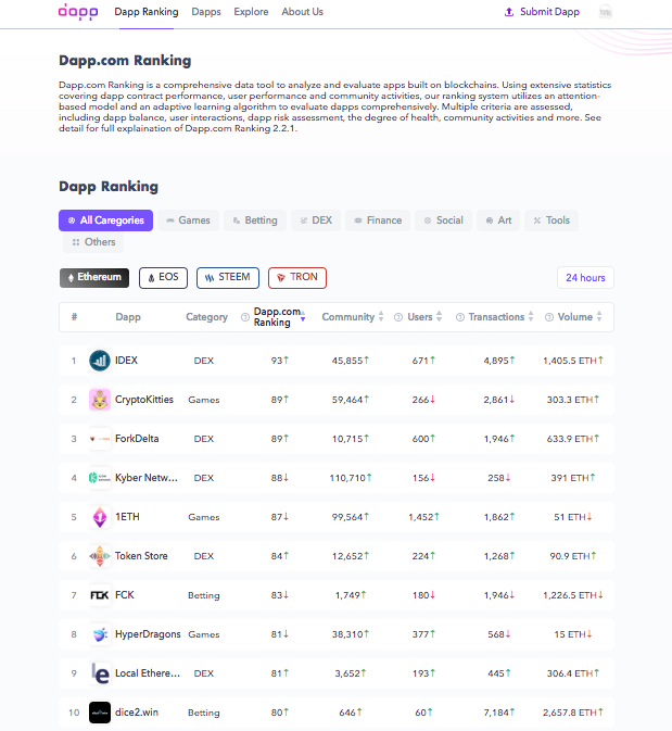 Here’s the Dapp.com way to identify a good dapp and you’ll never miss one ever again. Decentralized applications (dapps) have gained significant attention from the public since Q3 2017. According to our , dapp users have risen from less than 20,000 in June 2017 to over 950,000 by September 2018. The Ethereum dapps had a good run in the first 3 quarters in 2018 with a total transaction volume of over . Although the industry is still in its early stages, it demonstrates the potential of being a market with hundreds of billions of dollars. Q3 2018 Dapp Market Report US$ 2 billion worth of ETH We are witnessing the massive landing of dapps here. However, how to determine whether a dapp project is good or not? Most of the people consider only daily active users (DAU) as the sole measure of the excellence of a dapp. Yet in many cases, it can be inaccurate and misleading. Therefore, we would like to take this opportunity to introduce you a more scientific way of evaluating dapps — — and explain how it works. Dapp.com Ranking 2.2.1 Why “DAU” Is Misleading? First, let’s start with the definition of DAU. Daily active users (DAU) is a way of gauging the success of an internet product such as a social networking service, online game, or mobile app. It calculates the number of users visited or interacted with an internet product or service on a single given day.”[1] “Usually the only requirement for a product user to be considered “active” is that they somehow view the product or engage with the product.”[2] Introducing DIU The DAU data is recorded in the product backend that only operators can get access to. Some website traffic measurement tools such as and provide estimated data, which oftentimes is missing and incomplete. For most dapp data sites, they measure a dapp’s DAU via monitoring its contract address to find out the number of transaction. The number here is usually referring to “DAU”. Dapp.com ranking, however, takes one step deeper and looks at the unique wallet addresses that interact with the contract on the blockchain. The data extracted according to this criteria, instead of calling it DAU, we’d like to call it — . Alexa SimilarWeb DIU Daily Interactive Users Then why do we use DIU instead of DAU? Users who have logged into or browse the product are counted as DAU, but only those who have interactions with the blockchain are DIU. For example, a dapp game ABC might have 10,000 DAU, but those people just explore the marketplace with zero purchase and transaction activity, then they are not DIU. Is DIU Important? Back in 2017, Crypto collectibles were quite popular and we call those dapps “Hot Potato Game” — buy items at low prices and flip at higher prices later. Then many idle games and Ponzi schemes launched in 2018. The daily participated users number became the one and only index — just to make sure a large number of new participants join the game every day to be able to secure higher dividends. A lot of investors studied the game mechanism and the DIU stats to decide whether to invest in newly launched crypto collectibles or other dapps with investment attributes. So people refer to DIU (previously called DAU) as the sole criteria for evaluating a dapp. We all know that transparency is the key feature of a dapp, and every single detail of wallet addresses (accounts) interact with the smart contracts are recorded on the blockchain. However, people still find a way to cheat and here’s how: That dapp game ABC has 1 user with 1 ETH of transaction volume when that 1 ETH was transferred from an address to the smart contract. But it also could be 100 users have only 1 ETH of total transaction volume if that 1 ETH was split into 100 different wallets and transferred to smart contracts. (Think of this way, 1 apple pie for 1 person vs. 1 apple pie for 100 people.) Also, some people even build services to provide higher “DAU” (actually DIU) for dapps to get on the top ranking on websites like DappRadar. One site called , which can help dapps create huge amounts of EOS accounts to interact with its contracts and be able to list on the top 3. EOS DAU So, is DIU really important? Yes, but DIU is the sole criteria for dapps. NOT How to Identify a Good Dapp? Well, it is a daunting challenge to pick a good dapp. We at Dapp.com have been researching and analyzing thousands of dapps over the last year. And here are some key metrics that we believe you should look into: : The number of accounts (users) that interact with the dapp’s smart contracts. Daily Interactive Users (DIU) : There’s a huge difference between a user with 0.01 ETH in the account and the one 100 ETH in the account, and we consider the one with 100 ETH is a high-quality user. Quality of Users : It includes non-zero transactions (usually purchases) and zero transactions (actions). Transaction Amount : It purges bots and fake users whose funds are from the dapp’s contracts through multiple transfers. Funding Sources of User Accounts : If a user account has 5 out of 10 contract-related activities with a dapp in one day, we consider he/she has high attention to this dapp. User’s Attention : If a user’s last contribution to a dapp was a few months ago, then his/her recent action(s) to the dapp should reflect differences in its dapp ranking. Timeliness of User Actions : It includes the community size and activeness. A community is formed by its loyal supporters and users who join the entire journey, from the dapp development to the expansion. It not only shows the potential to grow but also reflects the team’s capability of operations. Community (A snapshot of ’ , data was collected at 9:30 am EST on Jan 8, 2019) CryptoKitties dapp detail page Dapp.com Ranking covers all the in our algorithm and we’ve also added the community data in the new version 2.2.1. The higher the ranking score, the better the dapp is. Also, the growing tendency of the ranking score reflects the potent