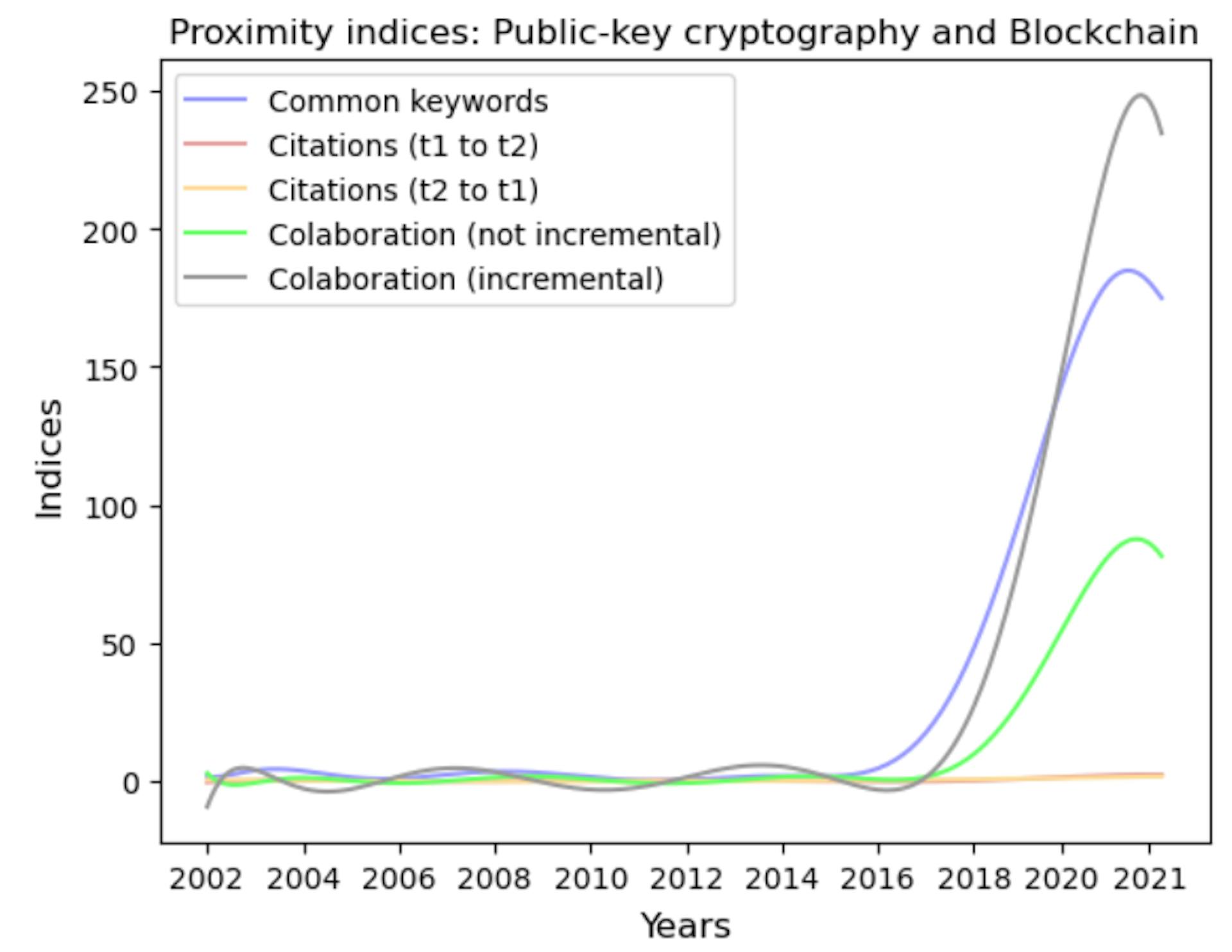 Table of Links Abstract and 1. Introduction Abstract and 1. Introduction 2 Related Work and 2.1 Technology Convergence Approaches 2 Related Work and 2.1 Technology Convergence Approaches 2.2 Technology Convergence Measurements 2.2 Technology Convergence Measurements 2.3 Technology Convergence Models 2.3 Technology Convergence Models 3 Data 3 Data 4 Method and 4.1 Proximity Indices 4 Method and 4.1 Proximity Indices 4.2 Interpolation and Fitting Data 4.2 Interpolation and Fitting Data 4.3 Clustering 4.3 Clustering 4.4 Forecasting 4.4 Forecasting 5 Results and Discussion and 5.1 Overall Results 5 Results and Discussion and 5.1 Overall Results 5.2 Case Study 5.2 Case Study 5.3 Limitations and Future Works 5.3 Limitations and Future Works 6 Conclusion and References 6 Conclusion and References Appendix Appendix 5.2 Case Study To illustrate the practical implications of our findings, we examine the evolution of proximity indices between ”Public-key cryptography” and ”Blockchain,” as depicted in Figure 4. A notable interpolation rate of 46% is evident. This can be attributed to the sparse interactions between both technologies from 2002 to 2012, reflecting the early stages of blockchain development in the cybersecurity domain. Consequently, during this phase, indices remained relatively stagnant. It’s important to note that this interpolation rate, though steep, doesn’t significantly bias our indices between ”Public-key cryptography” and ”Blockchain”; instead, it accurately reflects the non-interactive phase between these technologies. A significant surge in the proximity indices is evident from 2017 onwards, with the indices for common keywords and collaboration based on incremental h-indices being particularly prominent. This suggests a robust correlation between the variables ”common keywords” and ”collaboration,” indicating a notable number of authors simultaneously exploring both public-key cryptography and blockchain technologies. Additionally, there is a marginal increase in mutual citations between the two technologies. While citation-based indices exhibit modest growth, it could be attributed to their inherent construction rather than a lack of interaction between the two technologies. Based on this evidence, we hypothesize that a tangible technological convergence occurred between blockchain and public-key cryptography from 2017 to 2021. This convergence is highlighted by the increasing adoption of public-key cryptography in blockchain platforms during this period. Techniques like digital signatures, based on public-key cryptography, became integral to verifying blockchain transactions. Furthermore, the integration of zero-knowledge proofs, also based on public-key cryptography, gained traction in blockchain frameworks to validate assertions without revealing the underlying data. In conclusion, our findings highlight a pivotal phase of technological convergence between blockchain and public-key cryptography spanning 2017 to 2021. This paper is available on arxiv under CC BY 4.0 DEED license. This paper is available on arxiv under CC BY 4.0 DEED license. available on arxiv Authors: (1) Alessandro Tavazz, Cyber-Defence Campus, armasuisse Science and Technology, Building I, EPFL Innovation Park, 1015, Lausanne, Switzerland, Institute of Mathematics, EPFL, 1015, Lausanne, Switzerland and a Corresponding author (tavazale@gmail.com); (2) Dimitri Percia David, Cyber-Defence Campus, armasuisse Science and Technology, Building I, EPFL Innovation Park, 1015, Lausanne, Switzerland and Institute of Entrepreneurship & Management, University of Applied Sciences of Western Switzerland (HES-SO Valais-Wallis), Techno-Pole 1, Le Foyer, 3960, Sierre, Switzerland; (3) Julian Jang-Jaccard, Cyber-Defence Campus, armasuisse Science and Technology, Building I, EPFL Innovation Park, 1015, Lausanne, Switzerland; (4) Alain Mermoud, Cyber-Defence Campus, armasuisse Science and Technology, Building I, EPFL Innovation Park, 1015, Lausanne, Switzerland. Authors: Authors: (1) Alessandro Tavazz, Cyber-Defence Campus, armasuisse Science and Technology, Building I, EPFL Innovation Park, 1015, Lausanne, Switzerland, Institute of Mathematics, EPFL, 1015, Lausanne, Switzerland and a Corresponding author (tavazale@gmail.com); (2) Dimitri Percia David, Cyber-Defence Campus, armasuisse Science and Technology, Building I, EPFL Innovation Park, 1015, Lausanne, Switzerland and Institute of Entrepreneurship & Management, University of Applied Sciences of Western Switzerland (HES-SO Valais-Wallis), Techno-Pole 1, Le Foyer, 3960, Sierre, Switzerland; (3) Julian Jang-Jaccard, Cyber-Defence Campus, armasuisse Science and Technology, Building I, EPFL Innovation Park, 1015, Lausanne, Switzerland; (4) Alain Mermoud, Cyber-Defence Campus, armasuisse Science and Technology, Building I, EPFL Innovation Park, 1015, Lausanne, Switzerland.