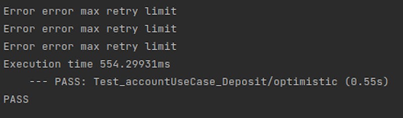 Comparison between Optimistic and Pessimistic locking with Golang and PostgreSQL Locking mechanism in SQL database. The locking mechanism is used to manage access to resources shared by user databases, tables, pages, and rows to guarantee the consistency of the transmitted data. There are two types of locking in databases, , and . Optimistic Locking Pessimistic locking Optimistic Locking. is a technique for SQL database applications that do not hold row locks between selecting and updating or deleting a row. If the row does change, the update or delete will fail, and the application logic handles such failures by, for example, retrying the whole process.⁽¹⁾ Optimistic locking Pessimistic Locking. The model prevents simultaneous updates to records. As soon as one user starts to update a record, a lock is placed on it. Other users who attempt to update this record are informed that another user has an update in progress. The other users must wait until the first user has finished committing their changes, releasing the record lock. Only then can another user make changes based on the previous user's changes.⁽²⁾ pessimistic locking Implementation Locking using GO and PostgreSQL For this implementation, we will create a use case with two repositories implementation, one using pessimistic and the other optimistic approaches, to simulate deposit action in the account table. For the sake of learning, we use 2 steps in this implementation, firstly we will select the record, modify in GO, then update to the PostgreSQL. account Pessimistic Implementation In the pessimistic implementation, the SQL looks like this : BEGIN; SELECT * FROM account WHERE username = $1 LIMIT 1 FOR NO KEY UPDATE; UPDATE account SET balance = $1, version = version+1 WHERE id = $2; COMMIT; will tell the database to lock the row for updates that only modify non-key fields. FOR NO KEY UPDATE Golang implementation with sqlx library : const ( selectAccountLock = "SELECT * FROM account WHERE username = $1 LIMIT 1 FOR NO KEY UPDATE;" depositAccount = "UPDATE account SET balance = $1, version = version+1 WHERE id = $2;" ) func (a *accountRepository) Deposit(ctx context.Context, request *entity.DepositRequest) error { // declare the transaction tx, err := a.db.Beginx() if err != nil { fmt.Println(err) return entity.ErrInternalServer } // select account from database rows, err := tx.QueryxContext(ctx, selectAccountLock, request.Username) if err != nil { return entity.ErrInternalServer } var account entity.Account for rows.Next() { err = rows.StructScan(&account) if err != nil { return entity.ErrInternalServer } } account.Balance += request.Amount _, err = tx.ExecContext(ctx, depositAccount, account.Balance, account.ID) if err != nil { tx.Rollback() fmt.Println(err) return entity.ErrInternalServer } tx.Commit() return nil } Optimistic Implementation In the optimistic implementation, SQL will look like this: SELECT * FROM account WHERE username = $1 LIMIT 1; UPDATE account SET balance = $1, version = version + 1 WHERE id = $2 AND version = $3; If we look at the update query there is a on the where clause, it is used to check if there is any other modification on the row between our and queries. If the query return it means the row has been modified between our and queries, then we have to retry those two queries. version = $3 select update update zero rows affected select update Our optimistic locking Golang implementation needs to create a retry mechanism and a maximum number of retries, it will look like this: const ( maxRetries = 3 selectAccountByUsername = "SELECT * FROM account WHERE username = $1 LIMIT 1;" depositAccountOpt = "UPDATE account SET balance = $1, version = version+1 " + "WHERE id = $2 AND version = $3;" ) func (a *accountRepositoryOpt) Deposit(ctx context.Context, request *entity.DepositRequest) error { return a.depositOpt(ctx, request.Username, request.Amount, 0) } func (a *accountRepositoryOpt) depositOpt(ctx context.Context, username string, amount float64, retry int) error { // check retry count if retry >= maxRetries { return entity.ErrMaxRetry } // select account rows, err := a.db.QueryxContext(ctx, selectAccountByUsername, username) if err != nil { return entity.ErrAccountByUsernameNotFound(username) } var account entity.Account for rows.Next() { err = rows.StructScan(&account) if err != nil { return entity.ErrInternalServer } } // add account balance with the depositOpt amount account.Balance += amount // update new account to db result, err := a.db.ExecContext(ctx, depositAccountOpt, account.Balance, account.ID, account.Version) if err != nil { fmt.Println(err) return entity.ErrInternalServer } // check rows affected count rowsAffected, err := result.RowsAffected() if err != nil { fmt.Println(err) return entity.ErrInternalServer } // retry if count rows affected by update less than one if rowsAffected == 0 { return a.depositOpt(ctx, username, amount, retry+1) // recursion } return nil } We use the recursion function to call retry if the rows affected are zero, and we will terminate recursion when is equal to the maximum number of retries ( ). retry maxRetries Comparison We will create some tests to compare the performance of optimistic and pessimistic locking mechanisms. Each test will be done deposit 1000 times and using a varying number of users that 100, 200, and 300. It also uses semaphore for 100 concurrent processes at the time due to the limit in PostgreSQL connection. The test will look like this: func Test_accountUseCase_Deposit(t *testing.T) { type fields struct { accountRepo accountRepo } ctx := context.Background() tests := []struct { name string fields fields wantErr bool }{ { name: "pessimistic", fields: fields{ accountRepo: repository.NewAccountRepository(db), }, wantErr: false, }, { name: "optimistic", fields: fields{ accountRepo: repository.NewAccountRepositoryOpt(db), }, wantErr: false, }, } for _, tt := range tests { t.Run(tt.name, func(t *testing.T) { a := &accountUseCase{ acco