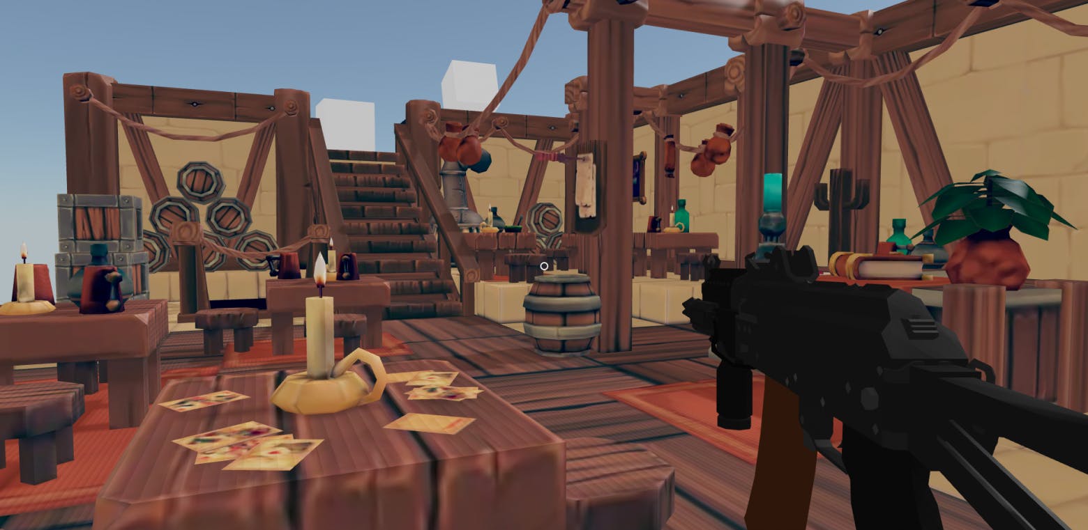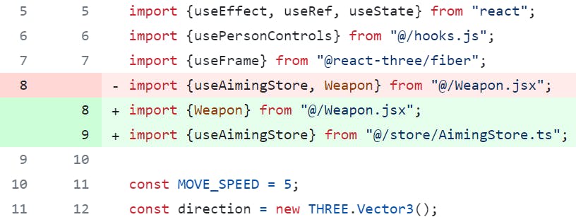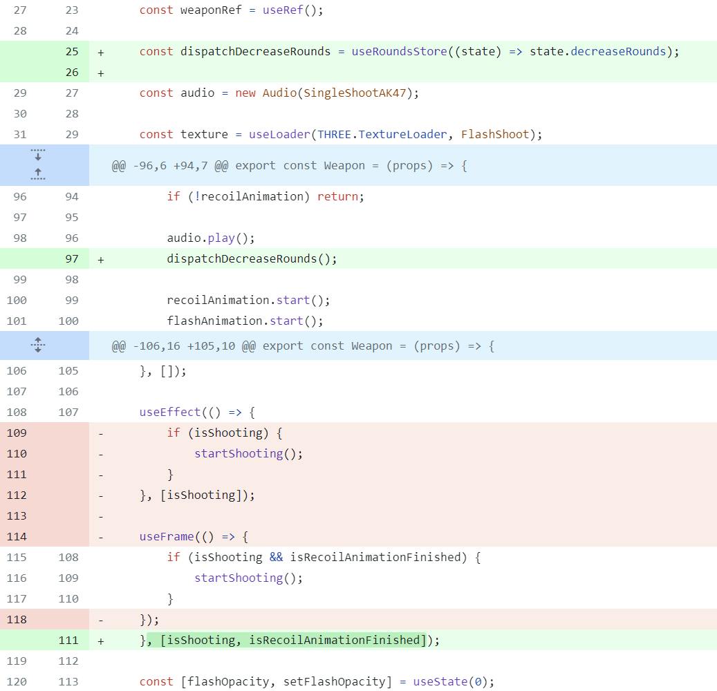 Introduction In modern web development, the boundaries between classic and web applications are blurring every day. Today, we can create not only interactive websites but also full-fledged games right in the browser. One of the tools that makes this possible is the library - a powerful tool for creating 3D graphics based on using technology. React Three Fiber Three.js React In today's article, we will implement: add a new territory; connect typescript and configure absolute file paths; add an ammo counter; add reloading; hide the aiming point during aiming; work with sounds when firing and when the magazine is empty; add quick access slots interface with icons. Repository on GitHub Final demo: https://www.youtube.com/watch?v=XtL33-0fihc&embedable=true https://codesandbox.io/p/github/JI0PATA/fps-game?embedable=true Adding new territory In order to slightly diversify the territory through which the character can move, it was decided to replace it. There is a list on the official website. I chose this . From it, I took the territory model and imported it into my project. Since this room model already contains everything we need, we can immediately use it in our project. To do this, you will need to remove everything unnecessary in the file and use the imported model. I'll add it to the path . This (clicking on the link will download it) can be taken directly from the repository. of examples React Three Fiber demo Ground.jsx public/territory.glb model And at the same time, you can remove the floor surface texture from the project. floor.png Code section Connecting TypeScript and SCSS To make it more convenient to develop and maintain the application, let's connect . In this part, I will use it exclusively to develop some parts of the interface, but not yet to work with . TypeScript Three.js For example, how to add to an already created project can be found . TypeScript here Let's add two configuration files: and , as stated in the article above. tsconfig.json tsconfig.node.json tsconfig.json { "compilerOptions": { "target": "ES2020", "useDefineForClassFields": true, "lib": ["ES2020", "DOM", "DOM.Iterable"], "module": "ESNext", "skipLibCheck": true, "baseUrl": ".", "paths": { "@/*": ["./src/*"] }, "types": ["node"], /* Bundler mode */ "moduleResolution": "bundler", "allowImportingTsExtensions": true, "resolveJsonModule": true, "isolatedModules": true, "noEmit": true, "jsx": "react-jsx", /* Linting */ "strict": true, "noUnusedLocals": true, "noUnusedParameters": true, "noFallthroughCasesInSwitch": true }, "include": ["src"], "references": [{ "path": "./tsconfig.node.json" }] } tsconfig.node.json { "compilerOptions": { "composite": true, "skipLibCheck": true, "module": "ESNext", "moduleResolution": "bundler", "allowSyntheticDefaultImports": true }, "include": ["vite.config.js"] } To simplify imports, we will make them with an absolute path. For example, these articles describe configs for and files. For files, the necessary rule has already been added (lines 8-11 in the file ). For regular JS files, you need to create a new file and add the appropriate rules there. JS TS TS tsconfig.json jsonconfig.json jsconfig.json { "compilerOptions": { "baseUrl": ".", "paths": { "@/*": ["./src/*"] } } } In the file, you can now change the paths to absolute ones, starting the paths with “ ” and making sure that everything works correctly. App.jsx @/ To avoid errors while working with for designs from , you will need to edit the file. And also install the appropriate packages. ESLint TypeScript .eslintrc.cjs npm i -D @types/node @typescript-eslint/eslint-plugin @typescript-eslint/parser To connect you will need to install it first. SCSS, npm i -D sass file to . We will also change the file extension of to and correct the path to the component and the styles file in accordance with the absolute path. Let's rename the index.css index.scss main.jsx main.tsx App After renaming to the extension, you will need to replace the path to the root file in the file. .tsx index.html To correct these errors, you will need to create a file with the following lines in the root of the declaration.d.ts src folder. declaration.d.ts declare module '*.scss'; declare module '*.jsx'; Let's get back to styles. Let's create a new file along the path . Let’s transfer the “sight” styles to the created file and use “modular classes.” src/UI/UI.module.scss Now we can use and in our project, and also use to import files. It is also necessary to change the paths in the remaining files to absolute ones for everything to work correctly. SCSS TypeScript absolute paths Code section Ammo counter Now, our weapons can fire indefinitely since they have no shot limit. To implement this limit, we will use to store states. zustand Let's create a new file along the path . In this file, we will use . Let's set the default number of cartridges, describe the interface of our storage, and create the storage itself. In it, we will describe the current number of cartridges (by default, the value is set from the variable ), a function for decreasing by one cartridge, and a function for reloading (setting the current number of cartridges to the default number). src/store/RoundsStore.ts TypeScript defaultCountOfRounds RoundsStore.ts import {create} from "zustand"; const defaultCountOfRounds = 30; export interface IRoundsStore { countRounds: number; decreaseRounds: () => void; reloadRounds: () => void; } export const useRoundsStore = create<IRoundsStore>()((set) => ({ countRounds: defaultCountOfRounds, decreaseRounds: () => set(({ countRounds }) => { return { countRounds: Math.max(countRounds - 1, 0) } }), reloadRounds: () => set(() => { return { countRounds: defaultCountOfRounds } }) })); Now, we can visually show the current state of the number of cartridges. Using the following path, we create two files: and . src/UI/NumberOfRounds/NumberOfRounds.tsx src/UI/NumberOfRounds/styles.module.scss Let's add styles for the counter element. styles.module