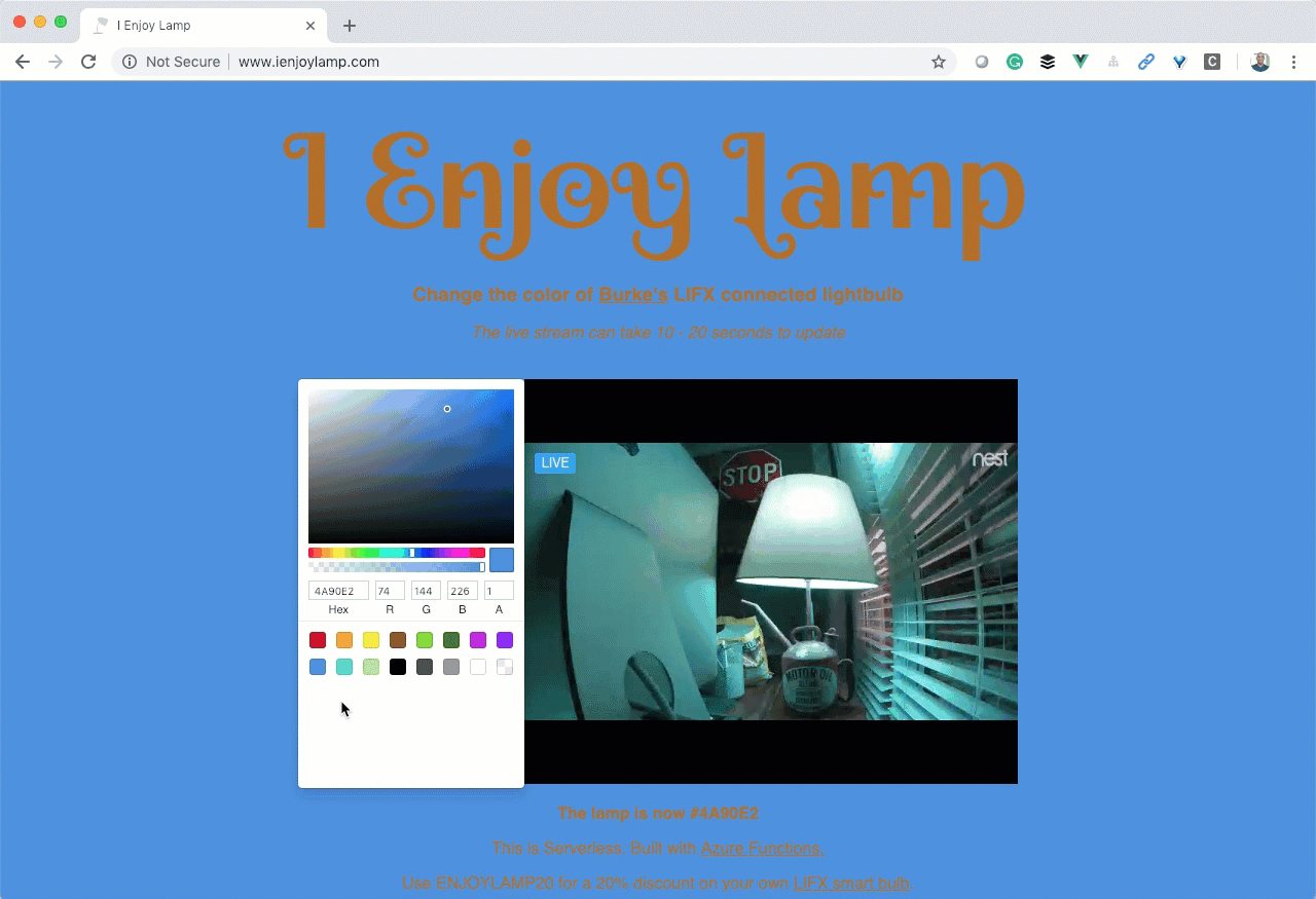 It’s so hard to know how to decorate a space. What color should the walls be? What sort of furniture works best for these room dimensions? Where is the best place to hang this picture of ? Jean Claude Van Damme holding a puppy I don’t know the answer to any of those questions — except maybe the third (“above the bed”) — but I did solve some of my own decorating dilemmas by letting the internet set the color of my office via an internet-connected . lightbulb Setting the mood with LIFX I have a simple . I should mention that you can buy one yourself and save 20% on with the code thanks to the folks over at LIFX. I don’t make any money off of that if you do, but it makes LIFX like me more, and isn’t making sure everyone likes you the real point of life? LIFX mini-color lightbulb IENJOYLAMP I have made dozens of projects with my LIFX bulb. It’s one of my most favorite things. I put together a site called “ ” (because ilovelamp.com was already taken) with a UI that just set the color of my lamp. www.ienjoylamp.com not only allows you to change the color of the bulb; which you can do right now by the way. ienjoylamp.com The live stream is powered by Nest and it is SIGNIFICANTLY delayed. If anyone has a better idea on a simple Live Stream’ing setup that won’t be so damn slow, please, for the love of all that’s holy, let me know. So I built this — primarily out of a strong sense of boredom and too much boxed red wine — and I tweeted it out…….and nobody cared. Then about a month or so later, I tweeted it out again… That tweet was picked up and RT’d by , and the entirety of the internet descended on my lightbulb. Which teaches us that if you really want someone to do something, make it about the children. Jeff Sandquist This has continued ever since. I’m not kidding. Even as I write this post my lightbulb is changing every few seconds and it is . over a month later Every time that bulb changes color, I know that someone, somewhere did that and for this brief moment, no matter where in the world that person is, we have a connection. Each color change is like tiny micro-interactions with people all day long even though we never spoke any words at all. Wait — did I just discover the cure for introversion?! What’s kinda interesting about this project is that it is using Vue, a NodeJS API AND web sockets. There is more going on than meets the eye. provides the API endpoints here, and provides the real-time functionality. Let’s take a look at how this works. Azure Functions Azure SignalR Azure Functions API The primary endpoint that the front end calls is not very complicated at all. It has one method “setColor”. That’s essentially the entire API. It’s a thin wrapper around LIFX’s own API. It’s just proxying request through to LIFX’s servers, but abstracting that into an API of our own gives some nice benefits… I can obscure my LIFX token because it’s hidden behind my API. I can control who can call this API with the CORS settings in Azure Functions. I can use Azure Functions tokens for security and rotate them at will. I can add in realtime with the Azure SignalR binding. Going real-time with Serverless Shortly after my lamp made the rounds on Twitter, Anthony Chu tweeted at me and said… Now the first commandment of open source says, “Whosever requests a feature, so shall they also present a pull request as a pleasing sacrifice”. And shortly thereafter, said sacrifice was presented AND pleasing… When you change the color of the lamp on it changes the background color of the site to match. Anthony did is wired up the site so that your background will change whenever anyone anywhere changes the color of the lamp. That means that we’re all now connected in some small way. ienjoylamp.com, It’s all so emotional. Anthony did this by tying in my existing API to Azure SignalR. Azure SignalR SignalR originated as an ASP.NET abstraction on web sockets. It reduces the boilerplate and wiring that you have to do as a developer, as well as dealing with things that you would rather just not, like falling back to long polling if a client doesn’t support web sockets. Although it’s 2019 and pretttttty much supports sockets. every browser Azure SignalR abstracts this a bit further and turns the whole thing into a hosted service that you send and receive messages from. You can set it up from the Azure Portal like any other Azure service. The service then gets created and sits out there in the cloud like Mary Poppins. The greatest movie, or greatest movie ever? In order to talk to this thing from Azure Functions, we have to create a binding for SignalR. To do that, you have to install the Azure SignalR binding for Azure Functions. func extensions install --package Microsoft.Azure.WebJobs.Extensions.SignalRService -Version 1.0.0-preview1-10025 Now you need the connection string for the Azure SignalR instance that was created. That can be found in the “Key’s section of your Azure SignalR service in the portal. Add that connection string as a variable in your file. local.settings.json {"IsEncrypted": false,"Values": {"AzureWebJobsStorage": "","FUNCTIONS_WORKER_RUNTIME": "node","LIFX_TOKEN": "nunya","AzureSignalRConnectionString": "Endpoint= ;"}} https://nunya.service.signalr.net;AccessKey=nunya;Version=1.0 Then add a binding in the file for the SignalR service we created earlier. function.json With that binding in place, we can send a message to the Azure SignalR Hub. This block of code from the earlier snippet in this article does just that. The “target” is the name of the name of the method that you want the Azure SignalR hub to evoke. Any clients that you want to be notified about this event will need to listen to the event, which we’ll get to in just a second. colorChanged Before we can actually connect a client, we need to add a place for the client to connect. By convention, SignalR looks for a “negotiate” endpoint. This will