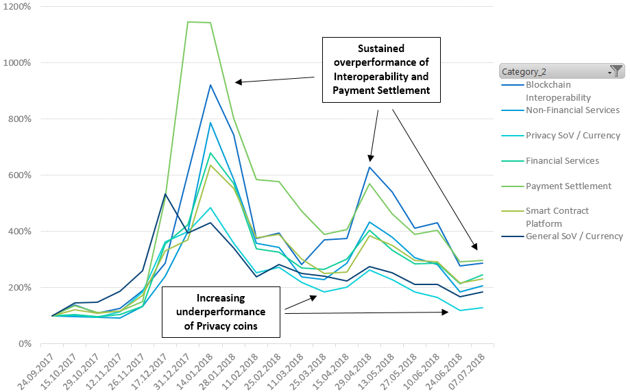 Abstract This article provides a comprehensive categorization of cryptoasset classes and describes historical market cap trends of different sectors. Our analysis will help you better understand general developments on the market and it will provide you with tools for further research. The proposed three-level categorization model can be used to identify the most attractive cryptoasset sectors, diversify one’s crypto portfolio, forecast macro developments based on historical trends, etc. crypto blockchain Although several cryptoasset categorizations exist (most notably, those by Fundstrat and Multicoin Capital), they fail to fully appreciate the complexity of the crypto space. To our best knowledge, no publicly available in-depth analysis of crypto sectors’ growth exists at the moment. This article is the first attempt to fill these research gaps. Our cryptoasset categorization groups blockchain projects into the following three high-level categories: Store of Value / Currency / Mode of Payment Blockchain Infrastructure Services Built on the Blockchain Second and third level cryptoasset classes provide more granular grouping that reflects the vastly different areas of blockchain applications: Figure 1. Three-Level Cryptoasset Categorisation Our analysis of market cap trends revealed that growth rates of cryptoasset sectors differ significantly. The largest cryptoassets (Bitcoin and Ethereum) both underperformed in terms of market cap growth in the observation period (+84% and +76% respectively), while smaller cap projects grew stronger (+167%). On the second level of our cryptoasset classification, top performers are: Non-Ethereum General Smart Contract Platforms (+602%) and Enterprise Smart Contract Platforms (+285%). Privacy-focused cryptoassets significantly underperformed with only +30% market cap growth. On the third classification level, Gambling & Gaming subcategory is the leader of growth (+423%), while Tokenized Assets (+7%) are the clear loser. The details on other cryptoasset classes’ performance are described in Findings section. You may have already observed the trends we describe and some of the developments may seem obvious to an expert. Yet, this article is of value even to trained experts, as it puts an exact number on the growth rates of different cryptoasset categories and allows you to benchmark them easily. Subscribe to our pub to get the latest analytics on crypto: . Crypto Data Science Analysis Several cryptoasset categorizations currently exist, yet these categorizations do not properly reflect the complexity of the crypto universe, which contains vastly different applications of blockchain technology. The existing categorizations either remain too abstract and lack the required level of detail or contain extremely granular subcategories failing to organize those into larger meaningful groups. For example, Tom Lee (Fundstrat) groups cryptoassets into commodities, privacy, platforms, exchanges and stablecoins — categorizing cryptos based on how they trade. General partners of Multicoin Capital group cryptoassets based on their valuation models. The resultant categories are: currencies (stores of value), security tokens (represent real-world assets) and utility tokens (work tokens). Jake Ryan (Tradecraft Capital) recognizes the need for a more granular approach than those outlined above and proposes the following categorization: core/reserve, currencies, platforms, utility tokens, security tokens, commodities, appcoins and stablecoins. We would argue about the exact categories created by Jake (e.g., we are particularly sceptical about core/reserve group that contains Bitcoin and Ethereum); however, our point is that we need an altogether different approach to cryptoasset categorization. We need to appreciate the vast functional differences of cryptoassets and yet be able to talk about meaningful high-level cryptoasset categories. To ensure that we provide both the required level of detail and abstraction, we created our three-level categorization model. Cryptoasset categorization is an important intellectual pursuit, yet on its own it provides little value to an investor other than being a tool for further analysis. In this article, we use this new tool and make an in-depth analysis of historical trends, highlighting what cryptoasset (sub)categories have been growing the fastest and how they benchmark. To our best knowledge, such an analysis has never been published, at least not at the level of detail we deliver. Prerequisites In this section, we provide a description of different cryptoasset types that we further use in this article and that may not be intuitively clear to all our readers. If you are sufficiently familiar with different types of cryptoassets and their distinct qualities, you may skip directly to Methodology. — a function of a (crypto)asset that can be saved, retrieved and exchanged at a later time, and be predictably useful when retrieved. More generally, it is an asset that retains its purchasing power into the future. Precious metals (in particular gold) are examples of classical store-of-value assets. Store of Value (SoV) asset that is designed to work as a medium of exchange, i.e. being a tradeable entity used to avoid the inconveniences of a pure barter system (exchanging goods or services in return for other goods or services). Currency / Mode of payment — — provides means (both software and hardware) to create and execute smart contracts on a blockchain network without any need for a centralized authority. Smart contracts are contracts with terms and conditions written in self-executing computer code. Smart Contract Platform — a function or service that drastically improves information sharing between different blockchains. Blockchain Interoperability — search and browse tools that help you find blockchain applications (dApps), smart contracts, data, and blockchains themselves. Blockchain Discovery Tools — digital contra