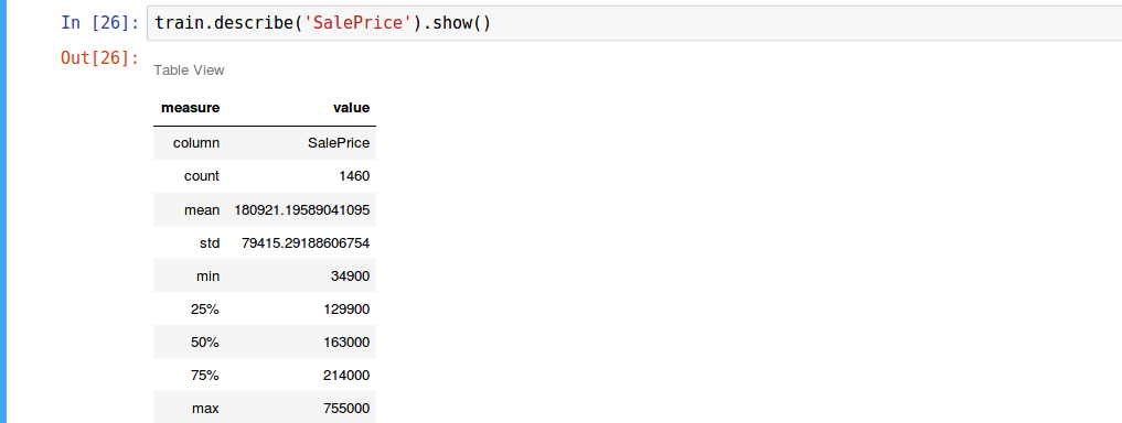 I love Javascript. I think it is a great programming language. It is a versatile, constantly evolving, ever growing language. It is practically the only language that runs both on the client and server. NPM, node’s packaging system, is great. For many, Javascript is their first (and sometimes only) programming language. But when it comes to data science, it is all about Python (or R). While Python is a great programming language, I don’t see any reason Python should be more suitable for data science than Javascript. They are both interpreted, non-typed programming languages. They both can wrap around C libraries for computationally intensive code. Yet, today, data science is done in Python. The goal of this tutorial is to open the door to data science programming using Javascript. This tutorial is intended for Javascript programmers without any data science experience. My next post is about Text Analysis. You can read it . here Jupyter Notebooks A great data science tool that was initially created for Python is . I like to think of it as a really sophisticated console combined with REPL programming. A notebook is a sequence of cells. Each cell may contain code, that can be executed and its output displayed right after the code. The context is kept from cell to cell i.e. variables declared in the first cell can be accessed from subsequent cells. The magic is in that while consoles can only display character based output, notebooks can display visuals, such as HTML, SVG and images. This is extremely important with data science where visualization is key to understanding the data. Notebooks, when used in data science, typically display tables, graphs and other data visualizations. It cannot be done using plain old command line Jupyter Notebook This is just the basics. Here are some features that make notebooks really cool: You can execute and re-execute code. The output is stored in the notebook You can add markdown cells, documenting the work you do. This makes notebooks a really good tool for demonstrating code and programming ideas You can set checkpoints while developing the notebook and rollback to them if whatever you did trashed the notebook You can download the notebook in various formats (HTML, PDF etc.) and share them. You can view an HTML download with the code in this post . here Jupyter notebook was initially developed for Python environments, so the code in the cells could only by python. As the platform evolved, . In this tutorial, we will use the Javascript kernel which makes it possible to run Javascript code. Another possible option for developing notebooks in Javascript is the with the . If you want to go the “PixieDust way”, I recommend ’s excellent post series. Start with . additional languages (called kernels) were added IJavascript PixieDust kernel node plugin Glynn Bird part one Dstools NPM Package I created a node package named To make using Javascript for data science a bit easier. It supports jQuery style chaining and wraps around other useful data analysis packages such as for statistical analysis, for csv file import and for data visualization. You can also use these libraries directly instead of the package, but our tutorial relies on it. [dstools](https://github.com/elshor/dstools) jStat csv Plotly dstools The Tutorial Data is a great source for learning data science and machine learning. It contains great notebooks that teach data science and hosts public datasets that can be used to demonstrate data science concepts. Unfortunately, Kaggle does not support Javascript notebooks (yet). This tutorial is loosely based on the Python notebook by Pedro Marcelino, analyzing the dataset. You will need to download one of the files in the dataset to run through the tutorial. Kaggle comprehensive data exploration with Python House Prices Getting Started We are done with the introduction. Let’s start coding. Installing Jupyter Notebook First, we will need to install the Jupyter Notebook. This is a Python based web server used to manage, create and use Jupyter notebooks. The notebook’s interface is web based. You can find installation instructions over . Note that the recommended installation method is using . Anaconda is a Python package management and distribution tool. Jupyter is included in the Anaconda distribution. here Anaconda After installing Jupyter, you can start the notebook server $ jupyter notebook By default, the server resides on port 8888, and can be access from the browser at . You will see the Jupyter logo and the ‘Files’ tab open with a file system view. On the right of the screen you will see a “new” button. Clicking on it will show a menu of possible notebook formats. You will probably see in the list “Python” but not “Javascript”. For that, you will need to install the IJavascript kernel. http://localhost:8888 Installing Javascript Kernel Follow the instructions at . Notice that you need to use the utility to allow Jupyter to use the Javascript kernel. https://github.com/n-riesco/ijavascript#installation ijsinstall Creating a Javascript Notebook After installing the IJavascript kernel, clicking the “New” button in the Jupyter server home page, will show the option for creating a “Javascript (Node.js)” notebook. Choose that option and create the Javascript notebook. It will open an empty notebook with a single empty code cell. Write the following totally unpredictable code into the cell: console.log('Hello World'); and the text will appear in your notebook. As you can see, the output is printed after the code cell. This is a great for plain text, but notebooks are here for visualization. The IJavascript kernel provides a global object that can be used for notebook communication and display. For example, the following code prints HTML output. This is a screen shot of the code cell and the output following it: $$ We will not get into the details of IJavascript API. You can read more about it . here Installing dstool