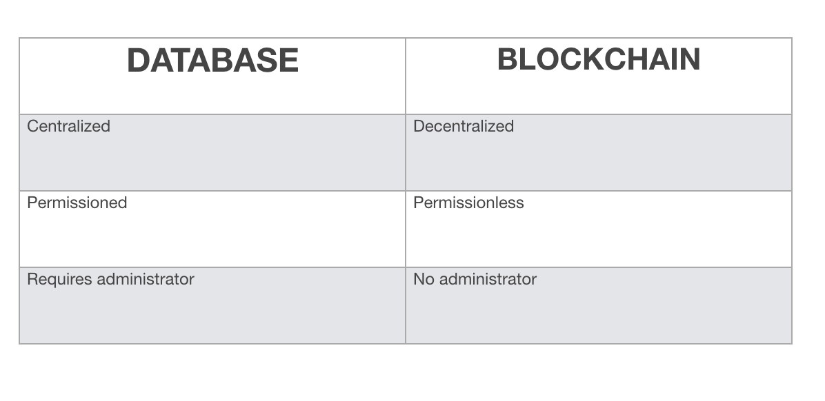 There is much confusion as to what a blockchain is and its dichotomy with a database. A blockchain is actually a database because it is a digital ledger that stores information in data structures called blocks. A database likewise stores information in data structures called tables. However, while a blockchain is a database, a database is not a blockchain. They are not interchangeable in a sense that though they both store information, they differ in design. There is also a difference in purpose between the two, which is perhaps what is not clear to those who want to understand why blockchains are needed and why databases are better suited for storing certain data. First, let’s look at the difference between a database and a blockchain. First, let’s look at the difference between a database and a blockchain. Database Database Database A traditional database is a data structure used for storing information. This includes data that can be queried to gather insights for structured reporting used by entities to support business, financial and management decisions. Government also make use of databases to store large sets of data which scale to millions of records. Databases started as flat file hierarchical systems which provided simple information gathering and storage. Later, databases used a relational model which allowed more complex ways of gathering data by relating information from multiple databases. The information stored in databases can be organized using a database management system. A simple database is stored in data elements called a table. Tables contain fields, which define the type of record, that store data called attributes. Each field contains columns that describe the field and rows which define a record stored in a database. A database design A database can be modified, managed and controlled by a single user called an administrator. The database always has a user that functions as a DB Admin and that user has complete control of the database. This user can create, delete, modify and change any record stored in a database. They can also perform administration on the database like optimizing performance and managing its size to more manageable levels. A large database tends to slow performance, so admins can run optimization methods to improve performance. The admin can then delegate certain roles to other users that allows them to administer or manage the database. For example an admin can delegate a role to a user that allows them to create new users for the database. When something goes wrong, the admin and their delegates can restore a database from backup. In the corporate world, problems like this are common. Servers crash, and the only way to recover data is to restore a database from backup. A database is also recursive, meaning that you can go back to repeat a task on a particular record and modify or delete it. Admins often purge old records in a database that have either been backed up already to another database or have been deemed obsolete information. An example is if you have a record for “John Smith” in a current database that needs to be updated to a new residential address. There is already a backup of previous addresses of “John Smith” in an archived database, so the record can be updated with the new address in the current database. A Database Uses A Client/Server Architecture A database is implemented in a client/server architecture from small office/home office to enterprise environments. This is because computers need to connect to the server that hosts the database in order to get information or store data. Originally, a database client using an ODBC connection was configured by an administrator or tech on a client computer to connect to the database. The client software then runs to establish a secure connection which must then be authenticated for access. The authentication can be using an access string configured by an admin or users are given passwords to login to the database. This is why user accounts are created, to allow access to those who are authenticated and reject those who are not. In most systems today, a web interface is used instead. It still requires authentication for private access, while a public database can be more easily accessed from a website. We can see that a database requires plenty of control, which makes it highly centralized. It is also permissioned, meaning that it requires user accounts from an administrator who then set privileges on how users can access a database. In a production environment, a DB Admin sets read only permission for public information on a database. They must then set a different set of permissions for users who can update and write information to the database. The centralization of a traditional database sets the security and trust in the system. Many databases run in private networks behind a firewall in data centers run by big companies. Others are hosted on the cloud available to the public. They still require an administrator to control them. Blockchain In my description of a blockchain, I am going to base it on the design used in Bitcoin. There are also private blockchains for enterprise environments, but I will discuss those later. Blockchains have only been around since 2009, when Bitcoin became the first system to implement it. In Bitcoin, a blockchain is an immutable digital public ledger that is a continuously growing distributed database that is cryptographically secured. A blockchain stores information in uniform sized blocks. Each block contains the hashed information from the previous block to provide cryptographic security. The hashing uses SHA256 which is a one way hash function. This hashed information is the data and digital signature from the previous block, and the hashes of previous blocks that goes all the way back to the very first block produced in the blockchain called a “genesis block”. That information is run through a hash function that then points 
