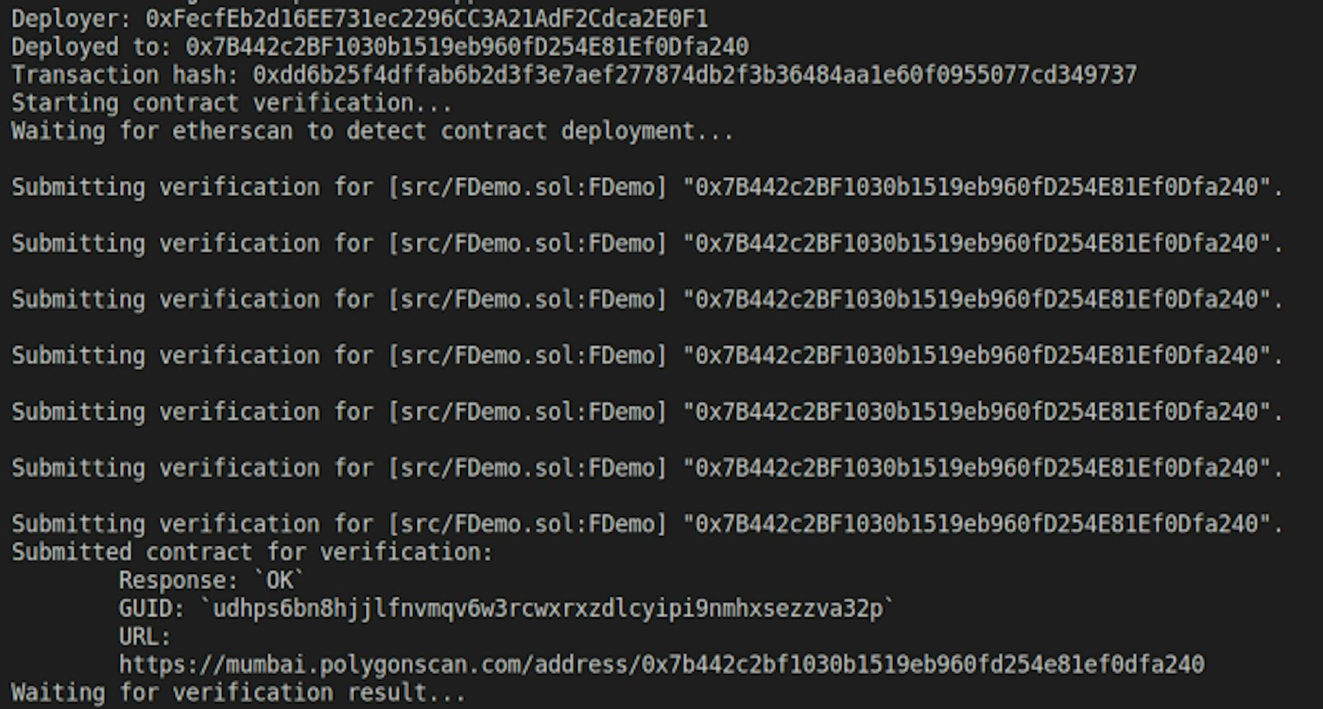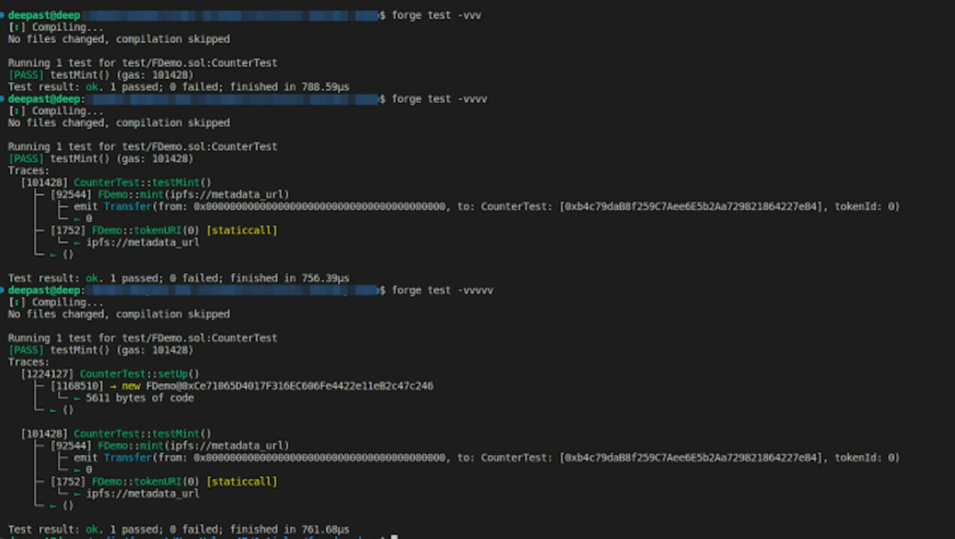 Foundry is a blazing fast, portable and modular toolkit for Ethereum application development written in Rust. Foundry is made up of three components: : Ethereum testing framework (like Truffle, Hardhat, and DappTools). Forge : CLI for interacting with EVM smart contracts, sending transactions, and getting chain data. Cast : local Ethereum node, similar to Ganache or Hardhat Network. Anvil Why Should We Use It? It’s speedy, no more wasted time while running tests. It allows you to write tests in solidity which minimizes context switching. Many testing features like fuzzing, console.log, and cheat codes give you more power and flexibility. Topics We Are Going to Cover in This Article Project setup How to install dependencies in Foundry (EX. OpenZeppelin) Integrating Foundry with VSCode Writing the contract and test cases using Foundry Understanding Traces in Foundry Generating Gas report using Foundry Deploying the contract using Foundry Installation Installation of Foundry is well explained in the foundry book, check out the instructions here: https://book.getfoundry.sh/getting-started/installation?embedable=true Setting up the Project Once the foundry is installed, we can create a new project using. forge init foundry-demo // forge-demo is name of the project Once the project is created, use commands to check if everything is working correctly. cd foundry-demo && forge build Installing Dependencies Forge manages dependencies using by default, which means that it works with any GitHub repository that contains smart contracts. git submodules To use we need to install it as a dependency in our project, to do so use the command. OpenZeppelin, forge install OpenZeppelin/openzeppelin-contracts // forge install is command which is used for installing dependencies // <https://github.com/OpenZeppelin/openzeppelin-contracts> // use {{username}}/{{repo_name}} from the github url Integrate Foundry With VSCode After installing as a dependency, try importing something from it in the contract (your contract is there under the /src directory), If you are using VSCode, an error will pop up. OpenZeppelin To fix this error, Run this command. forge remappings > remappings.txt What this command does is it creates a remappings.txt file inside the root directory of the project. At this moment, the content in the file might look like this: ds-test/=lib/forge-std/lib/ds-test/src/ forge-std/=lib/forge-std/src/ openzeppelin-contracts/=lib/openzeppelin-contracts/contracts/ For more details, visit here https://book.getfoundry.sh/config/vscode Writing the Contract Rename the file → ; the code for our ERC721 smart contract is as below. src/Counter.sol src/FDemo.sol // SPDX-License-Identifier: UNLICENSED pragma solidity ^0.8.13; import "openzeppelin-contracts/token/ERC721/extensions/ERC721URIStorage.sol"; import "openzeppelin-contracts/utils/Counters.sol"; contract FDemo is ERC721URIStorage { using Counters for Counters.Counter; Counters.Counter private _tokenId; constructor() ERC721("FDemo", "FD") {} function mint(string memory tokenUri) external returns (uint256) { uint256 newTokenId = _tokenId.current(); _mint(msg.sender, newTokenId); _setTokenURI(newTokenId, tokenUri); _tokenId.increment(); return newTokenId; } } Testing the Contract Using Foundry Let's start by renaming the test file to match the name of our contract → Counter.t.sol FDemo.t.sol Forge uses the following keywords in tests: : An optional function invoked before each test case is run. setUp function setUp() public { testNumber = 42; } : Functions prefixed with are run as a test case. test test function testNumberIs42() public { assertEq(testNumber, 42); } : The inverse of the test prefix — if the function does not revert, the test fails. testFail function testNumberIs42() public { assertEq(testNumber, 42); } So, right now, we only have one method , so we will be writing a test case for this method, mint and this is going to be a pretty simple one. // SPDX-License-Identifier: UNLICENSED pragma solidity ^0.8.13; import "forge-std/Test.sol"; import "../src/FDemo.sol"; contract FoundryDemoTest is Test { FDemo instance; function setUp() public { instance = new FDemo(); } function testMint() public { string memory dummyTokenUri = "ipfs://metadata_url"; uint256 tokenId = instance.mint(dummyTokenUri); assertEq(dummyTokenUri, instance.tokenURI(tokenId)); } } Now, to run this test, we can use the command forge test If we want to explore more details/ events/ flow about the test cases, we can use Traces to enable Traces while running test cases use -vvv or -vvvv The attached screenshot shows the result of test cases with and without traces. More details on the Traces: https://book.getfoundry.sh/forge/traces Generating Gas Report Using Foundry To generate a gas report, use with the test command. — gas-report forge test --gas-report More details on the Gas Report here: https://book.getfoundry.sh/forge/gas-reports Deploying and Verifying Contracts With Foundry Forge can deploy smart contracts to a given network with the command. forge create Some options we can use with forge create while deploying the contract. : Rpc URL of the network on which we want to deploy our contract (in our case, we will be using the RPC URL of polygon Mumbai testnet) —rpc-url : Pass arguments to the constructor constructor-args : Private key of deployers wallet private-key We can optionally pass && if we want to verify our contract. --verify --etherscan-api-key $ forge create --rpc-url <your_rpc_url> \\ --constructor-args "ForgeUSD" "FUSD" 18 1000000000000000000000 \\ --private-key <your_private_key> src/MyToken.sol:MyToken \\ --etherscan-api-key <your_etherscan_api_key> \\ --verify Let's deploy, now. forge create --rpc-url <https://rpc.ankr.com/polygon_mumbai> --private-key <your_private_key> src/FDemo.sol:FDemo --etherscan-api-key <your_etherscan_api_key> --verify Complete code: GitHub 💡 Follow me on Twitter for more awesome stuff like this @pateldeep_eth Linkedin Also p