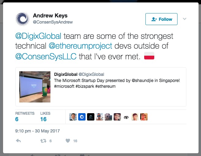 KC Chng (CEO) ETC Refund We are happy that the refund process has executed as expected. To any users who still have issues redeeming their rightful ownership of ETC due to the unintended consequences of the hard fork, please ping us on Slack or reddit, and we will do our best to respond to you as soon as we can. Some of the common issues encountered and clarifications: not enough ETC gas for calling the redemption function. Please make sure you have enough ETC to do so. DGD-Redemption tokens are distributed to the same address (where DGDs are kept on the main chain at block #3,800,000) on the classic chain. When you generate your private keys on the main chain, you also have ownership of the same keys and public address on the classic chain. If you are using Mew with a Trezor or Ledger Nano , please make sure your HD Derivation path is similar on the ETC chain as it is on the ETH chain. Refund will be ongoing for a year before DGD token holders decide what to do with the unclaimed balances. Please see the guide if you have not already done so at https://github.com/DigixGlobal/etc-redemption/blob/master/guide/GUIDE.md Regular development updates will resume as the main message for the past 2 weeks was to have everyone aware and focused on the ETC refund. We have also included what was done for the past 2 weeks as well in this week’s update. Path forward Concurrently with the security audit done by Smartpool founders, we are working on integrating the front end of our marketplace with our core contracts. We expect minor changes, if not, none, to our core contracts. Digix has also begun looking for additional core developers to join our team. Stay tuned for further announcement of new hires within the next 2 months. Several new partnerships are in the works in preparation for the launch of our marketplace. We will follow up with some new announcements this coming week. Community building efforts Shaun Djie, Digix’s CCO, took the time to present Digix’s journey and tech stack at a Microsoft’s Start Up Day sponsored event last week at BASH@71 Ayer Rajah. We were very happy to see that the number of blockchain enthusiasts growing in Singapore. http://www.spiffy.sg/startup/leveraging-blockchain-technologies-with-digix-global-at-bash-chope-microsoft-startup-days/ We also hosted Indorse and Status.im at the SGI offices to a full turnout last week. At SGInnovate This coming monday, Michael Wheuler from & would be presenting their product at a ConsenSys Asia Pacific sponsored event. Please catch the live stream at INFURA MetaMask https://www.youtube.com/watch?v=N784-1G6ZZY&ab_channel=DigixGlobal Anthony Eufemio (CTO) Security Audits The security audits are currently ongoing with . We have been in private discussions about the codebase and working closely together to complete this very important step before our launch. Smartpool.io Code Quality Audits We are going to be engaging DappHub to perform a separate audit of our codebase that deals with the code quality. The focus of this audit is not to find security vulnerabilities which is the scope of the security audits performed by SmartPool but to ensure that our codebase is coherent, has good test coverage, and bug free. Marketplace Update This week we will be describing the set of user stories that will be needed to complete the development of the Digix Gold Marketplace. The Marketplace consists of a few server side APIs that allow us to handle customer physical gold bar orders, uploading and approval of KYC documents, as well as the back-office services which will be consumed by the Spectrum enhanced version of our Marketplace. Chris Hitchcott (Digix Core Dev) MAY 7 What a fun packed week it’s been. Many projects worked on, including the ETC Redemption Dry Run deployment and code review (thanks Vincent), Digix Explorer Interface (+ integration with Vendor & Custodian views), IPFS coolness and general tweaking and testing. Let’s start off with IPFS: one nice improvement is that we’re figured out a better way of storing proof of asset docs on IPFS. Admittedly kind of obvious, instead of saving the hash of the PoA document on chain, we’re now saving the hash of a JSON file containing metadata to (potentially many) other data fields, including other IPFS content hashes. This linked data structure means we get infinite storage and flexibility in terms of what is uploaded as proof of asset (such as the ability to store picture galleries, videos, etc) with infinite future-poofing and no extra Solidity. Nice pattern! One more IPFS related thing is that we’re going to be publishing deployments of spectrum on IPFS now and then as we roll out test DGX 2.0 features (like the assets explorer). Which brings me to the assets explorer: I’ve completed an MVP for the explorer view and actions in the DGX 2.0 PoA system. Multiple categories, ID searching, Pagination, Sorting, it has it all. It’s also more closely integrated with the other Vendor and Custodian views, which also had an API update, and inherits the pagination and sorting. IPFS DEPLOYED DEMO RELEASE: https://gateway.ipfs.io/ipfs/QmPFrQEtrF9gtYAMFFdGRnPw3Bos5aMPCVEeZQjTdoxBeN/ Next week I’ll be working on integrating a multisig wallet into Spectrum, not just as a dapplet, but as an *account type*, which means it’ll be cleanly integrated into just about every transaction type, and provide a really neat UI for multisig transactions, which can be initiated by any of the existing keystore types (including hardware wallets). MAY 19 This week I have been implementing the MultiSig keystore type for Spectrum, using Consensys’ contract (which is being used by the Golem team to store ~440,000+ ETH). https://github.com/ConsenSys/MultiSigWallet This feature allows for the deployment and management of this contract, and seamlessly integrates into Spectrum’s existing accounts system. Uniquely, the multisig keystore type will automatically ‘proxy’ a given transaction, automatically find
