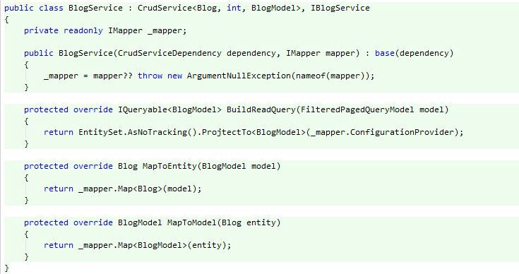 is a Lightweight and Extensible Infrastructure for Building High Quality Web Applications Based on ASP.NET Core and has the following goals: DNTFrameworkCore Common structures in various applications like Cross-Cutting Concerns and etc Follow DRY principle to focus on main business logic Reduce the development time Less bug and stop bug propagation Reduce the training time of the new developer with low knowledge about OOP and OOD Blog Entity CRUD API Blog Entity CRUD Service Features This Framework has the various features that I list them in below: Automatic Input Validation and Business Validation Automatic Transaction Management Eventing Aggregate Update (Master-Detail) with TrackingState mechanism Automatic Numbering Functional Programming Error Handling instead of using exception for flow control Dynamic Permission Authorization CrudService CrudController DbLogger Provider Auditing DataProtectionKeys DbRepository Name-Value Setting Management Hooks SoftDelete MultiTenancy Tracking mechanism (CreatorUserId,CreationDateTime,LastModifierUserId,…) FluentValidation Integration BackgroundTaskQueue CQRS (coming soon) EntityHistory (coming soon) Installation To create your first project based on DNTFrameworkCore you can install the following packages: PM> Install-Package DNTFrameworkCorePM> Install-Package DNTFrameworkCore.EntityFrameworkPM> Install-Package DNTFrameworkCore.EntityFramework.SqlServerPM> Install-Package DNTFrameworkCore.WebPM> Install-Package DNTFrameworkCore.Web.EntityFrameworkPM> Install-Package DNTFrameworkCore.FluentValidationPM> Install-Package DNTFrameworkCore.Web.MultiTenancy OR 1- Run the following command to install a template based on ASP.NET Core Web API and DNTFrameworkCore: boilerplate project dotnet new --install DNTFrameworkCoreTemplateAPI::* 2- Create a new project with installed template: dotnet new dntcore-api Now you have a solution like below that contains complete identity management features including user,role and dynamic permission management and also integrated with persistent JWT authentication mechanism: Multi Project Solution Introducing various projects in installed template project contains “Domain Model” of your application. For example, anemic domain model of identity management system was designed in this template. Domain project contains DbContext, Mapping and EF Core Migrations. Infrastructure project contains DTOs/Models that related to domain entities, validators, application services and event handlers. Application project contains resx files. Resources project contains unit tests for your application. for example, you can see UserValidatorTests and RoleValidatorTests results in the following picture: UnitTests project contains integration tests for your application. for example, you can see RoleServiceTests and UserServieTests results in the following picture: IntegrationTests project contains Controllers, Hubs and JWT authentication infrastructure. as example, you can see RolesController, UsersController and AuthController in the following picture: API In the end, if this infrastructure was useful, share it.