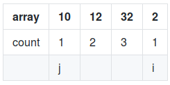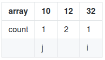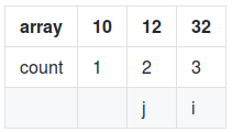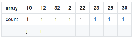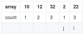 Now I’m adding the next number, 22 and check for 10, 12, 32, similar to the previous one, for 10 and 12, count of 22 is incremented to 3 and with 32 it fails and remains as 3, and j is incremented to point 2.