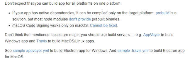 This can be quite confusing and shocking, but cheap and easy multi platform builds are a myth. It is almost ironical how often one will find âcross platformâ Electron applications that are âonly for Macâ or âonly for Windowsâ. The reason is not that itâs complicated to write code for multiple platforms (Electron handles it amazingly well and the documentation is clear). The reason is simply that many developers do not have the big budget or access to other hardware to test and build on. Even worse: if you plan to be a âlegitimate developerâ your app needs to be signed and it might have one or more native dependencies.