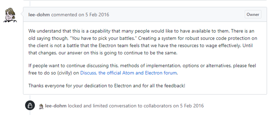 Files donât get obfuscated, encrypted or protected by default which means someone who wants to temper with an app can pretty much receive the working copy of the repository. This makes Electron a very poor fit for commercial solutions.