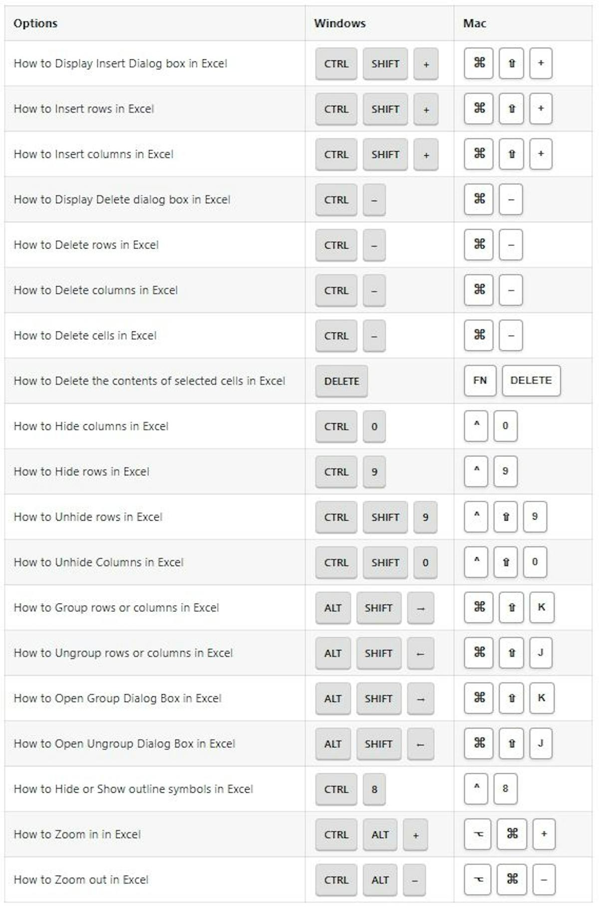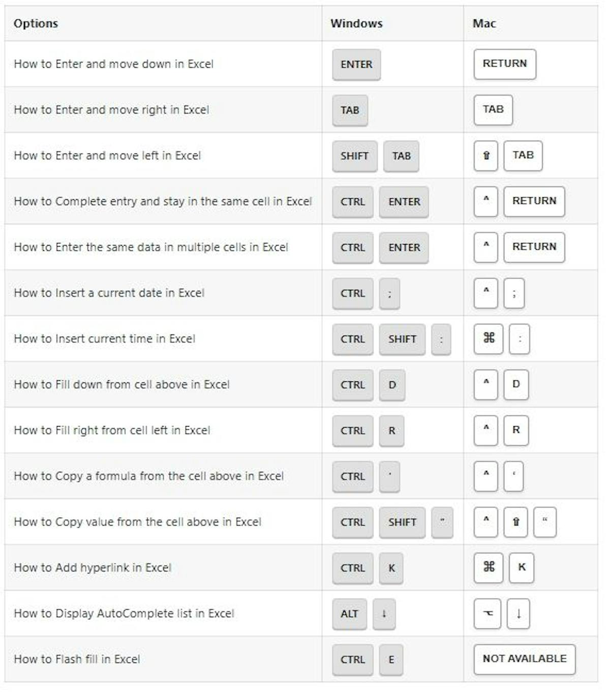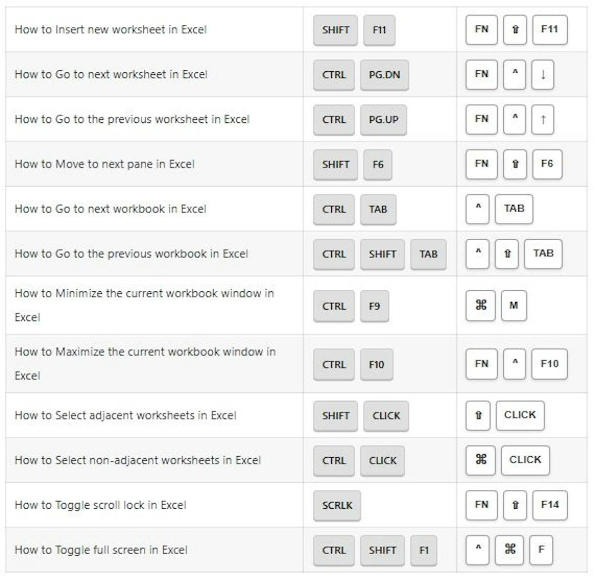In this tutorial, you’ll find a complete and updated list of Excel shortcuts to help you work more efficiently. From basic navigation to advanced data operations, this tutorial covers everything you need. It includes shortcuts for both Windows and Mac users. complete and updated list of Excel shortcuts Windows Mac File Options Shortcuts: Ribbon Options Shortcuts: General Options Shortcuts: Table & Filters Options Shortcuts: Drag & Drop Options Shortcuts: Navigation Options Shortcuts: Selection Options Shortcuts: Active Cell Options Shortcuts: Extend Selection Options Shortcuts: Select Special Options Shortcuts: Cell Edit Mode Options Shortcuts: Entering Data Options Shortcuts: Formatting Options Shortcuts: Number Formatting Options Shortcuts: Border Options Shortcuts: Formula Options Shortcuts: Grid Options Shortcuts: Pivot Tables Options Shortcuts: Workbook Options Shortcuts: Dialog Boxes Options Shortcuts: Other Options Shortcuts: That’s it. This tutorial is originally published on {230+} Excel SHORTCUTS List for Windows & MAC {230+} Excel SHORTCUTS List for Windows & MAC