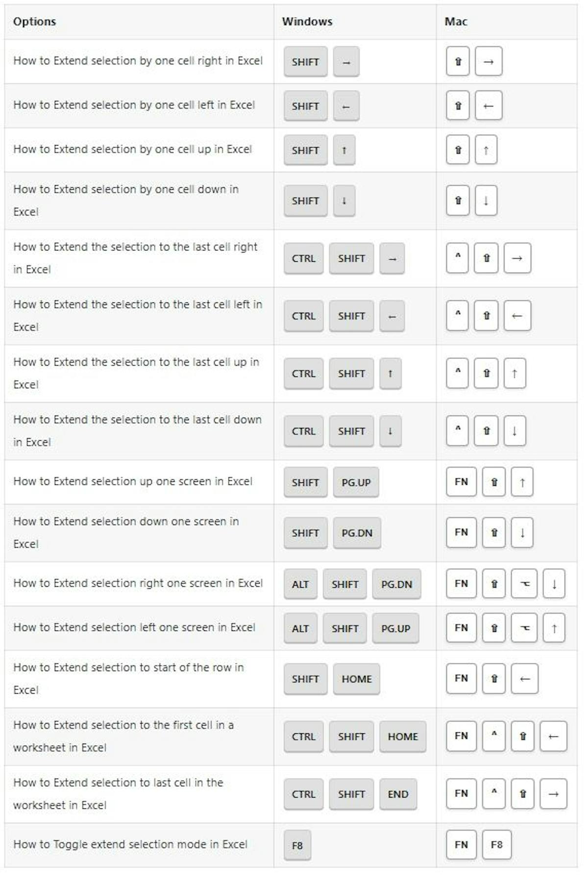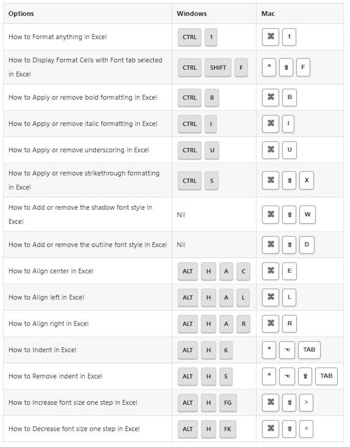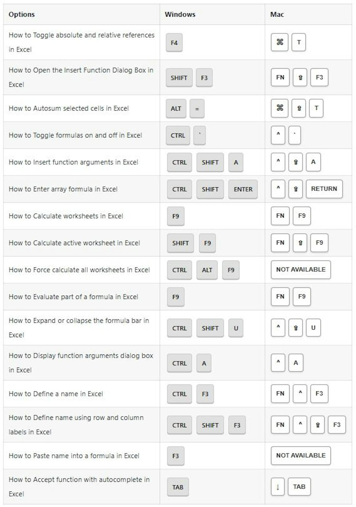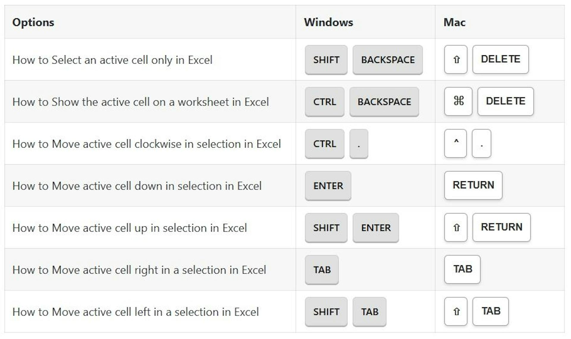 In this tutorial, you’ll find a complete and updated list of Excel shortcuts to help you work more efficiently. From basic navigation to advanced data operations, this tutorial covers everything you need. It includes shortcuts for both Windows and Mac users. complete and updated list of Excel shortcuts Windows Mac File Options Shortcuts: Ribbon Options Shortcuts: General Options Shortcuts: Table & Filters Options Shortcuts: Drag & Drop Options Shortcuts: Navigation Options Shortcuts: Selection Options Shortcuts: Active Cell Options Shortcuts: Extend Selection Options Shortcuts: Select Special Options Shortcuts: Cell Edit Mode Options Shortcuts: Entering Data Options Shortcuts: Formatting Options Shortcuts: Number Formatting Options Shortcuts: Border Options Shortcuts: Formula Options Shortcuts: Grid Options Shortcuts: Pivot Tables Options Shortcuts: Workbook Options Shortcuts: Dialog Boxes Options Shortcuts: Other Options Shortcuts: That’s it. This tutorial is originally published on {230+} Excel SHORTCUTS List for Windows & MAC {230+} Excel SHORTCUTS List for Windows & MAC