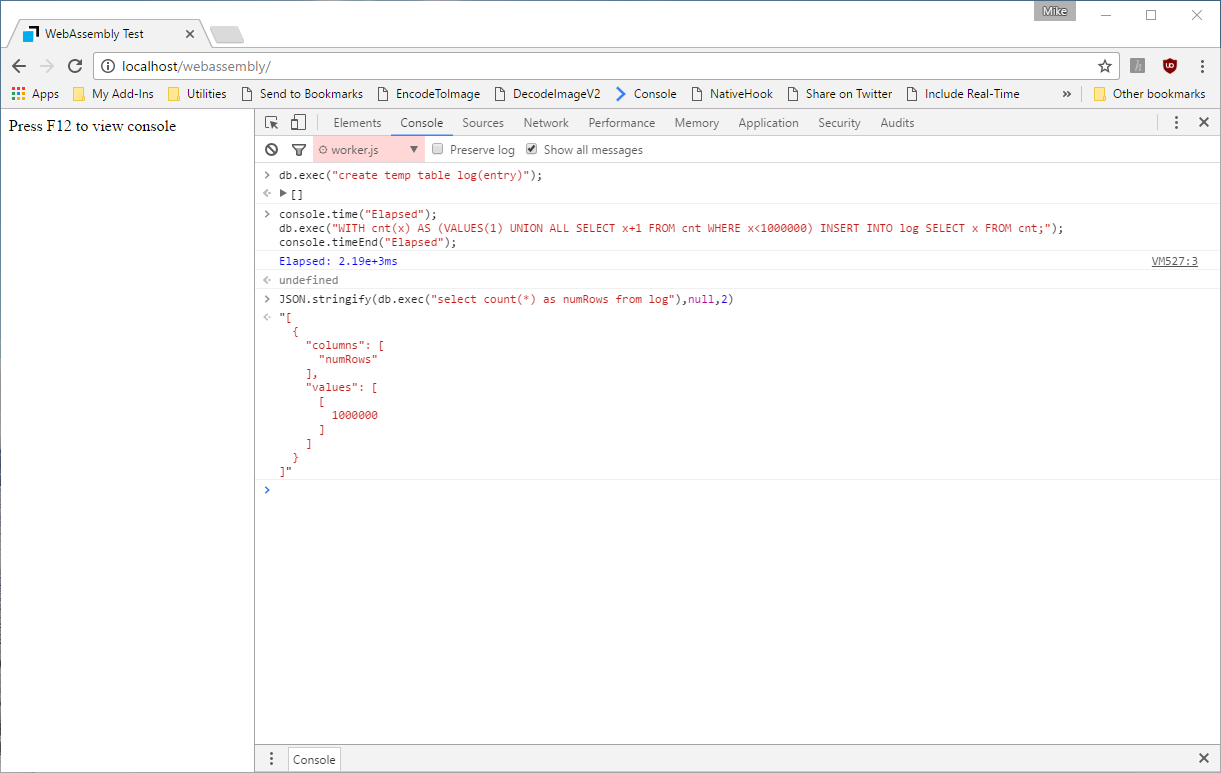 That’s a pretty long title but hopefully it caught your attention! I’ve always been fascinated by what can be achieved in terms of HTML and in the . The amazing work being done by browser vendors on JavaScript performance is nothing short of amazing. With each iteration of Chrome V8, Microsoft Chakra, Mozilla SpiderMonkey and Apple JavaScriptCore, JavaScript performance narrows the gap with native code execution. JavaScript browser WebAssembly ( ) is the latest innovation that brings us one step close to true native code execution in the browser. I wanted to see just how far we have come so I threw together an example that tests a realistic code base, in this case, the Sqlite database — . For my test, I used the Emscripten compiled version of sqlite found here — . http://webassembly.org/ http://sqlite.org/ https://github.com/kripken/sql.js/ My tests are using the latest version of Chrome Canary with the following flag set to enabled: chrome://flags/#enable-webassembly My test machine is a Dell XPS desktop with : Processor Intel(R) Core(TM) i7–4770 CPU @ 3.40GHz, 3401 Mhz, 4 Core(s), 8 Logical Processor(s) 24 Gigs of RAM256 SSD Drive I created 2 files, the main index.html <html><head><title>WebAssembly Test</title><script> var aListeners = [];var results=[];var times=[];var workers=[]; //load up our workersfor(var i=0;i<8;i++){workers[i]=new Worker("worker.js");workers[i].onmessage = function (oEvent) {if (aListeners[oEvent.data.id]) { aListeners[oEvent.data.id](oEvent.data.evaluated,this); }delete aListeners[oEvent.data.id];};} function getRandomWorker(arr) {return arr[Math.floor(Math.random()*arr.length)];} var asyncEval = (function () {return function (worker, sCode, fListener) {aListeners.push(fListener || null);worker.postMessage({"id": aListeners.length - 1,"code": sCode});}; })(); //Our test functionfunction test(numReq,code) {console.time("Total_Elapsed");times=[];results=[];times.push((new Date()).valueOf());var num=numReq || 10000;for(var i=0;i<num;i++) {asyncEval(getRandomWorker(workers),code || "Date()", function (result,worker) {times.push((new Date()).valueOf());results.push(result);if(results.length==num) {console.timeEnd("Total_Elapsed");console.log("Processing Time for all workers: "+(parseInt(times[times.length-1])-parseInt(times[0])).toString()+"ms");var numRequests=results.length*parseInt(results[0].split(": ")[1]);console.log("Total sql statements processed: "+numRequests);}});};return "Executing test ...";}</script></head><body>Press F12 to view console</body></html> and the Web Worker script worker.js importScripts("sql.js"); //Init sqlite databasevar db = new SQL.Database(); //Our test functionvar run_sql=function(numReq,sql) {var n=numReq || 10000;var results=[];var elapsed=0;var stmt = db.prepare(sql || "select datetime() as dt;"); var start = (new Date()).getTime();for(var i=0;i<n;i++) {var rows = stmt.getAsObject({});results.push(rows);if(results.length==n) {var end = (new Date()).getTime();elapsed="Elapsed sql statement:"+(end-start).toString()+" ms #Rows: "+results.length.toString();}}stmt.free(); return elapsed;} //Run code to init JIT compilationrun_sql(); //Message Handleronmessage = function (oEvent) {postMessage({"id": oEvent.data.id,"evaluated": process(oEvent.data.code)});} function process(code) {var result=null;try {result=eval(code); }catch(e){result = "Error: "+e.message;}return result;} To run the test, you need to host the three files, on a web server. I’m using IIS on my Window’s machine but any static web server on any OS should do. index.html, worker.js and sql.js When you first load index.html, you get a simple message telling you to access the development tools in the browser. On my machine, it looks like this The first thing you will notice is the fine folks working on Chrome takes care of converting sql.js into WebAssembly. The details of how all this works are beyond the scope of this article but you can find out more here: https://github.com/kripken/sql.js and here _To compile to WebAssembly, we will at the moment need to compile LLVM from source. The following tools are needed as a…_webassembly.org Developer's Guide - WebAssembly To run our first test, we type the following into the developer console: test(1,"run_sql(1000,'select datetime() as dt;')") This executes the SQL statement 1000 times in a loop within one Web Worker. The results on my machine are as follows: ‘select datetime() as dt;’ So we processed 1000 SQL requests in 8.29 milliseconds. Let’s try it with 10,000 SQL requests in a single web worker: So we processed 10,000 SQL requests in 67 milliseconds. Since I have 8 cores on my machine, I configured 8 web workers, so lets run the test again, spread across these web workers: So we can process 10,000 SQL requests in roughly half the time using web workers. How about 100,000 SQL requests: Not too bad, 100,000 SQL requests in ~ 211 milliseconds. The title of the article talks about doing millions of SQL requests in a few seconds so let’s run the test for 1,000,000 SQL requests: On my machine, it takes ~ 2 seconds to run a million SQL select statements! How about database inserts? The following code inserts a million records into a SQL table: So … ~ 2.2 seconds to insert a million rows in a table That’s pretty darn impressive and WebAssembly is just in it’s infancy. Obviously, these tests are very simple and depending on the nature of your SQL application, your results may vary. It does illustrate, however just how far we have come in terms of raw JavaScript performance in the browser. I’d love to hear your feedback so please recommend the article to your followers :-)