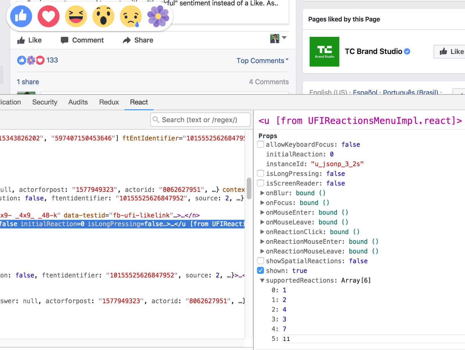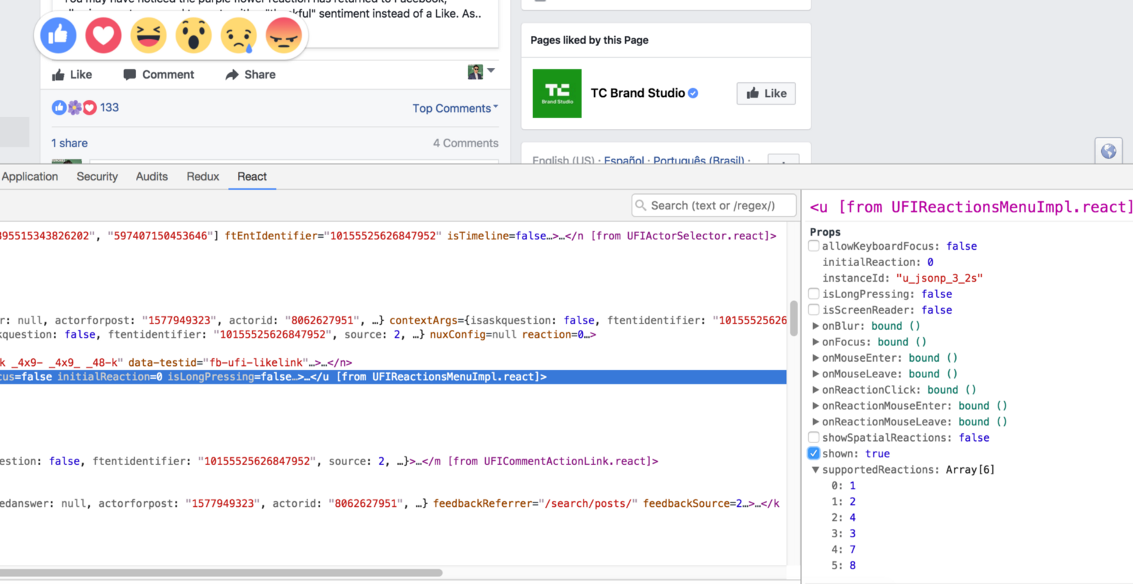 As you can see from the screenshot above, on the right side, ‘UFIReactionsMenuImpl.react’ is one of the main components that handles the Reactions-interactions. If you look closely, you can see that one of the props is an array called supportedReactions. Bingo. From here I figured out that the numbers map to the Reaction’s type ID. 1 is ‘Like’, 2 is ‘Love’, etc. The last ID is 8, but what happens if it’s changed to something else?