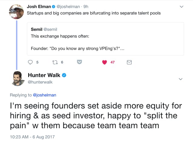 As you can see, Weekend VC Twitter gets pretty wild and crazy!!!! But employee option pool is important enough that I wanted to briefly expand upon my comment above. Employee options pools, typically created at the point of financings, shouldn’t be treated as haggling over dilution, but rather a strategic resource that will help founders build the best team and, by extension, a more valuable company. Satya and I rarely see less than a 10% pool created at seed and Series A, but are increasingly engaging with founders about 12–15% pools, especially if you’re going to be hiring in-demand engineers (computer vision, AI) and/or (more typically post Series A), building out a senior executive team. While you should expect these sorts of hires to take below market cash comp versus what Google is paying them, this tradeoff needs to be replaced with equity upside. Since typically leads/co-leads seed rounds, we assist in helping founders design and manage their pool against their hiring forecast. No one wants to run out of equity pool midway between financings (and larger seed rounds these days usually means more hiring pre-A)! As a result we’re often amenable to a CEO suggesting, “hey, I’ve thought about it and I’d actually like to create a 12% pool instead of a 10% one. What if we split the pain [ie increase pre-money valuation slightly on our end and founders take slightly more dilution off their end]?” To me these types of conversations, when backed by a hiring plan, show real maturity and proactively valuing the construction of a high quality team. Homebrew Of course these conversations also work best when both the founders and investors have had a productive, give-and-take negotiation up to this point. If I’ve been stretched to my absolute limit on pricing and beaten up a bit, it’s less likely I can dig deeper for these other points, even if I think they’re overall constructive. There just may not be any more flesh to give! But in most cases it’s worth at least engaging with your investors around strategic pool creation rather than just termsheet defaults. My Blog | Twitter | Snapchat | Medium | LinkedIn | Facebook | Instagram