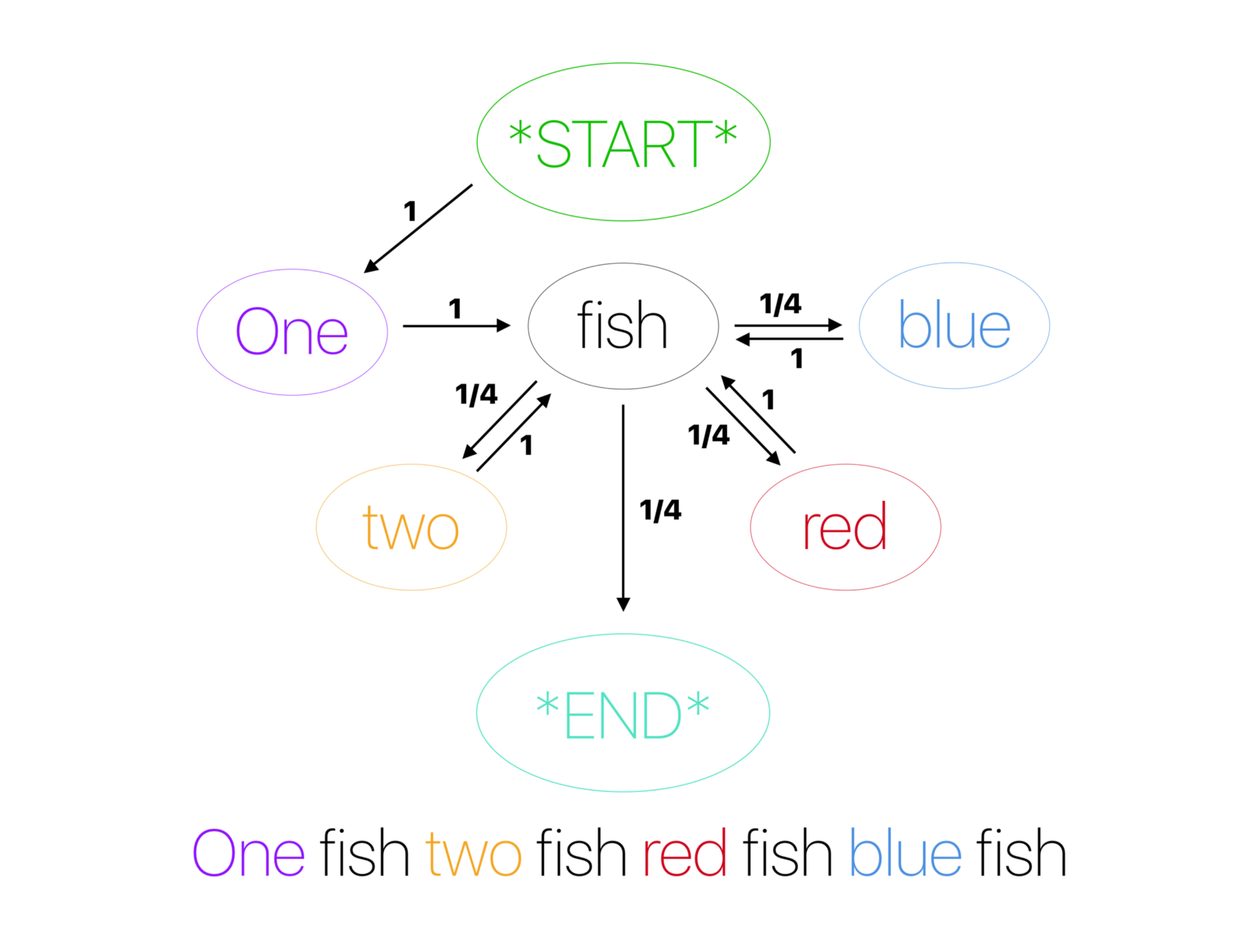 To be honest, if you are just looking to answer the age old question of “what is a Markov Model” you should take a visit to Wikipedia (or just check the TLDR 😉), but if you are curious and looking to use some examples to aid in your understanding of a Markov Model is, Markov Models Matter, and a Markov Model stick around :) what why how to implement Show > Tell “In , a is a used to randomly changing systems where it is assumed that future states depend only on the current state not on the events that occurred before it (that is, it assumes the ). Source: TLDR: probability theory Markov model stochastic model model Markov property https://en.wikipedia.org/wiki/Markov_model Roadmaps are great! Check out this for this article’s roadmap 🚗 table of contents Table of Contents A. Intro To Markov Models 👶 1. Starter Sentence2. Weighted Distributions 3. Special Additions4. a Markov Model Works5. Full Example Summary How B. Further Markov Model Topics 😼 1. Larger Example2. Distribution 3. Bigger Windows C. Implementation - Python 🐍 1. Dictogram Data Structure 2. Hash Table Data Structure 3. Markov Model Structure 4. Parse Markov Model D. Further Readings, Suggestions, Thoughts 💚 1. Applications2. Further Reading3. Final Thoughts Intro To Markov Models (☝️ 🐠 ✌️ 🐠 ⭕️ 🐠 🌀 🐠) | Definitely the best way to illustrate Markov models is through using an example. In this case we are going to use the same example that I was also presented when learning about Markov Models at . 1. Starter Sentence Make School “One fish two fish red fish blue fish.” -Dr. Seuss 🎩 | Before we jump into Markov models we need to make sure we have a strong understanding of the and . 2. Weighted Distributions given starter sentence, weighted distributions, histograms Starter Sentence Cool, our starter sentence is a well known phrase and on the surface nothing may explicitly jump out. But we are going to break it down and look at what this exact sentence. Specifically, it consists of eight words ( ) but only five unique words ( ). composes tokens keys Colored Starter Sentence Here I gave each unique word ( ) a different color and on the surface this is now just a colored sentence…but alas, there is more meaning behind coloring each differently. By coloring each unique differently we can see that certain appear much more often than others. key key key keys Distribution of keys By looking at the above of we could deduce that the fish comes up 4x as much as any other This type of statement can led us to even further predictions such as if I randomly had to pick the next word at any point in the starter sentence my best guess would be saying “fish” because it occurs significantly more in the sentence than any other word. 💯In our situation are the percentage that one key will appear is based on the total amount of times a key shows up divided by the total amount of tokens. For example, the weighted distribution for fish is 50% because it occurs 4 times out of the total 8 words. Then One, two, red, blue all have a 12.5% chance of occurring (1/8 each). distribution keys key key. weighted distributions are a way to represent weighted distributions, often they are a plot that enables you to discover the underlying frequency distribution of a set of continuous data. In our case the continuous data is a because a sentence consists of many words (continuous data). Histograms sentence Histogram for our starter sentence By looking at the of our starter sentence we can see the underlying distribution of words Clearly, fish appears more than anything else in our data set 🐠🐟 🐡🐠 histogram visually 👀 | Great! At this point you should be comfortable with the concept that our consists of many and Additionally, you should understand the relationship between a and . 3. Special Additions sentence tokens keys. histogram weighted distributions ✅💯✅ ✅💯✅ Extra Example A is any word in the sentence.A is a unique occurrence of a word. there are two and five The keys are “Fish” and “Cat” (🐠 and 😺). Then any word is a token.A is related to because a histogram visually shows the frequency of data in a continuous data set and in essence that is demonstrating the weighted distribution of the data. token key Example: “ Fish Fish Fish Fish Cat” keys tokens. histogram weighted distibutions ✅💯✅ ✅💯✅ End Cool, so now we understand our sentence at the surface and how certain words occur more than others But before we continue we need to add some special additions to our sentence that are hidden on the surface but we can agree are there. The and of the sentence… Start End Starter Sentence with Special Additions Awesome! Take a moment and check out the above “additions” to the sentence that exist. This may seem unnecessary right now, but trust me, this will make exponentially more sense in the next part where we dive into Markov models 😌. In summary, every sentence proceeds by an invisible “*START*” symbol and it always concludes with an “*END*” symbol. Distribution of Keys in Modified Example Above, I went ahead and recreated the same distribution of keys from earlier but included our two additional keys (*START* and *END*). | Fantastic! You already may have learned a few things, but now here comes the meat of the article. Lets start from a high level definition of a Markov Model is (according to ): 4. a Markov Model Works How What Wikipedia “A is a stochastic model used to model randomly changing systems where it is assumed that (that is, it assumes the ). Generally, this assumption enables reasoning and computation with the model that would otherwise be intractable.”- Markov model future states depend only on the current state not on the events that occurred before it Markov property Wikipedia Awesome! Sounds interesting…but what does that huge blob even mean? I bolded the portion of a Markov Model is. In summary, a Markov M