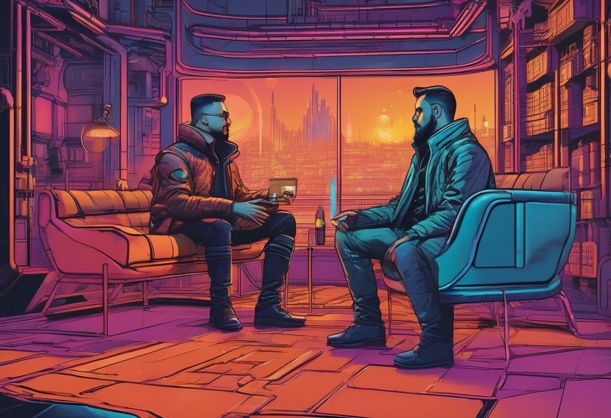 "a fireside chat between two men in a futuristic setting; cyberpunk style. More utopia, less dystopia."