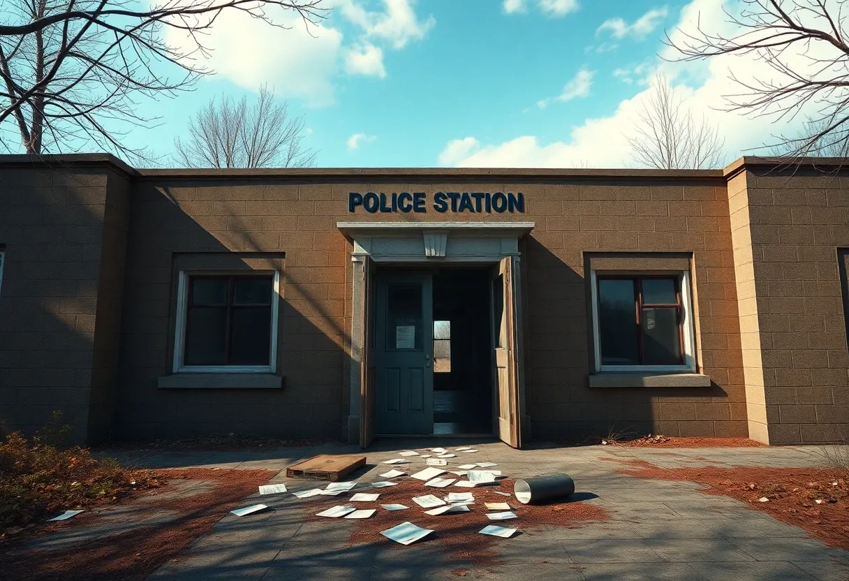 "A high-def cgi style image of the front of an abandoned police station during the apocalypse. The door is flung open. papers are on the ground outside. It looks like it was abandoned in a hurry."