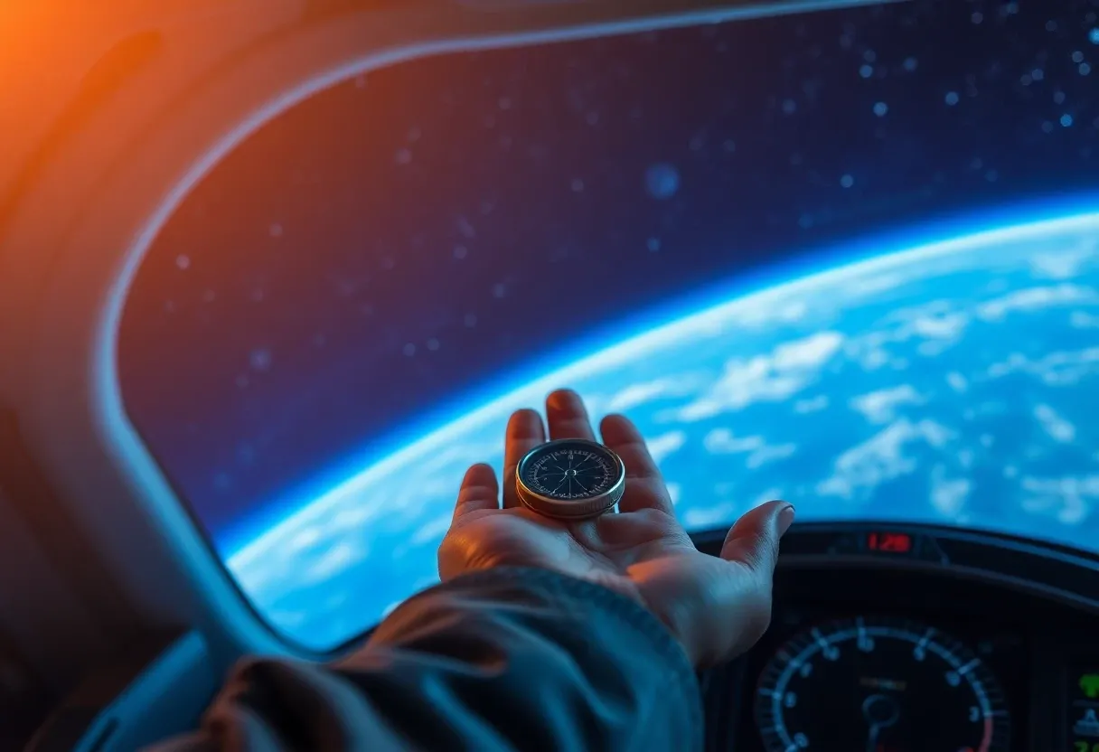 "a navigation compass in the palm of a space captain as he looks out into outer space"