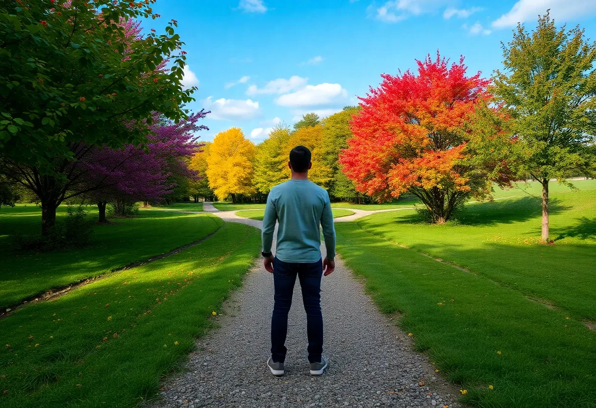 "a person standing in front of 3 different paths"