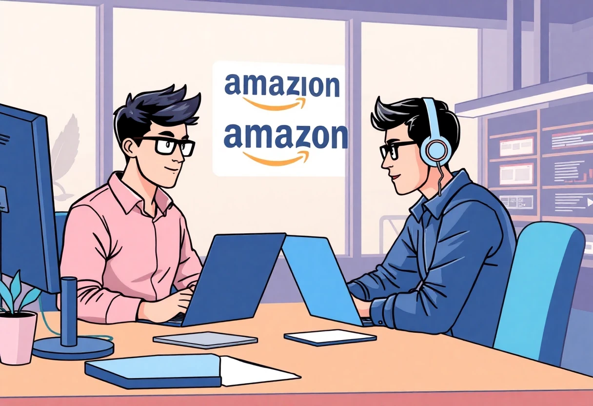 "A stylized illustration of Amazon developers choosing an internal AI coding tool over popular third-party services in a modern tech workspace."