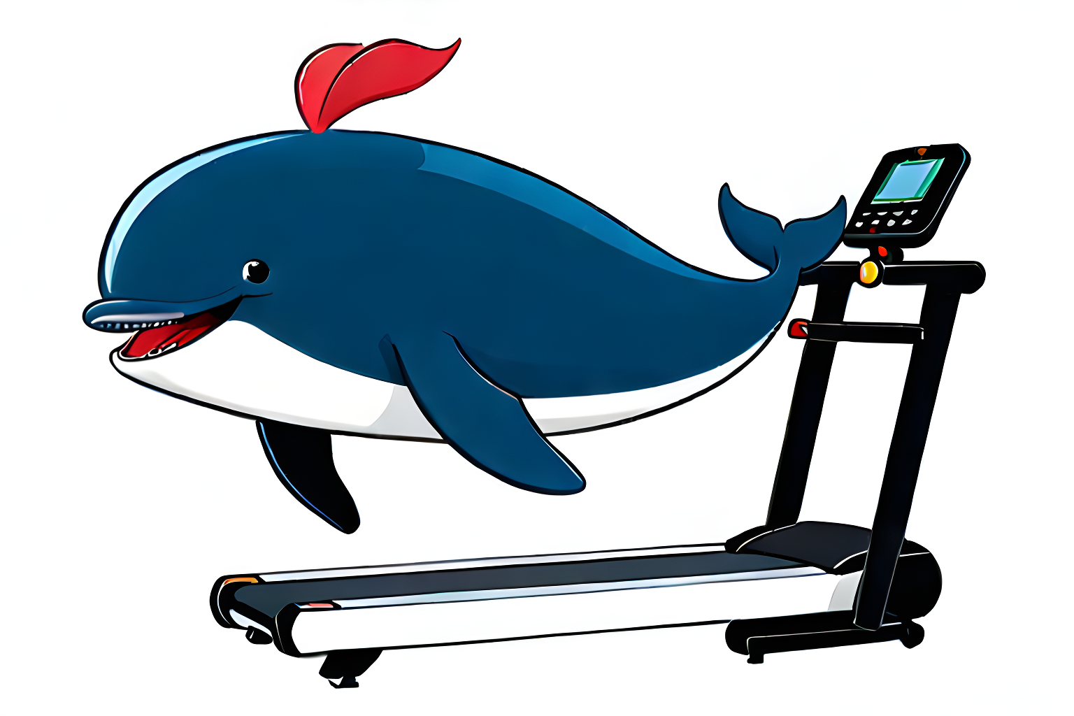 "cartoon whale with human legs and hands running on a treadmill machine"