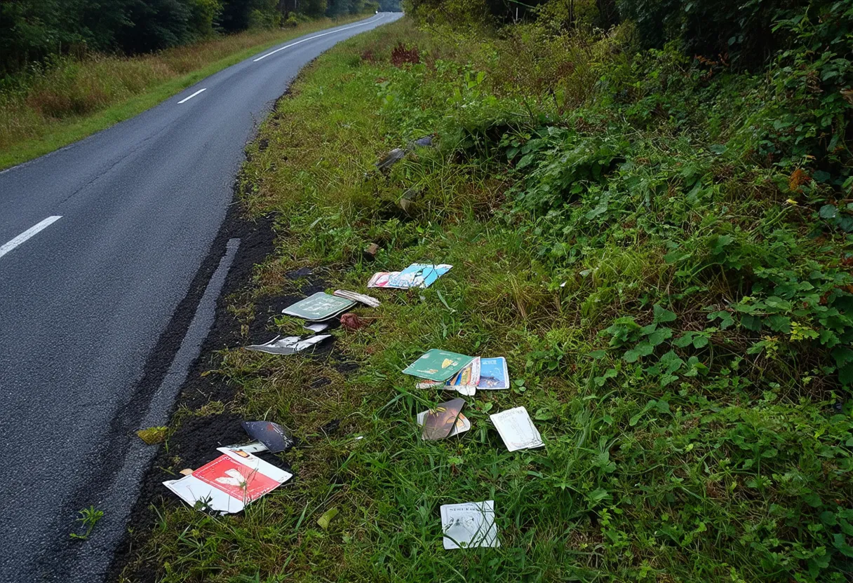 "on a highway in post apocalyptic canada, weeds, grass, moss and overgrowth grow onto a cracked and breaking highway road. The entire road is covered in the overgrowth. abandoned rotting cards lay strewn across the road"