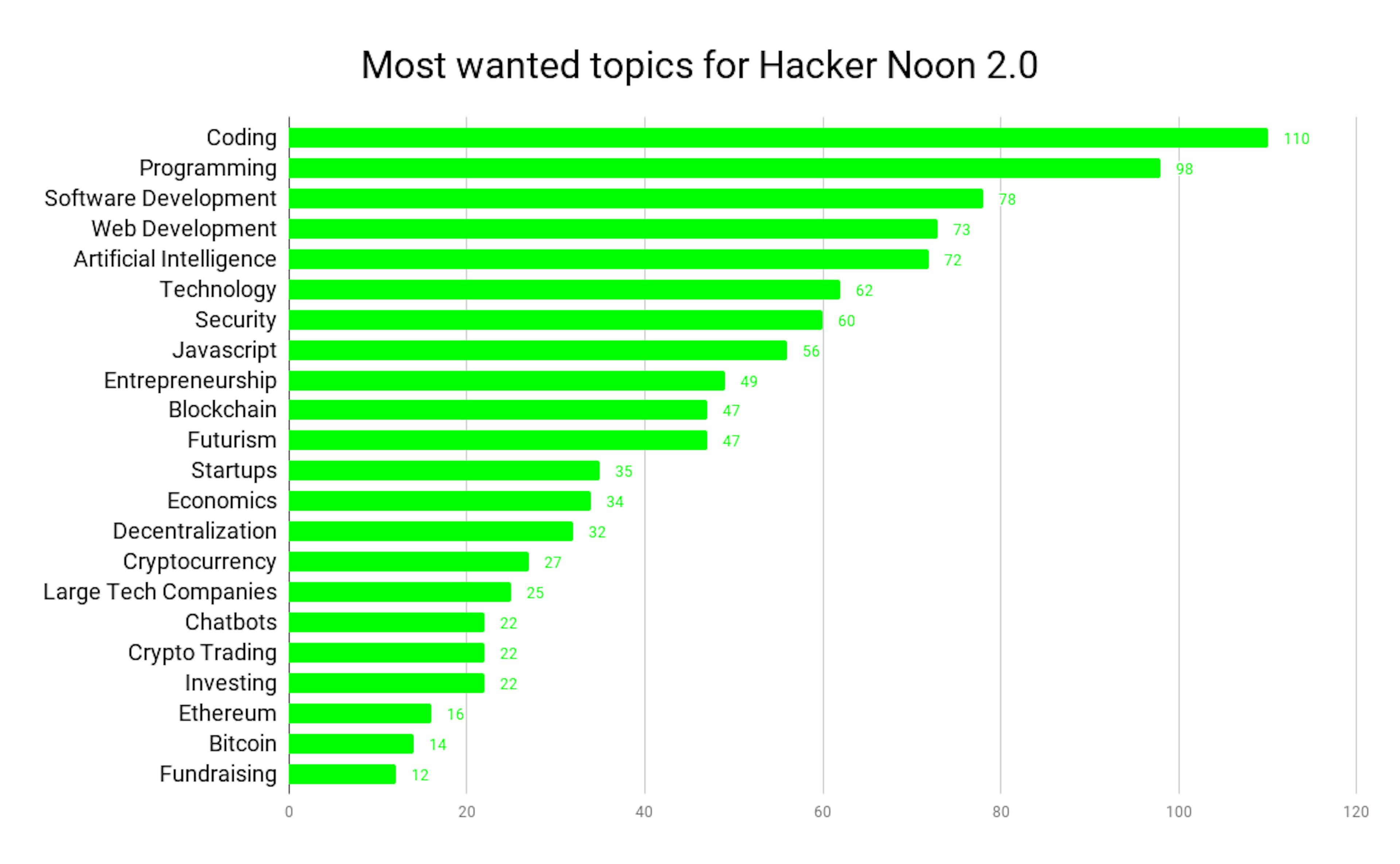 So sorry it took us this long to do it…. . We have our reasons Four months ago we started this to improve your experience reading on Hacker Noon. We have been pouring over the results, learning how we can improve our site. Hacker Noon Reader Survey It’s a long time coming, but I’m so excited to finally share the results with y’all. To find out who the winners for , an interview with our editor-in-chief , and two 0.5ETH prizes (it was a more glamorous prize when we announced the survey — oh the price of ETH) stay tuned to the end! our 3 prizes David Smooke But first, thank you to our who took time out of your day to answer the survey. Thanks to you, we are much better equipped to design Hacker Noon 2.0. If you’ve read recently, you know that Hacker Noon is planning to build our own Content Management System. We will around our publishing workflow and of course, around what YOU, the Hacker Noon readers, want. 412 respondents the story we share on our crowdfunding page build Hacker Noon 2.0 : how hackers make the most out of their mother-f***ing afternoon!!! Hacker Noon 2.0 1. What topic(s) are you currently reading on Hacker Noon? A lot of you read multiple topics on Hacker Noon. It’s interesting to me that the most true-and-trial stories on Hacker Noon are the long-form analyses of technical challenges. A lot of you mention reading Hacker Noon to “learn how to code”,“because I care about programming”, or, my favorite “to read any topic that can make me think big”. A majority of the articles featured on HN are interesting, and the lack of a “members only” paywall makes HN a daily stop. — says reader from Seattle, WA. 2. What topic(s) do you want more of? Aside from the expected topics that y’all already like to read in Hacker Noon 1.0, 4 topics stand out to me as deserving more attention in Hacker Noon 2.0: , , & . If you’d like to publish a story about these topics, . Security Futurism Decentralization Large Tech Companies please email Stories@HackerNoon.com We will definitely take these learnings and apply them to . One feature that I’m particularly pumped about is : people who demonstrate themselves to be experts by topic will have the power to curate pages, increase distribution and publish other writers. the design of Hacker Noon 2.0 the community editors Organize content by user selection! — say reader from NC, USA. 3. On a scale of zero to ten how likely are you to recommend Hacker Noon to a friend or colleague? This question essentially is for us to measure Hacker Noon’s NPS (Net Promoter Score). You calculate the score by subtracting the number of detractors (0–6) from the number of promoters (9–10) and divided by the number of total respondents. A NPS can have a value from -100 to +100. If your NPS is a positive number, it’s considered good. A score above 50 is considered excellent. Hacker Noon’s NPS is . 51.13 This means a lot to us. An NPS of 51.13 essentially means you trust us as a resource for your tech read, and we do not take that for granted. . Hacker Noon 2.0 will strive to be the best place for tech professionals to read & publish Some of my friends aren’t coders, but for tech oriented people then absolutely (I would recommend)— says a reader from the US. 4. Would you be interested in a standalone Hacker Noon app? This information helps inform us that a mobile app, though potentially useful, is not what most of Hacker Noon readers want at the moment. Today, the vast majority of readers read us on desktop. In Hacker Noon 2.0, we will optimize reading for both desktop & mobile users. And even though 47% is less than half, we have 200k+ daily readers, so if 47% used a standalone mobile app, there would still be a lot of readers more satisfied than they are today. An app would be nuts! Great articles. — says reader from Bavaria, Denmark. 4. Would you be interested in a Hacker Noon podcast? The responses to this question make me so happy! 71% of you say you want (and maybe need? :P) a podcast. ! We by , a long time Hacker Noon contributor who’s now the host of the . Check out the on Trent’s profile. And guess what? W e do have a podcast now acquired Crypto Disrupted Trent Lapinski Hacker Noon podcast transcripts to all the most recent episodes A podcast will be a great idea. — says reader from San Paolo, Brazil. 5. Would you be interested in attending in-person Hacker Noon events? To read an article on a site, and then want to go to an event by that site, is quite a leap. We think 57% of readers wanting to take that leap is significant and worth considering throwing Hacker Noon events in 2019. But where? Below are the list of 8 locations we might organize a Hacker Noon event next, based on how popular they are among your responses. San Francisco, CA, USA New York City, NY, USA India London, UK Germany Canada Italy Australia Yay, international! If you want an event in your city, let us know by commenting on this post. 6. Have you invested in one or more startup? Startup investing is typically an activity for the wealthy, so 29% isn’t a super low number for this question but we certainly wish it were higher. I believe by the time is over, this chart could change. Today marks the 7th day since we launched the campaign and so far, in Hacker Noon, of whom are ! Equity crowdfunding is a great equalizer since the Jobs Act of 2015, allowing anyone, including non-accredited investors, to buy shares in a private company for as little as $100. our equity crowdfunding 365 investors have invested a total of $441k many first-time investors thank YOU !!! Andrey Sergeenkov . Become a first-time investor by investing in Hacker Noon today 7. Have you ever made a cryptocurrency investment? Considering our demographic, this is not surprising to me. A lot of our readers are early crypto-adopters. We publish a lot about , and more . bitcoin blockchain crypto stories Good news — with , you can invest in many forms, including Bitcoin