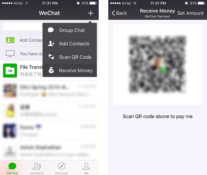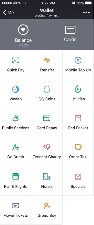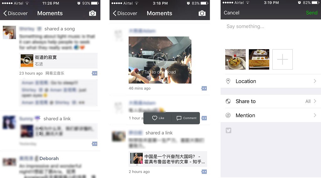 When I arrived in China, I realized I was on WeChat . I was using it in many different ways: all the time Instant messaging A social network like Facebook, for sharing pictures/videos/links/etc Sending money to people Making audio and video calls over the internet Quickly exchanging files between my phone and desktop (Wechat’s desktop and web clients automatically create a “file transfer” conversation, just like any other conversation with a contact. By sending a file to this conversation, you instantly see it on the other end) As my personal visiting card (to share my contact details with anyone, I simply use my account instead of my phone number. Most people do the same) Wechat Sharing music with friends It can be used to call taxis, book train and bus tickets, cinema tickets, order food, pay bills and do just about everything they could ever want to do that includes ‘communication’ with someone else. It is like Facebook, Whatsapp, Instagram, Yelp, Square, and Snapchat rolled into one, with a hundred other apps thrown in. One app to rule them all This is not an advertisement for WeChat (I wish I’d get paid for this haha), but rather a demonstration to the rest of the world of how uniquely consolidated China’s digital landscape has become, all through this one app. mobile I believe that WeChat is one of applications I have ever used, which I feel is something not expected by many people of Chinese apps. It is ubiquitous in China, and one more thing that makes it so interesting is that it is so open to outsiders using it. the most user-friendly For example, while foreigners have a hard time opening a bank account in China, they can automatically start accepting payments through WeChat (the money stays within the app as “wechat money”), and use it to make payments to others. You don’t even need to have a bank account. Compare it to Alibaba’s “Alipay” service, which can be a pain for foreigners to set up. right from the first time they use the app Here begins the ultimate tour of WeChat, more comprehensive than anything else I’ve found on the internet. Opening screen Home screen once the app has launched Opening screen. Nope, you don’t get to see my top-secret conversations. I’ll come to the little black drop-down menu later — let’s talk about the “chat app” within WeChat first. What I can do in each individual chat A conversation directly allows me to send text, voice and sticker messages. You can recall a message within 120 seconds after it is sent, and also translate it within the app into your system language. Sometimes helps while chatting with my Chinese friends. :) I can also do a BUNCH of other stuff. By the way, “Transfer” is for transferring money, and “Name Card” is for sharing a contact — just like you can do in other chat apps. And this is what the ‘Red Packet’ does. In case you were curious, that was totally NOT a 100 yuan packet. ;_; The deserves special mention. It is very similar to the ‘Transfer Money’ feature, but it’s influenced by the Chinese tradition of giving red envelopes of money to your friends, family and relatives. You have to open the packet to see what’s inside. Don’t take this feature lightly — you will see it being used ALL THE TIME in China. When someone sends a red packet in a group chat, the members of that group have to open it as quickly as they can (because you can only open the packet a certain number of times decided by the sender), to get random amounts of money from the packet. It’s like a fun game on days like the New Year, when everyone is sending red envelopes in a group chat and everyone is also rushing to open them! Red Packet And of course, one thing I haven’t showed yet is that there is also an So you can always stay in the app while browsing the web. in-app web browser. The ‘Contacts’ bar Notice the ‘Tags’ and ‘Official Accounts’ The only thing special here is that you can put tags on different contacts, like you do on Facebook (‘Restricted’, ‘Acquaintances’ etc) — you can create these tags yourself. As for the ‘Official Accounts’, they are like feeds from people or businesses etc which you can follow. Think of individual Twitter accounts, or Facebook pages. You can use these to advertise, etc. Here’s a feed from the legendary artist John Rash, who has spent a decade working in China and USA: Left: The official feeds I follow. Right: John’s feed But you have only just scratched the surface. I just showed you the functionality, which already does more than Facebook and WhatsApp combined. But the app is far deeper than that. chat ‘Discover’ This is where WhatsApp merges into Facebook. (Metaphorically) On the tab, you first see ‘Moments’, which is like your Facebook news feed where you can post images and status updates, and see those of your friends. Then of course you can play games (which are all within the app). And I’ll come to ‘Scan QR Code’ and ‘Shake’ later. Discover Moments — your news feed The ‘Moments’ are like your Facebook News Feed — you can like and comment on people’s posts (text, photos, videos, links). The third image is what it looks like to compose a post. You can choose the privacy level (using “Share To”). Notice the little Twitter icon? Yes, it allows you to link your WeChat account with Twitter. Scanning QR Codes QR codes are omnipresent in China, and you’ll love them because makes them convenient. Whenever you see a QR code, rest assured that you can scan it with WeChat and it will work. You can scan someone’s QR code to instantly get their contact information, many posters have QR codes which you can scan to get deals, and sometimes you can scan codes to join group chats! WeChat Moreover, if someone sends you a picture of a QR code within a chat or posts it on his moments, WeChat can identify it and ask if you want to scan it! Tinder and Omegle, rolled into one. The ‘Shake’ featu