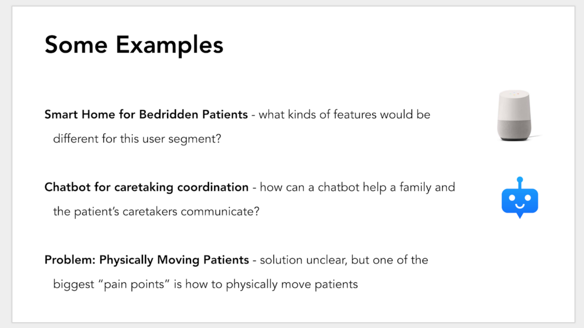 Lessons from a Technology + Palliative Care Brainstorm with doctors, chaplains, and palliative health experts at the University of Colorado Denver. Palliative care is a relatively new concept in the field of medicine. Historically, medicine has had a primarily curative goal. Yet, instead of focusing on curing a terminally diagnosed patient, palliative care provides relief from symptoms, pain, and associated mental stress. alliative care As with most trends in healthcare, including palliative medicine, we’re seeing an increase in the use of technology to augment patient care. We’ve seen incredible projects and ideas such as smart pill dispensers, virtual group therapy, and others. But what about the intersection of palliative care and technology? To explore this intersection further, I hosted a Tech + Palliative Care Brainstorm session in partnership with Dr. David Bekelman, Associate Professor at the University of Colorado Denver Medical School. Assistant Professor Jenny Portz, Dr. Bekelman, and I published our findings in the Journal of Palliative Medicine. Journal of Palliative Medicine A snapshot of the technology + palliative health care brainstorm session at CU Denver. The Session We began our one-hour session with an independent brainstorm, and then switched into a small group discussion. Participants were given a set of initial examples to get them thinking, but were encouraged to “think big.” The Ideas The ideas varied widely, from better methods of understanding advance directives (what a patient wants in the case of incapacitation), or ways to encourage terminally ill patients to find meaningfulness in their lives. Here are four of the major trends we noticed during the brainstorm session: Independence: Autonomy is an important part of making patients happy and feel in control of their own lives. Technology has an important role here: how can smart homes, smart watches, and other devices enable an older adult to feel comfortably independent? Telling Their Story: At the end of life, it’s important for people to feel like they have a story — a fulfilling narrative that provides meaning to their lives. Technology has a variety of new media including virtual reality and voice-assisted technology that can enable older adults to record and share their personal narratives. Loneliness: It’s hard to feel connected and easily to feel alone at the end of life. How can we use social media and voice-assisted technologies to help patients feel less isolated? Communication with caregivers: There’s a huge network of individuals helping to make the lives of a particular terminally ill patient more bearable. Technology can help coordinate and connect the various caregivers (chaplains, family members, doctors, caretakers, etc.). Independence: Autonomy is an important part of making patients happy and feel in control of their own lives. Technology has an important role here: how can smart homes, smart watches, and other devices enable an older adult to feel comfortably independent? Independence: Telling Their Story: At the end of life, it’s important for people to feel like they have a story — a fulfilling narrative that provides meaning to their lives. Technology has a variety of new media including virtual reality and voice-assisted technology that can enable older adults to record and share their personal narratives. Telling Their Story: Loneliness: It’s hard to feel connected and easily to feel alone at the end of life. How can we use social media and voice-assisted technologies to help patients feel less isolated? Loneliness Communication with caregivers: There’s a huge network of individuals helping to make the lives of a particular terminally ill patient more bearable. Technology can help coordinate and connect the various caregivers (chaplains, family members, doctors, caretakers, etc.). Communication with caregivers Moving Forward There are already academic and entrepeneurial ventures exploring the intersection of technology and palliative care. However, there’s still a need for more innovation and deeper analysis of the fields. What are the highest priority ways that technology can help with palliative care? Or, where are some areas that palliative care doesn’t need technological innovation? Check out the full list in our published journal article, or don’t hesitate to reach out to me directly! our published journal article I hope this post inspires you to consider some implications of technology and end-of-life care, and opportunities for innovation. If you found this article helpful, you can clap 👏 to support. Here are some other articles you may be interested in by me: Running the world’s largest mental health hackathon Why I Send Annual Friendship Feedback Emails I Listened to Emotionally Vulnerable Strangers on Reddit Running the world’s largest mental health hackathon Running the world’s largest mental health hackathon Why I Send Annual Friendship Feedback Emails Why I Send Annual Friendship Feedback Emails I Listened to Emotionally Vulnerable Strangers on Reddit I Listened to Emotionally Vulnerable Strangers on Reddit