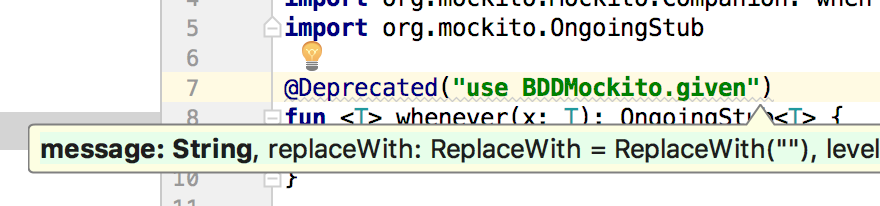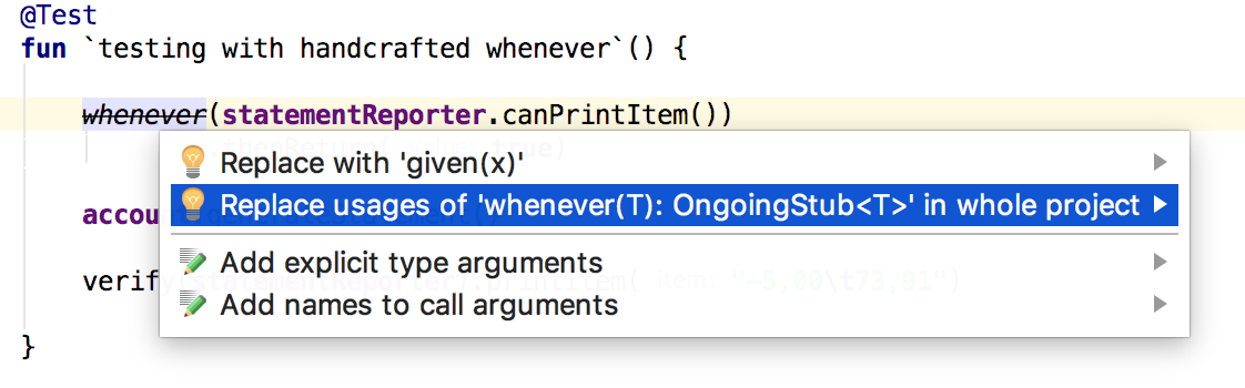 I’m going to tell you a real story how we saved ourselves tons of time. The power of Kotlin’s refactoring is astounding. @Deprecated Don’t think it is the same as Java’s . It is much more powerful. It allows for multi-step automated replacement. @Deprecated So, let me tell you about it. We were migrating our code base from Java to Kotlin. When somebody needed to touch an existing Java file, we would auto-convert it to Kotlin. And only then introduce change. Otherwise, all new code was written in Kotlin. We were using library in our unit tests. And as you might know, mockito heavily relies on method. mockito Mockito.when is a reserved keyword in Kotlin. So we had to fence it with backticks. when To be honest, it looked quite ugly, and was awkward to type: class AccountTest { private val statementReporter = mock(AccountStatementReporter::class.java) private val account = Account(statementReporter) @Test fun `testing with Mockito when`() { `when`(statementReporter.canPrintItem()) .thenReturn(true) account.generateStatement() verify(statementReporter).printItem("-5,00\t73,91") } } At the time, we weren’t aware of the , so we have built our own function to mitigate the keyword problem: mockito-kotlin whenever fun <T> whenever(x: T): OngoingStub<T> { return `when`(x)} It is an alias for . Mockito.when And it can be typed quickly, and IntelliJ helps with autocomplete. Which is nice: @Test fun `testing with handcrafted whenever`() { whenever(statementReporter.canPrintItem()) .thenReturn(true) account.generateStatement() verify(statementReporter).printItem("-5,00\t73,91") } Over the course of half a year, we had this -based code everywhere. whenever Thousands of occurrences. @Test fun `testing with handcrafted whenever – false case`() { whenever(statementReporter.canPrintItem()) .thenReturn(false) account.generateStatement() verify(statementReporter).canPrintItem() verifyNoMoreInteractions(statementReporter) } At that point, somebody has discovered API. It has allowed us to use slightly different words for , , , and others. BDDMockito when thenReturn thenThrow Most importantly, it was part of the official library! mockito By the way, is usually used when testing in Java and Kotlin. mockito Curious about testing in Kotlin? Or Kotlin in general? I suggest you . You will be minutes away from your first full-fledged command-line application in Kotlin. download my free Ultimate Tutorial: Getting Started With Kotlin The tutorial is an 80-page book and is entirely hands-on. You can follow along with it while learning about various Kotlin and IntelliJ features. And lots of other things. Anyways. Here is an example of syntax for you: BDDMockito @Test fun `testing with handcrafted whenever`() { given(statementReporter.canPrintItem()) .willReturn(true) account.generateStatement() verify(statementReporter).printItem("-5,00\t73,91") } Of course, we wanted to switch from hand-crafted function to the official API! By the way, is using slightly different naming. But the mocking structure is same: BDDMockito // given vs whengiven(statementReporter.canPrintItem()) // willReturn vs thenReturn .willReturn(true) As you can see, instead of it allows us to use , and all the methods become . when given then* will* At that point, we decided to switch from to . We didn’t want to change thousands of occurrences in one go, as it will take a lot of time. whenever given And we just might have changed some things that shouldn’t have been changed if we were to do the search & replace. So, we decided to put a simple annotation on the function. That would make all the usages appear as deprecated (crossed out) in IntelliJ. New usages are unlikely to be introduced, as well. @Deprecated whenever As my pair was typing it out, I’ve noticed that IntelliJ was showing something interesting in the parameter list tooltip: It got me curious about this parameter. If I understood it correctly, this would allow some automated replacement. replaceWith We fiddled a bit with it. And it seemed like you can do such replacement. Here is the code: @Deprecated( "use BDDMockito.given", replaceWith = ReplaceWith( "given(x)", "org.mockito.BDDMockito.Companion.given"))fun <T> whenever(x: T): OngoingStub<T> { return `when`(x)} Now we tried to go to the usage of , place our cursor on the deprecated call, and press ALT + ENTER (the magic hotkey of IntelliJ). whenever whenever What happened is amazing: You can indeed do the automated replacement. And there is even an option to replace it in the WHOLE PROJECT! Astounding! But first, we decided to double-check how it will work just for that one occurrence. That was the right decision: It resulted in a compile error as doesn’t have method defined on it. It should be . BDDOngoingStub<T> thenReturn willReturn And now it got us thinking. What if we could define that method using “extension methods” feature of Kotlin? That would make things compile. Sure. But then we still didn’t get rid of the custom code yet… “So what if we deprecate that extension method too?!” — I asked. “And then we can add !” – my pair replied. replaceWith In rejoice, we started doing it: fun <T> BDDOngoingStub<T>.thenReturn(x: T) { willReturn(x)} That allowed us to fix the problem by auto-importing extension: thenReturn And now, we were about to deprecate it with the same kind of annotation: @Deprecated( "use willReturn", replaceWith = ReplaceWith( "willReturn(x)"))fun <T> BDDOngoingStub<T>.thenReturn(x: T) { willReturn(x)} Now we were able to replace these method calls with : thenReturn willReturn We could have run that replacement for the whole project, as well. Neat. We thought we were ready to do the “WHOLE PROJECT” refactoring: That still forced us to do “ALT+ENTER” auto-importing in about 40 files. But that, to be honest, was a quick one. There is a shortcut to jump to the next compile error: CMD+ALT+DOWN. So the fix for that little problem was to press one shortcut and another right after