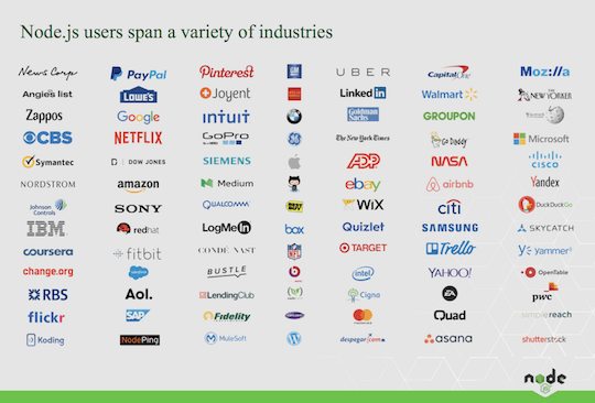 Since Node.js has LTS (a long-term support plan which focuses on security and stability) since 2015, it’s no wonder that huge enterprises constantly add it to their stacks.