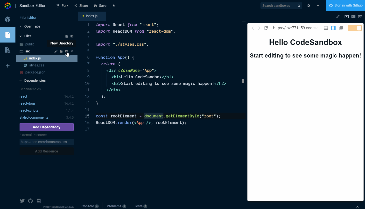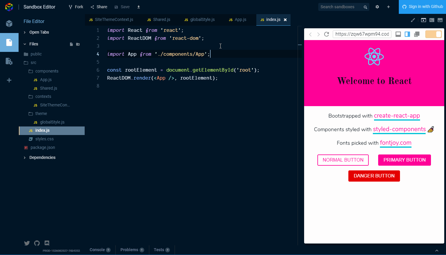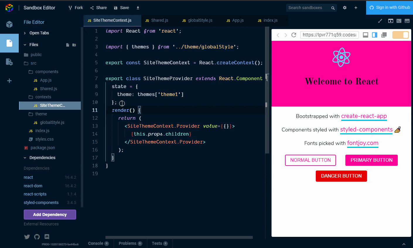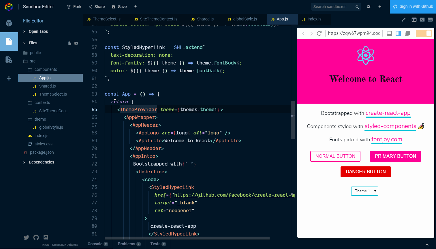 Use the React Context API to change the theme in an app! But first, some ! 🤣 context Ok terrible puns aside, let’s have a look at what the React Context API is for and what it does. There’s a great one-liner from the … React docs Context provides a way to pass data through the component tree without having to pass props down manually at every level. Or in other words, you can use the React Context API to avoid . If you need more detail on the concept then please do check out the links provided. prop drilling I’ve previously gone over implementing the React Context API in which I documented as I did it. You can see . my Gatsby blog how that went here A great resource on explaining the API can be found from @leighchalliday with a great use case on the subject. What we’re doing… For this post we’re going to extend the example we created for . As it has the majority of the code we’ll need to get started with the React Context API. styled-components getting started We’re going to extend that example to manage the theme state of the example application. So in summary: Scaffold out basic CreateReact App Use styled-components 💅 for styling Add themes to switch between with the React Context API Use the React Context API! What we’ll need… All we’ll be needing is an internet connection and a modern web browser! Because we’re going to do all of this online in the awesome ! CodeSandbox If you have a GitHub account or not, CodeSandbox will let you get started . coding straight away Versions: This guide is being used with the following dependency versions. react: 16.4.2 react-dom: 16.4.2 react-scripts: 1.1.4 styled-components: 3.4.5 Let’s start So let’s go over theming the basic create-react-app again. This time, instead of adding state into to the component, we will use the React Context API to manage the state for us. There will be people that will argue that this is a bit overkill for a theme switch. It is given as an example of in the React documentation, so I will let you decide on the validity of that point. when to use the Context API For this example, I hope it will give you a clearer picture of how to use the Context API in an application. Dependencies and add as a dependency: Open a React CodeSandbox styled-components File structure Another area for is file structure. In this scenario we’re adding folders for , and the . Please feel free to structure your files how you see fit, this is how we’re going to do it for this example ❤️ bikeshedding components contexts theme Add the directories into the folder so we can add in some components. The file structure should look something like this: src context-demo/├─ public/├─ src/│ └─ components/│ └─ contexts/│ └─ theme/└─ package.json Scaffold out a basic Create React App Ok, so, what we’re going to do is add in an component to the folder then use that in the file. App.js components src/index.js The component can be a as for this example as we’re going to be handling state with the Context API. App.js stateless functional component Here you can see my sketchy typing as I create the directories and add in the component. App.js We can then remove the file and reference in We’re going to be styling with styled-components 💅 and then use our component: style.css src/index.js. App.js Ok, so the reason why I have abstracted the component out of the file is so that when we come to using the Context API we can add it to the highest level in our app, which is . App.js src/index.js src/index.js What about the rest? So this isn’t really the Create React App, as we’re using CodeSandbox instead. I have gone over the basic styling used in the post. It’s time to refer to that to mimic the styles we need. styled-components getting started That means that, rather than going into depth on the styling of each of the component parts that make up the basic Create React App appearance, we’re going to re-use components. There’s going to be a bit of copy pasting involved now. The Create React App boilerplate code has one file that we go over styling in the post which is the file. The basic style of is: styled-components getting started App.js App.js **App.css** .App {text-align: center;} .App-logo {animation: App-logo-spin infinite 20s linear;height: 80px;} .App-header {background-color: #222;height: 150px;padding: 20px;color: white;} .App-title {font-size: 1.5em;} .App-intro {font-size: large;} @keyframes App-logo-spin {from {transform: rotate(0deg);}to {transform: rotate(360deg);}} Use styled components for styling Now we’re going to recreate the styles from the file with styled-components. Let’s list them out here and go through them: App.css AppWrapperAppHeaderAppTitlerotate360AppLogo _We’re adding our own styles for_AppIntro UnderlineStyledHyperLinkButton is the top level wrapper which in a larger component could be used for layout with CSS Grid or Flexbox. In our case we’re going to align the text center. AppWrapper Straightforward enough, right? Now the majority of the rest of the components will use the styled-components which is what we’re going to pass our theme to from the Context API. [ThemeProvider](https://www.styled-components.com/docs/advanced#theming) Add themes to switch between with the React Context API Ok, we need to define some themes to pass to the . We’re going to define several theme aspects we want to change, and these are going to be: ThemeProvider primary // _colour_secondary // _colour_danger // _colour_fontHeader // _font_fontBody // font Create a file to contain the theme object in the directory and call it . Add in the following: theme globalStyle.js { injectGlobal } 'styled-components' import from export const = { : { : '#ff0198', : '#01c1d6', : '#e50000', : 'Old Standard TT, sans, sans-serif', : 'Nunito, sans-serif'}, : { : '#6e27c5', : '#ffb617', : '#ff1919', : 'Enriqueta, sans-serif', : 'Exo 2, sans, sans-serif'}, : { : '#f16623', : '#