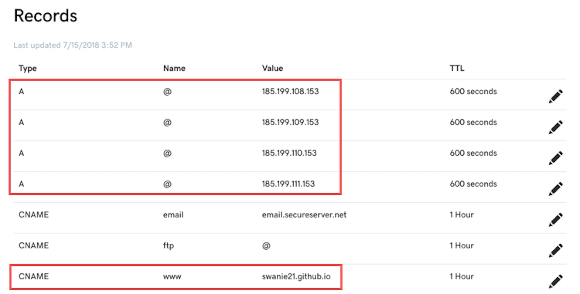 Congrats, you’ve finally created a personal website that you want your own custom domain name instead of using gh-pages to host it. The process of connecting your domain to your gh-pages is quite simple. However, choosing the perfect domain name is the tricky part. I was very tempted to buy a “.ninja” extension, but ended up settling with an “.io.” Additionally, I was stumped as to whether to go with a nickname or my full name. In the end, I chose, kirstenswanson.io. Github provides, some docs to wire up your domain with your gh-pages, but I’m going to cover the set up in 8 simple steps. First, the most difficult part…decide on a domain name and buy it on GoDaddy (fingers-crossed you get the domain name you want and someone else hasn’t already taken it). On the home page of your account the “My Products” tab is selected on default, which makes it easy to click on the “Manage” button. 3. Scroll down to the bottom of the page and click the “Manage DNS” button. 4. Within the DNS management page you will need to make five changes: In the Type “A” row update the IP address to: 185.199.108.153(this will point your custom domain to GitHub’s server over HTTPS) In the CNAME row with Name “www” input your gh-pages website (username.github.io) At the bottom click the “ADD” button and make 3 more Type “A” rows with the IP addresses of: 185.199.109.153, 185.199.110.153, 185.199.111.153(don’t worry when you leave the page it will alphabetize the types) 5. Go to your editor and in the repository of your website create a new file named “CNAME” in the root of your directory. 6. In the “CNAME” file add your domain name purchased from GoDaddy. 7. Add, commit, and push your changes to Github. 8. Within your repository you will need to allow your website to be served through HTTPS. Check “Enforce HTTPS” in the Settings tab of your repo. This permission might take awhile because the certificate needs to be issued, but make sure you check this enforcement option when allowed. You can confirm that your DNS is set-up correctly by using the dig command in your terminal with your custom domain. You should see that your “A” Types point to the IP addresses that you had specified in GoDaddy’s DNS management page, in other words you’re pointing your DNS to GitHub’s server. Below is an example of the dig command: If you’re encountering any problems, this GitHub Troubleshooting Custom Domains documentation is a good reference. And just like that, you now have your very own custom DNS! As a side note, it may take some time for your DNS configuration to update as well as receiving your HTTPS certificate (allow 24 hours), but after that celebrate and share your website! 🎉 Congrats, you’ve finally created a personal website that you want your own custom domain name instead of using gh-pages to host it. The process of connecting your domain to your gh-pages is quite simple. However, choosing the perfect domain name is the tricky part. I was very tempted to buy a “.ninja” extension, but ended up settling with an “.io.” Additionally, I was stumped as to whether to go with a nickname or my full name. In the end, I chose, kirstenswanson.io. kirstenswanson.io. Github provides, some docs to wire up your domain with your gh-pages, but I’m going to cover the set up in 8 simple steps. docs First, the most difficult part…decide on a domain name and buy it on GoDaddy (fingers-crossed you get the domain name you want and someone else hasn’t already taken it). On the home page of your account the “My Products” tab is selected on default, which makes it easy to click on the “Manage” button. First, the most difficult part…decide on a domain name and buy it on GoDaddy ( fingers-crossed you get the domain name you want and someone else hasn’t already taken it ). fingers-crossed you get the domain name you want and someone else hasn’t already taken it On the home page of your account the “My Products” tab is selected on default, which makes it easy to click on the “Manage” button. 3. Scroll down to the bottom of the page and click the “Manage DNS” button. 4. Within the DNS management page you will need to make five changes: In the Type “A” row update the IP address to: 185.199.108.153(this will point your custom domain to GitHub’s server over HTTPS) In the CNAME row with Name “www” input your gh-pages website (username.github.io) At the bottom click the “ADD” button and make 3 more Type “A” rows with the IP addresses of: 185.199.109.153, 185.199.110.153, 185.199.111.153(don’t worry when you leave the page it will alphabetize the types) In the Type “A” row update the IP address to: 185.199.108.153(this will point your custom domain to GitHub’s server over HTTPS) In the Type “A” row update the IP address to: 185.199.108.153( this will point your custom domain to GitHub’s server over HTTPS ) this will point your custom domain to GitHub’s server over HTTPS In the CNAME row with Name “www” input your gh-pages website ( username.github.io ) username.github.io At the bottom click the “ADD” button and make 3 more Type “A” rows with the IP addresses of: 185.199.109.153, 185.199.110.153, 185.199.111.153(don’t worry when you leave the page it will alphabetize the types) At the bottom click the “ADD” button and make 3 more Type “A” rows with the IP addresses of: 185.199.109.153, 185.199.110.153, 185.199.111.153( don’t worry when you leave the page it will alphabetize the types ) don’t worry when you leave the page it will alphabetize the types 5. Go to your editor and in the repository of your website create a new file named “CNAME” in the root of your directory. 6. In the “CNAME” file add your domain name purchased from GoDaddy. 7. Add, commit, and push your changes to Github. 8. Within your repository you will need to allow your website to be served through HTTPS. Check 