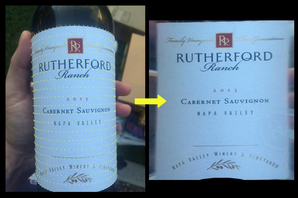 How to unwrap wine labels programmatically In our application, there is a feature like in Vivino — wine detection by label picture. Under the hood, we use third-party services, Tineye — to detect the best matching label, Vision — to read text on it. The latter is necessary to precise the product, as the image search doesn’t count importance of some regions on labels, usually, it’s textual information — vintage and varietal. Google However, accuracy goes down due to cylinder distortion. Especially it’s noticeable in the case of OCR — any text out of the center of the region is almost not readable by Google Vision, meantime a human will easily recognize it. In the article, I’ll describe how to revert cylinder distortion and as result — improve product matching accuracy. First of all, let’s dig into distortion’s nature. A rectangular label, being stick to a cylinder, have a specific barrel-like shape ( on the picture above). A curve ABC in that case, with quite a good approximation, — an ellipse, as we see a circle (cylinder cross-section) under some angle. A set of all horizontal lines of the label are related to a set of ellipses on the picture. b The most interesting it’s only required to specify just 6 markers to fully unwrap a label (ABCDEF): Using them it’s possible to build a mesh, covering cylinder surface. And using the mesh above, we can transform each cell individually and thus recover the original surface of the label. The code is available on GitHub https://github.com/Nepherhotep/unwrap_labels The main advantage of the method — input parameters of the unwrap function are visually detectable (the corners, upper, and bottom lines), which allows us to fully automate the process. The next part of the article is devoted to markers detection, but the code is not public. The first step — we convert the image to grayscale. Then we need to detect label edges. We can use the Sobel transformation for that . https://en.wikipedia.org/wiki/Sobel_operator The next thing we need to do — detect the longest lines on the image, which are usually the edges of the bottle. In that particular case it’s true, but if we take a picture of a bottle staying among other bottles, it’s not necessarily true. To detect those lines, let’s use Hough transform https://en.wikipedia.org/wiki/Hough_transform The idea — we use all the lines goes across the picture, and calculate the pixels’ average (let’s say, use all the lines going from top to bottom). We put all the values into a new coordinate system and build something like a heat map. We need to find two max values on the heatmap — they are edges of the bottle. It’s depicted on the image below how the left bottle line is converted to a point on the heat map: It’s a bit harder to deal with ellipses, but it’s possible to use Hough transform to any mathematically described curve. As ellipse is such a case, let’s do that. First of all, we need to turn the task into a two-dimensional representation. As we know the bottle is symmetric, let’s use the center axis as new “Y” and the left axis as new “X” (see the image below). We will use averages of pixels, collected along a set of ellipses drawn between X and Y axes, as values in a new coordinate system. It’s possible to do, as there is only one way to connect two given points on X and Y. Probably it’s not obvious from the first glance, but quite easy to catch if refer to a parametric form of the ellipse: x = a * cos(t) y = b * sin(t) Similarly, we will find two maximums, which will define top A-B and bottom F-E curves. Now, as we have all the required markers (left, right lines, and top, bottom ellipses), we can apply the algorithm described in the first part of the article and undo cylinder distortion. What can be improved? Firstly, the algorithm doesn’t count perspective distortion of the ellipses, thus the right and left sides of the label are stretched a bit more than they should. To fix that it’s required to know the angle of the camera, or at least to find the most typical angle for mobile phones (can be done empirically). Secondly, Hough transform will be unstable in complicated cases — like a bottle staying among other bottles. Thirdly, if the form of the label is not rectangular (let’s say elliptical), markers will be wrongly detected and the further transform will distort the label even more. In practice, it’s much more interesting to use a neural for markers detection, since it can be trained on complicated cases as well, and even alert if the algorithm was not able to detect the label (and keep the label untransformed), but it will be a topic for another article. network