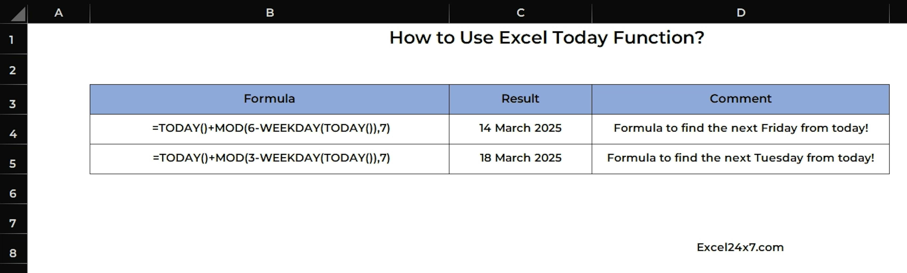 Today Function: A Brief The TODAY function in Excel returns the current date and updates automatically whenever the worksheet is opened or changed. This function does not require any arguments and you can apply a date format to display the result correctly. You may need to use the NOW function if you need both the current date and current time. TODAY current date Objective Value Returned by function Aim to get the current date Today Function will return a valid Excel date in serial numbers. Objective Value Returned by function Aim to get the current date Today Function will return a valid Excel date in serial numbers. Objective Value Returned by function Objective Objective Value Returned by function Value Returned by function Aim to get the current date Today Function will return a valid Excel date in serial numbers. Aim to get the current date Aim to get the current date current date Today Function will return a valid Excel date in serial numbers. Today Function will return a valid Excel date in serial numbers. valid Excel date Today Function: A Syntax =TODAY() =TODAY() The TODAY function returns the current date and updates automatically whenever the worksheet is refreshed. The result is a standard Excel date and to display it correctly, apply a date format. You can also customize the format as needed as shown in the below image. TODAY date format Using Today Function with Practical Examples: Formula Result Current day of the week =TEXT(TODAY(),"DDDD") Thursday Current day of the week =TEXT(TODAY(),"MMMM") March Current month name ="Q"&ROUNDUP(MONTH(TODAY())/3,0)&"-"&YEAR(TODAY()) Q1-2025 Current quarter =TODAY()+5*365 12 March 2030 5 years from today =IF(MOD(YEAR(TODAY()),4)=0,"Yes","No") No Check if current year is a leap year =EOMONTH(TODAY(),0) 31 March 2025 Last day of the current month =EOMONTH(TODAY(),0)+1 01 April 2025 First day of next month =EOMONTH(TODAY(),1) 30 April 2025 Last day of next month =DATE(YEAR(TODAY())+1,1,1) 01 January 2026 First day of next year =DATE(YEAR(TODAY()),12,31) 31 December 2025 Last day of the current year Formula Result Current day of the week =TEXT(TODAY(),"DDDD") Thursday Current day of the week =TEXT(TODAY(),"MMMM") March Current month name ="Q"&ROUNDUP(MONTH(TODAY())/3,0)&"-"&YEAR(TODAY()) Q1-2025 Current quarter =TODAY()+5*365 12 March 2030 5 years from today =IF(MOD(YEAR(TODAY()),4)=0,"Yes","No") No Check if current year is a leap year =EOMONTH(TODAY(),0) 31 March 2025 Last day of the current month =EOMONTH(TODAY(),0)+1 01 April 2025 First day of next month =EOMONTH(TODAY(),1) 30 April 2025 Last day of next month =DATE(YEAR(TODAY())+1,1,1) 01 January 2026 First day of next year =DATE(YEAR(TODAY()),12,31) 31 December 2025 Last day of the current year Formula Result Current day of the week Formula Formula Result Result Current day of the week Current day of the week =TEXT(TODAY(),"DDDD") Thursday Current day of the week =TEXT(TODAY(),"DDDD") =TEXT(TODAY(),"DDDD") Thursday Thursday Current day of the week Current day of the week =TEXT(TODAY(),"MMMM") March Current month name =TEXT(TODAY(),"MMMM") =TEXT(TODAY(),"MMMM") March March Current month name Current month name ="Q"&ROUNDUP(MONTH(TODAY())/3,0)&"-"&YEAR(TODAY()) Q1-2025 Current quarter ="Q"&ROUNDUP(MONTH(TODAY())/3,0)&"-"&YEAR(TODAY()) ="Q"&ROUNDUP(MONTH(TODAY())/3,0)&"-"&YEAR(TODAY()) Q1-2025 Q1-2025 Current quarter Current quarter =TODAY()+5*365 12 March 2030 5 years from today =TODAY()+5*365 =TODAY()+5*365 12 March 2030 12 March 2030 5 years from today 5 years from today =IF(MOD(YEAR(TODAY()),4)=0,"Yes","No") No Check if current year is a leap year =IF(MOD(YEAR(TODAY()),4)=0,"Yes","No") =IF(MOD(YEAR(TODAY()),4)=0,"Yes","No") No No Check if current year is a leap year Check if current year is a leap year =EOMONTH(TODAY(),0) 31 March 2025 Last day of the current month =EOMONTH(TODAY(),0) =EOMONTH(TODAY(),0) 31 March 2025 31 March 2025 Last day of the current month Last day of the current month =EOMONTH(TODAY(),0)+1 01 April 2025 First day of next month =EOMONTH(TODAY(),0)+1 =EOMONTH(TODAY(),0)+1 01 April 2025 01 April 2025 First day of next month First day of next month =EOMONTH(TODAY(),1) 30 April 2025 Last day of next month =EOMONTH(TODAY(),1) =EOMONTH(TODAY(),1) 30 April 2025 30 April 2025 Last day of next month Last day of next month =DATE(YEAR(TODAY())+1,1,1) 01 January 2026 First day of next year =DATE(YEAR(TODAY())+1,1,1) =DATE(YEAR(TODAY())+1,1,1) 01 January 2026 01 January 2026 First day of next year First day of next year =DATE(YEAR(TODAY()),12,31) 31 December 2025 Last day of the current year =DATE(YEAR(TODAY()),12,31) =DATE(YEAR(TODAY()),12,31) 31 December 2025 31 December 2025 Last day of the current year Last day of the current year Practical today function formula with output results as examples. Find the Next Friday from Today: If you want to schedule a meeting every Friday, and you need to find the next Friday from today (present day). You can use the below formula. =TODAY()+MOD(6-WEEKDAY(TODAY()),7) =TODAY()+MOD(6-WEEKDAY(TODAY()),7) Formula to find the next Friday and Tuesday from today using TODAY function Number Value Day Name 1 Sunday 2 Monday 3 Tuesday 4 Wednesday 5 Thursday 6 Friday 7 Saturday Number Value Day Name 1 Sunday 2 Monday 3 Tuesday 4 Wednesday 5 Thursday 6 Friday 7 Saturday Number Value Day Name Number Value Number Value Day Name Day Name 1 Sunday 1 1 Sunday Sunday 2 Monday 2 2 Monday Monday 3 Tuesday 3 3 Tuesday Tuesday 4 Wednesday 4 4 Wednesday Wednesday 5 Thursday 5 5 Thursday Thursday 6 Friday 6 6 Friday Friday 7 Saturday 7 7 Saturday Saturday =TODAY()+MOD(3-WEEKDAY(TODAY()),7), you can change the number to check for the different days in the coming week. =TODAY()+MOD(3-WEEKDAY(TODAY()),7) Calculate AGE using Today function: You can use the today function along with the year function to calculate the AGE of the person. to do this, you must need to enter the proper date values. Using the below formula to calculate the age from birthday with TODAY Func