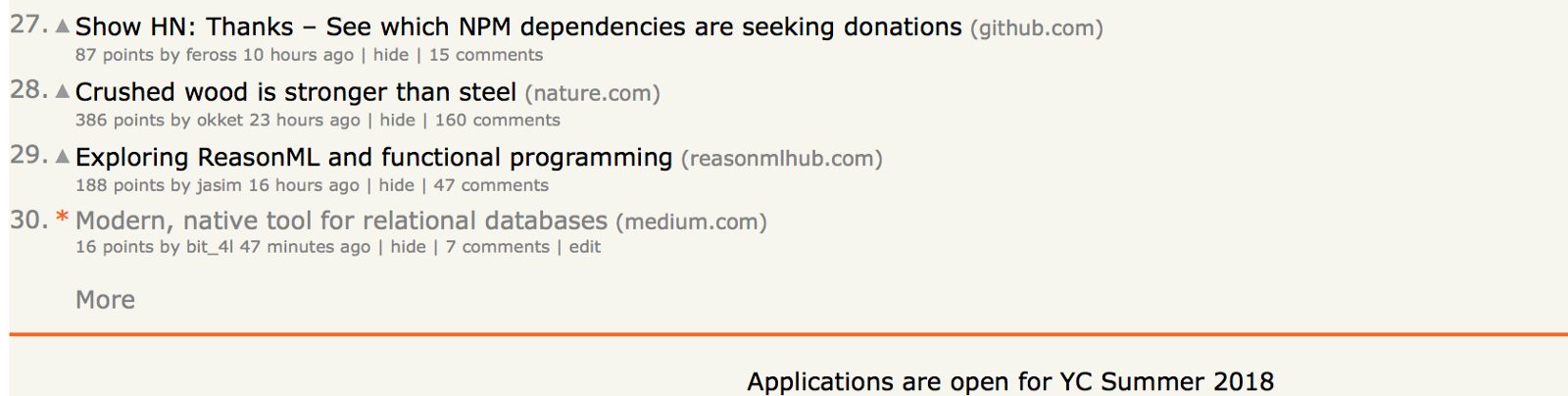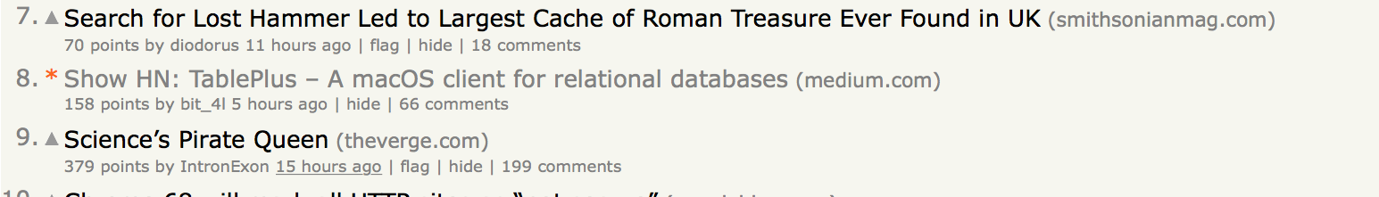 tl;dr: One submission on sent over 16,000 visitors to our blog post in two days. This post documents the experience. Hacker News As we are working in tech, the front page of Hacker News is like the holy grail. It brings you traffic, downloads, sales, brand awareness…, that can make a huge impact on your business. Everybody wants it so bad but its space is limited and it can sometimes be a little bit tricky. You cannot simply game the system by sharing the link and asking for upvote like on Product Hunt. It doesn’t work that way. It requires the post’s interaction to be more authentic. A bit of background: we are building , a modern, native tool with elegant UI that helps you simultaneously manage multiple databases such as MySQL, Postgres, , Microsoft SQL Server, Redis… in a very fast and secure way. It’s currently on macOS only. TablePlus SQLite Since our first release 7 months ago, we have been receiving a lot of support, positive feedback from our users. It convinced us with the thought that we could be featured on Hacker News one day. We just didn’t know when. Friday, Feb 9th, 2018 That was the last working day of the week, also the last working day before Lunar New Year, one of the biggest and most important holiday in Asia. During this time, we put all the work-related stuff aside, go back to our hometown and spend time with our family. I only used Hacker News to read the news and find interesting stuff, but never actually submitted anything. I wondered how is it like to submit a post to Hacker News. So before packing our stuff and leaving the office, I used my new account and submitted the link to our post to Hacker News without expecting anything in particular. I was just trying to “check it out”. introducing TablePlus That was around 4:30 pm. I copied the exact title from the Medium post: And I got this link: Modern, native tool for relational databases. https://news.ycombinator.com/item?id=16339004 Around 5 minutes later, I checked the submission and wow, 2 points. That can be something, I thought with a little of hope. 10 minutes later, I checked the submission, 1 more point. Checked the front page, nothing there. Well, that’s already slowed down. Then I sent the post URL to my co-founder, , informing him of my submission. Huy Huy: Oh, we seem to be the hottest one in the newest box. That’s cool. He gave one more point. Then we got back to work for awhile until 30 minutes later, Huy yelled: We’re on the front page! I was like, you must be kidding me. No, I’m serious. It’s there on the first page. I immediately opened a new tab and jumped to Hacker News to see what happened. He was right, it was there, near the last row. The last item on the front page of Hacker News I was jumping up and down, running around the room, excitedly. We f*cking made it! It started to gain more points and comments, mostly positive ones. 10 minutes later, it slid from the first page to #36 on the second page. Sad story. It faded off so fast that we didn’t even get a chance to show off with our friends yet. But I didn’t know that it can still come back if it’s interesting enough to gather more interaction. That’s exactly what happened. 15 minutes later, it came back to the front page. It quickly hiked up the list, from #30 to #28, then #16, and #8. The highest it reached was #2. It was booming. Still on it! As you might notice, the mod changed the title of my post to to indicate that we are showcasing our new product that people can try out, give feedback or ask questions. Yeah, I forgot that too. Show HN: We know speed is the killer point that keeps your post stick on the front page longer. We tried to reply to everybody there as fast as possible, to make them happy, and to generate more interaction. There were mostly compliments and personal experience sharing. There were also critics, but the harsh ones appeared saturated quickly. Perhaps people also didn’t like it and downvoted it a lot. No worries :D The result A couple minutes after getting on the front page for the first time, I checked Google Analytics to see what we had got. Nothing. Not a single new session from news.ycombinator.com. I was confused. That’s weird, it’s supposed to start a spike. Then I realized I put the link to our Medium post, while I was expecting traffic to our . So silly of me. That was a not-so-good move because the traffic was filtered, the majority remained on Medium. It only drove traffic directly from HN to our website after someone mentioned the site in the comment section. Then I tried to convince myself that instead of downloading the app immediately, reading our launch post would help people understand more about why and how we built TablePlus in the first place. Think positive :D original blog post A few days later, my post faded away from the latest news section but it was still reposted on Reddit, Twitter and a lot of other mediums, bringing some more traffic until it’s cooled off and went back to normal after one week. And here is what the traffic looks like for our post: 11,092 views on the first day, another 5,540 on the second day. That was total 16,632 views in two days. In one week, the post on Hacker News brought in a total of 23,453 visitors, our daily active users jumped over 400% in one day and half of that number still remains until today. That pushed the total revenue of Feb up over 200% compared to Jan. Not a bad deal, right? Summary: How did we get on the front page? . I submitted the post without any preparation but I got lucky. That was also Friday, it’s less crowded so it had a higher chance to get to the front page and stay there longer. However, I guess it received less traffic than the midweek. Luck . Remember the audience of Hacker News: hackers and entrepreneurs. So posting something about tech and entrepreneurship would interest them more and stand a higher chance. Our tool, TablePlus, was designed for developers so it could quickly draw attent