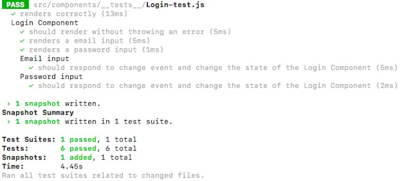 This is the first of maybe a couple of posts that I am going to be doing on testing React components and TDD in general. This one deals with setting up the Jest and Enzyme libraries and then writing a couple basic tests for a Login component. In my next posts hopefully I’ll go into a little more detail about these libraries and about how we can test more complex components that involve Redux. So with that let’s get started! What is Jest? Jest is a testing library that can be used to test simple Javascript code or React components. This is done through simple API that Jest provides to users. Using this API it is possible to make assertions on how functions should behave and then test our expected outcome against the test outcome. It is very easy to set up and is usable right out of the box. Thats why its the preferred testing library for Facebook. A cool feature that Jest has is snapshots. This takes a snapshot of your component and how it renders and then will compare that whenever doing other tests to let you know if something unexpected is happening. I won’t go into too much detail on snapshots because I’ll cover those in another post. When using Jest with Enzyme it is possible to test components through a mock DOM. What is Enzyme? Enzyme is another library commonly used with either Jest or Mocha and Chai. With Enzyme we can create a mock DOM to test whether components are rendered correctly, and whether they behave correctly when acted upon. Enzyme’s mock rendering can either be done through shallow rendering or full DOM rendering. is used when doing unit testing of a component. This allows for tests to focus only on that component and how it functions, without caring about other components it might interact with. Shallow rendering involves rendering your component and all children components. The allows for more in-depth testing to see how your components on the DOM interact with each other. Full DOM rendering Setting up Jest and Enzyme First lets add both Jest and Enzyme to our React app. To install Jest simply run this code, npm install --save-dev jest Chance are it is already installed if you used Create React App to build the base of your application. Enzyme requires a couple of packages to be installed. First we’ll install Enzyme and the proper adapter to go with it. We must specify which version of React we are using to get the correct testing adapter. I am using React 15.6.1 so the packages I’ll be installing are npm install --save-dev enzyme enzyme-adapter-react-15 The full list of adapter packages can be found . Next we will install the Jest Enzyme package so we’ll be able to use them together like this, here npm install --save-dev jest-enzyme Now that we have both of the libraries installed we have to set up a couple more things. To begin lets set up our file structure. It is usually best to keep your component tests close to the component code. So lets create a subfolder called __tests__ in our components folder. This is where we will create a file for each component to write our tests. One last thing we need to set up is our adapter. In order to use Enzyme with React, we need to create another file and tell Enzyme what adapter to use depending on our version of React. This is where we will use that package we installed earlier, that corresponded to our React version. Because I used Create React App we can create a file called setupTests.js in the src folder. The code would look like this // in app/src/setupTests.js file const Enzyme = require('enzyme'); // this is where we reference the adapter package we installed// earlierconst EnzymeAdapter = require('enzyme-adapter-react-15'); // This sets up the adapter to be used by EnzymeEnzyme.configure({ adapter: new EnzymeAdapter() }); Time to Start Testing Now that we have everything set up we can begin writing our tests. The component we’ll test is a simple Login component. We will create our test file in our __tests__ folder that we made earlier. It should look like this, // path with the example test file nameapp/src/components/__tests__/Login-test.js If you are new to both of these libraries, like myself, I suggest looking at their documentation in order to determine the correct API methods to use for your tests. The first thing we have to do is import our component, React and a couple of functions from Enzyme. We’ll import shallow, mount, and render from Enzyme because these will mock our component rendering in the DOM. We will only use shallow for now, because we don’t need to test interaction between this component and others. // Login-test.js import React from 'react';import { shallow, mount, render } from 'enzyme';import Login from '../Login'; So normally in Test Driven Development (TDD) we write tests first, then write the function or component to make these tests pass. But since this is an example, I’ll give the sample code for the component to see how we select parts of the code to test. // app/src/components/Login.js import React from 'react'; class Login extends React.Component { constructor() {super()this.state = {username: '',password: ''}} handleInputChange = (event) => {this.setState({[event.target.name]: event.target.value})} render() {return (<form className='login'><label>Username</label><input id='email' onChange={this.handleInputChange} name='email' type='text' /><label>Password</label><input id='password' onChange={this.handleInputChange} name='password' type='password' /><button>Submit</button></form>)}} export default Login So first we write our describe functions to describe what we are testing, then we write our assertions about the behavior of certain parts of the component. This test checks to see if our component renders to the DOM properly, import React from 'react';import { shallow, mount, render } from 'enzyme';import Login from '../Login' // describe what we are testingdescribe('Login Component', () => { // make our assertion and what we expect to happenit('should rende