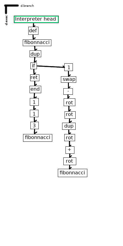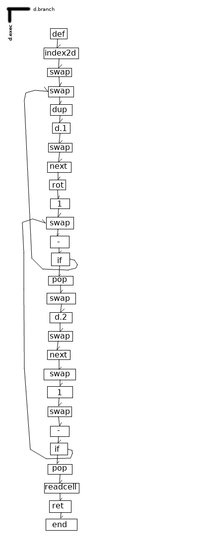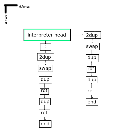 Function definitions hang off their names along ‘d.exec’. ‘d.branch’ points to the targets of conditional jumps.